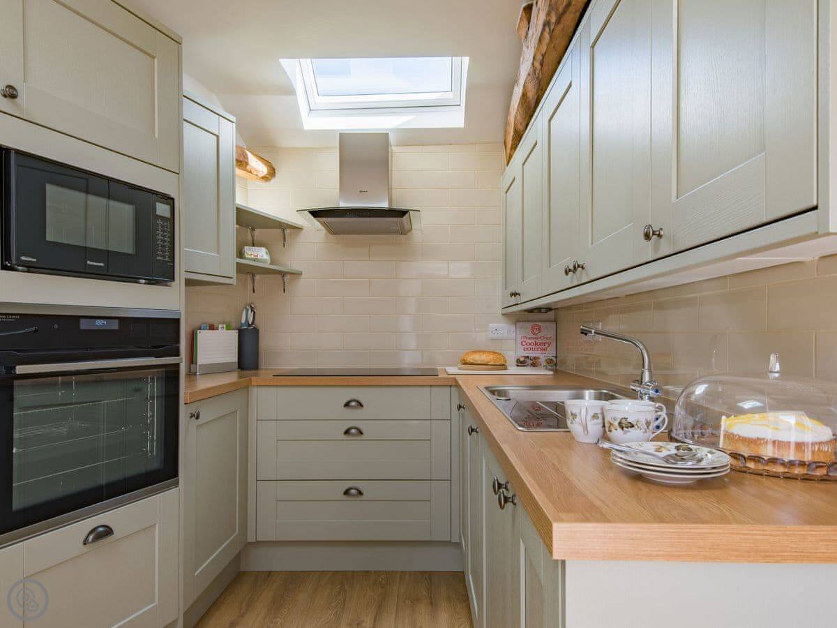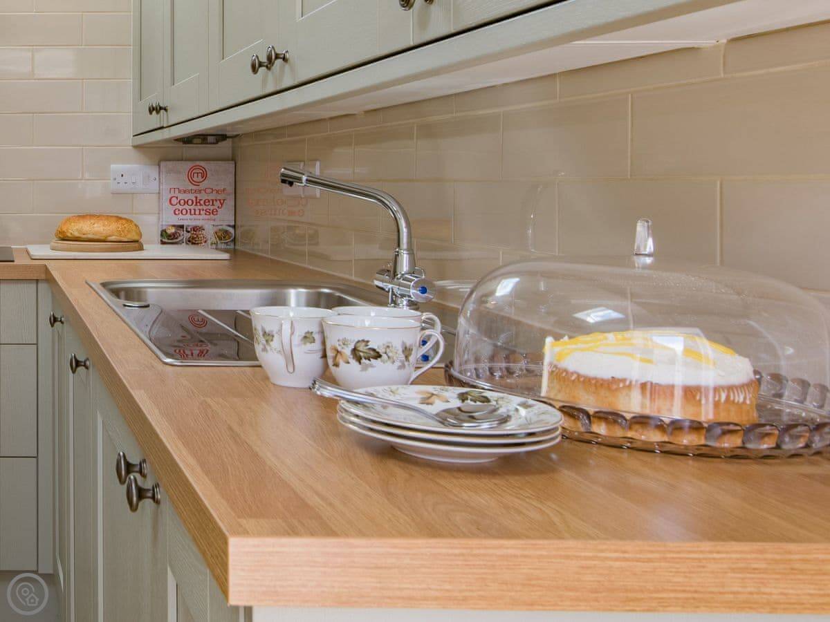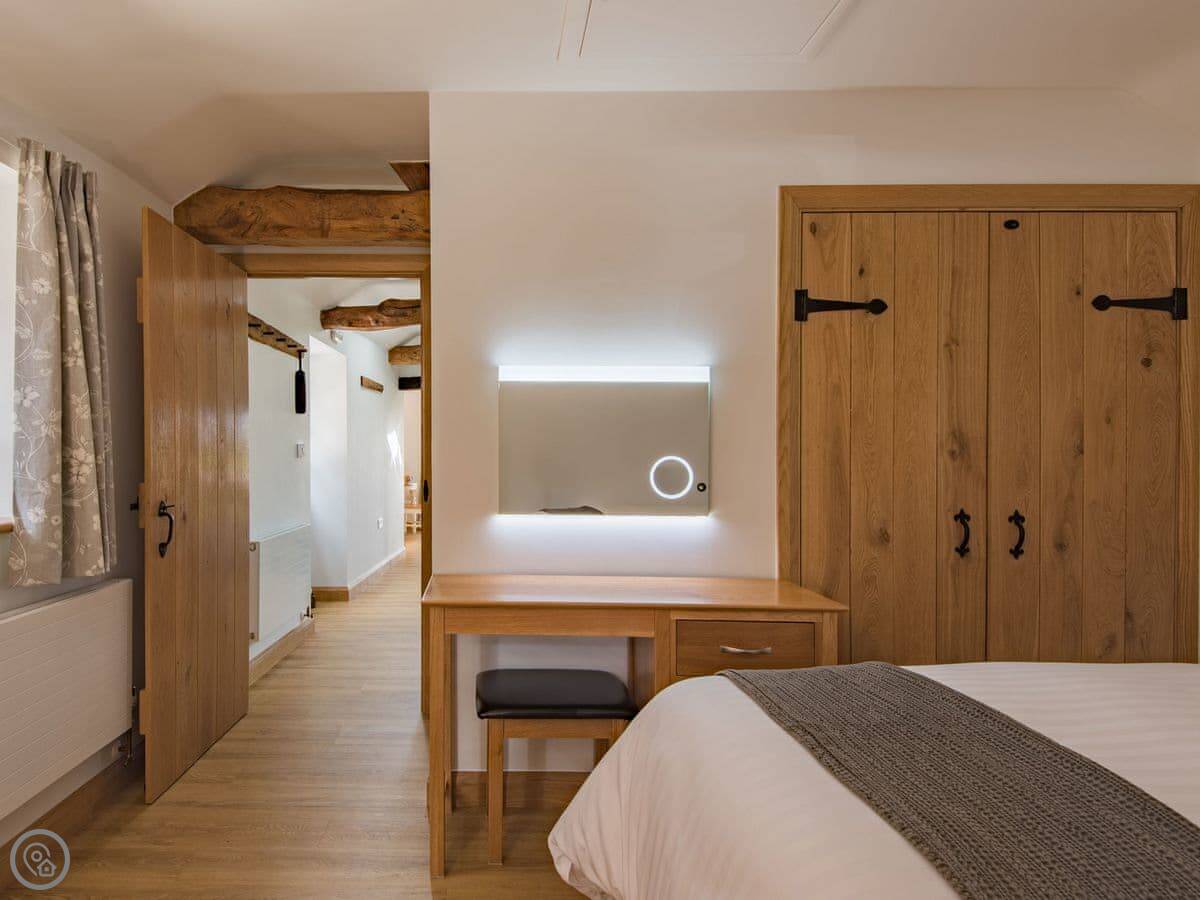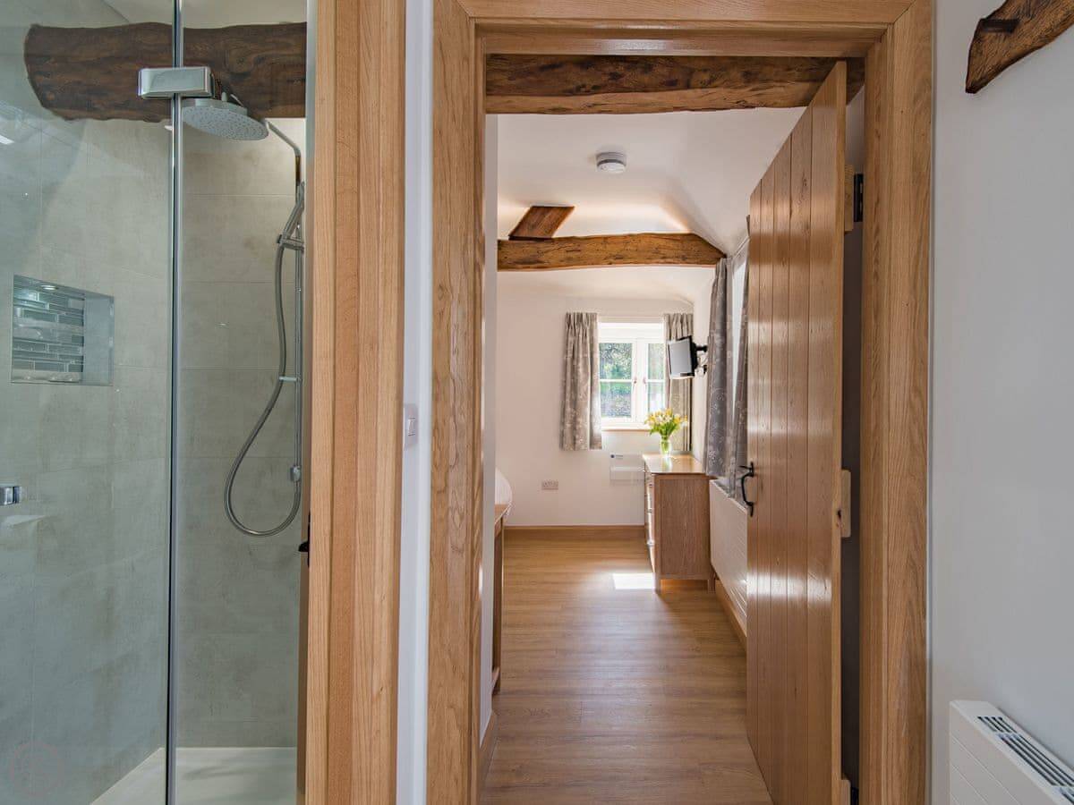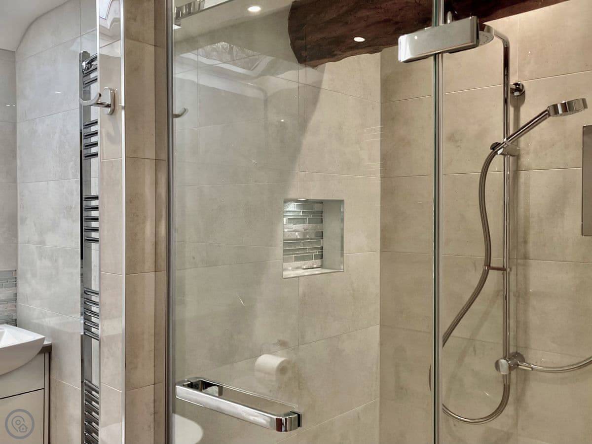 Outside, there's a terrace with a table and an enclosed courtyard area. The whole outside space is fenced, which is handy if you have children. The path around the cottage is gently sloping.