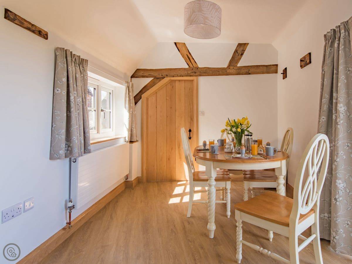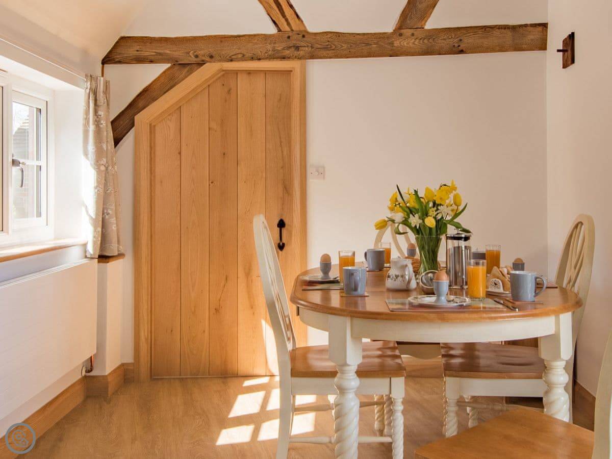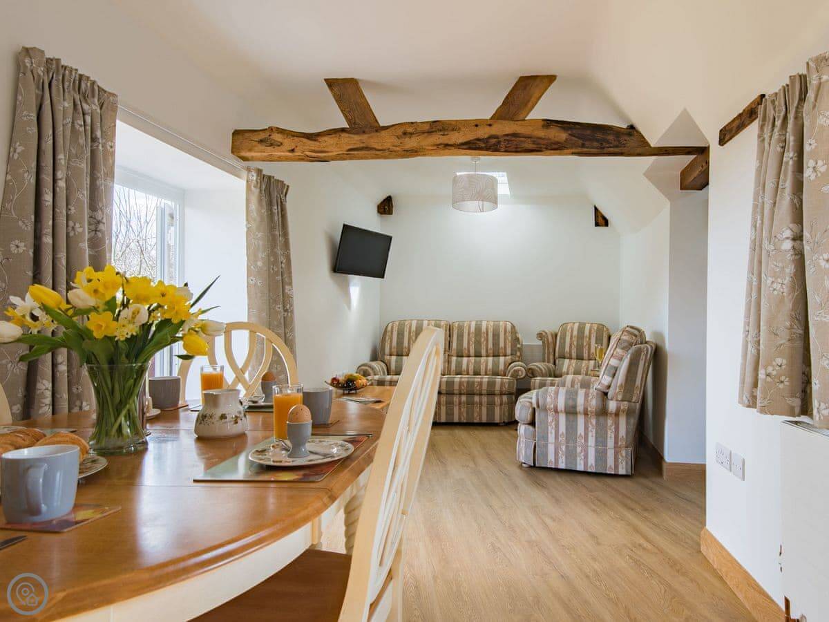 The main room is open plan. Kitchen at one end, dining area and sitting space at the other. The original oak beams are still there. French doors open onto the terrace. The second bedroom has a zip-link bed, so it can be a superking or two singles.