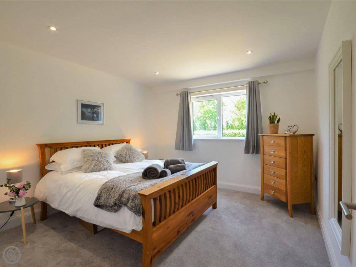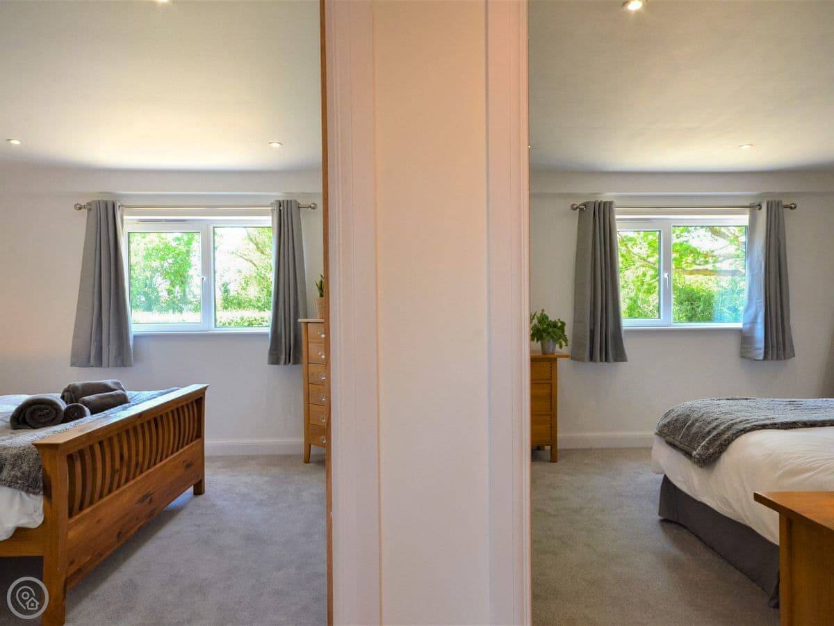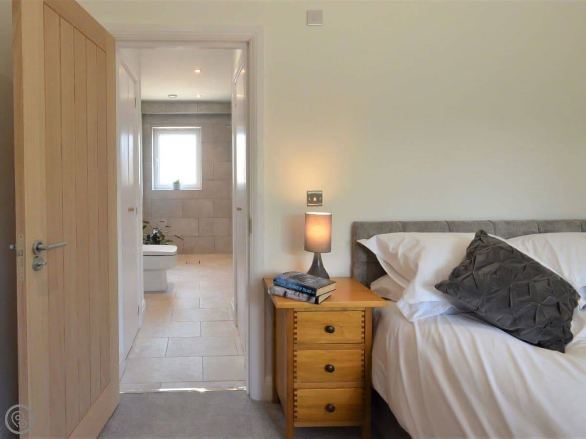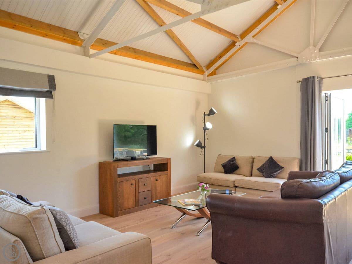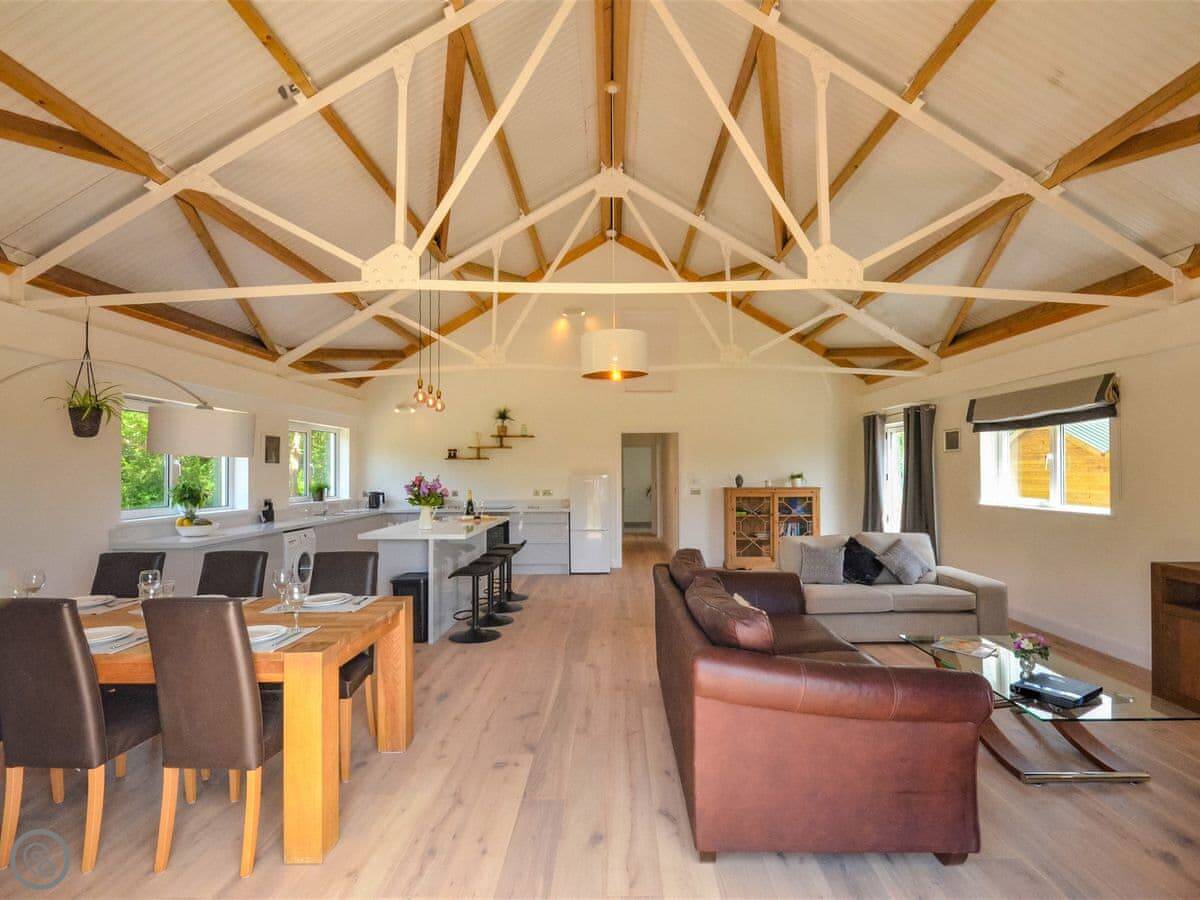 Stepping up from the drive onto the south-facing decking, bi-fold doors welcome you into this large holiday cottage. The huge open plan living allows space for the family to spread out with double-height ceilings revealing the fantastic oak and steel structure of the barn. The sleek glossy kitchen offers a full set of appliances with a long breakfast bar and plenty of space to move around. It is a central part of the room and allows for a jovial social atmosphere to make the most of this premium self-catering experience. Next to the kitchen area the dining table which has been cleverly arranged to the side under an arched floor lamp creating an intimate space for dinner parties and low-key celebrations with friends. To the opposite side the living area offers three large sofas centred around a Smart TV; a comfortable space to kick back and unwind with a film or board game. Underfloor heating throughout the barn ensures warmth and cosiness underfoot whatever the weather outside. Set along the hall from the open plan living space are the three bedrooms. The generous master features a kingsize bed, oak furniture, and a large modern wet room. Bedroom two, next door, also offers a kingsize bed and is another sanctuary for relaxation with the same close-up vista of hedgerows and trees from the window. On the other side of the hall bedroom three is configured ideally for the kids with a single bed and additional pull-out which is more suitable for a child.