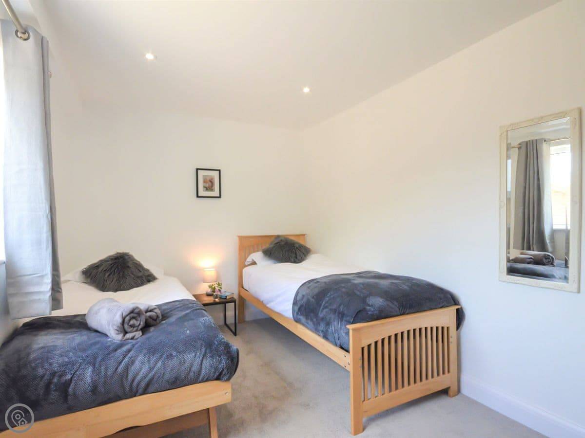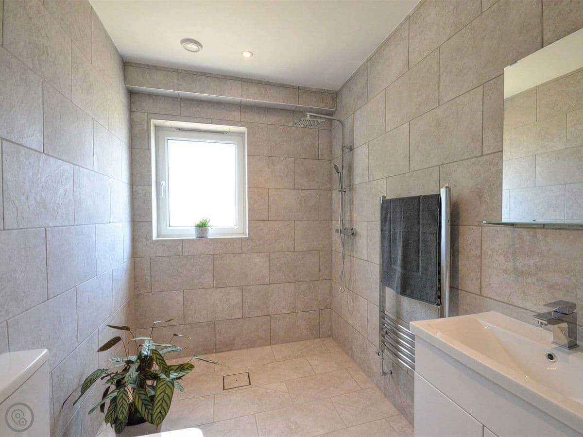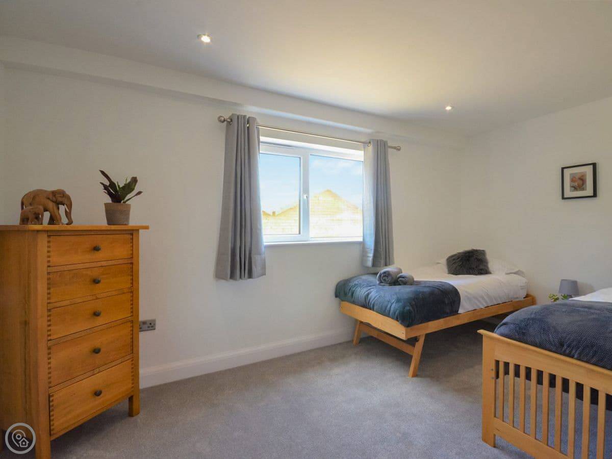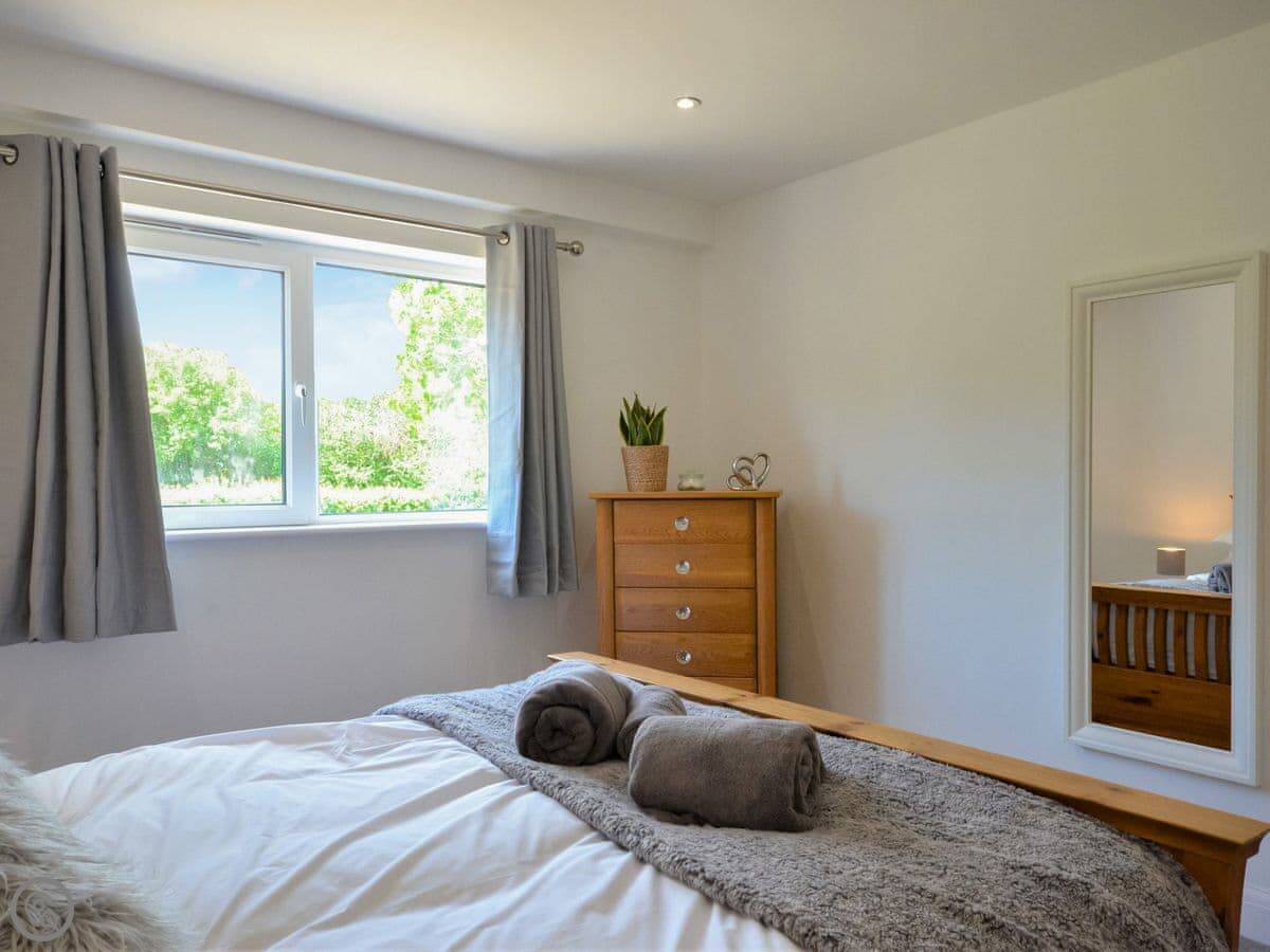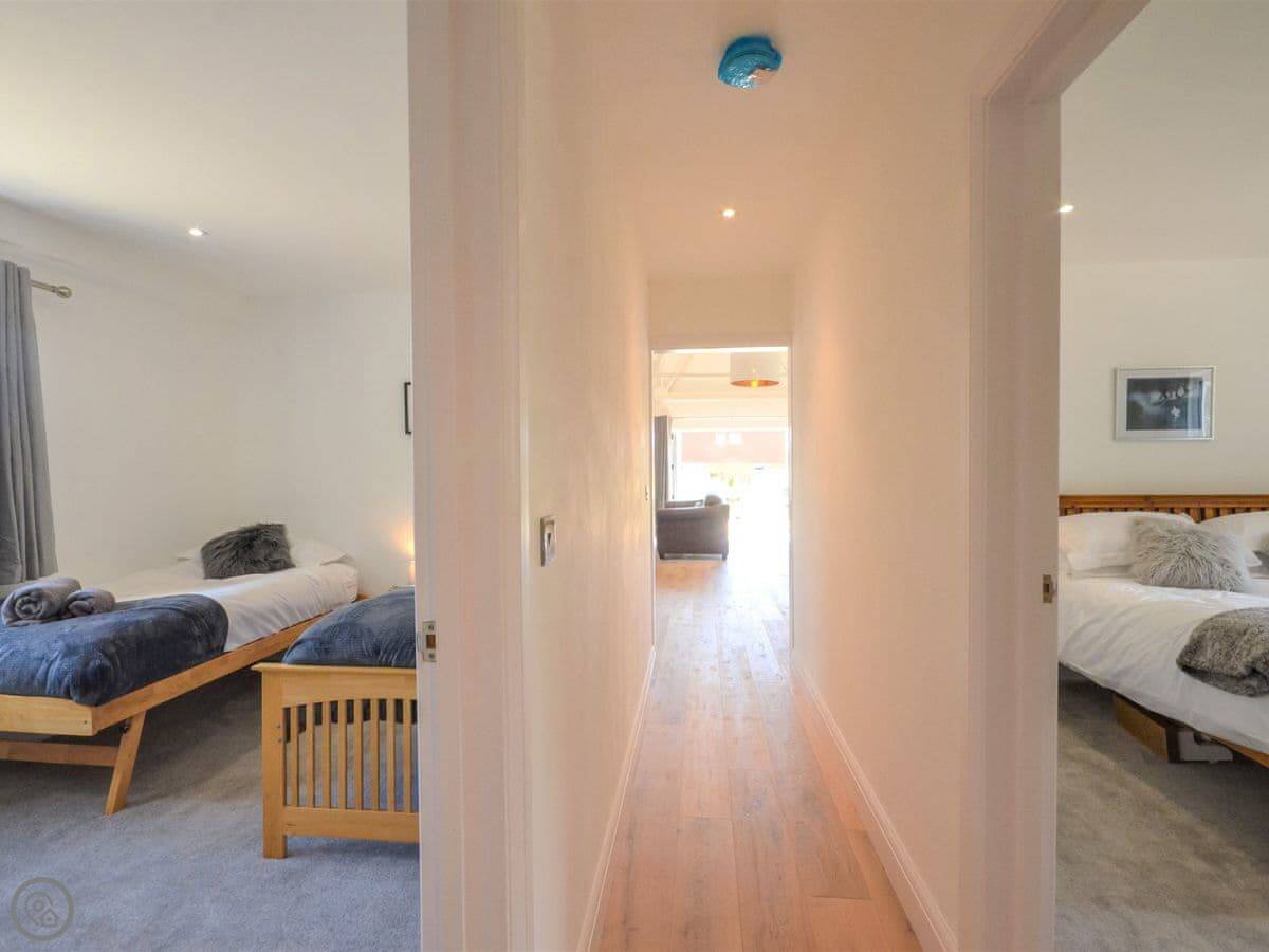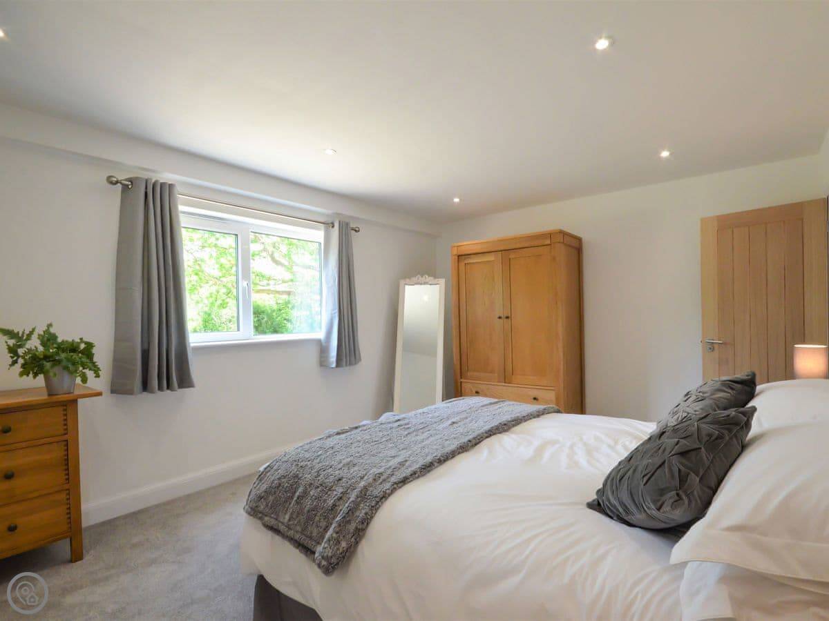 Stepping up from the drive onto the south-facing decking, bi-fold doors welcome you into this large holiday cottage. The huge open plan living allows space for the family to spread out with double-height ceilings revealing the fantastic oak and steel structure of the barn. The sleek glossy kitchen offers a full set of appliances with a long breakfast bar and plenty of space to move around. It is a central part of the room and allows for a jovial social atmosphere to make the most of this premium self-catering experience. Next to the kitchen area the dining table which has been cleverly arranged to the side under an arched floor lamp creating an intimate space for dinner parties and low-key celebrations with friends. To the opposite side the living area offers three large sofas centred around a Smart TV; a comfortable space to kick back and unwind with a film or board game. Underfloor heating throughout the barn ensures warmth and cosiness underfoot whatever the weather outside. Set along the hall from the open plan living space are the three bedrooms. The generous master features a kingsize bed, oak furniture, and a large modern wet room. Bedroom two, next door, also offers a kingsize bed and is another sanctuary for relaxation with the same close-up vista of hedgerows and trees from the window. On the other side of the hall bedroom three is configured ideally for the kids with a single bed and additional pull-out which is more suitable for a child.