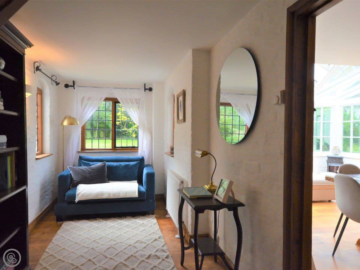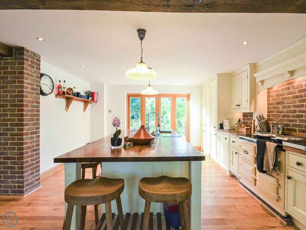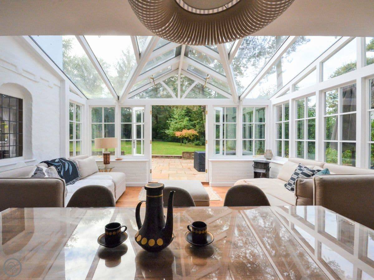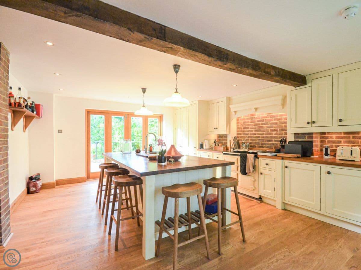 The house is big. There's a main sitting room and then another living room that leads into the kitchen. The kitchen has a big island with an Aga. There's also an orangery with a dining table and sofas that looks out to the garden. It gets the evening sun.