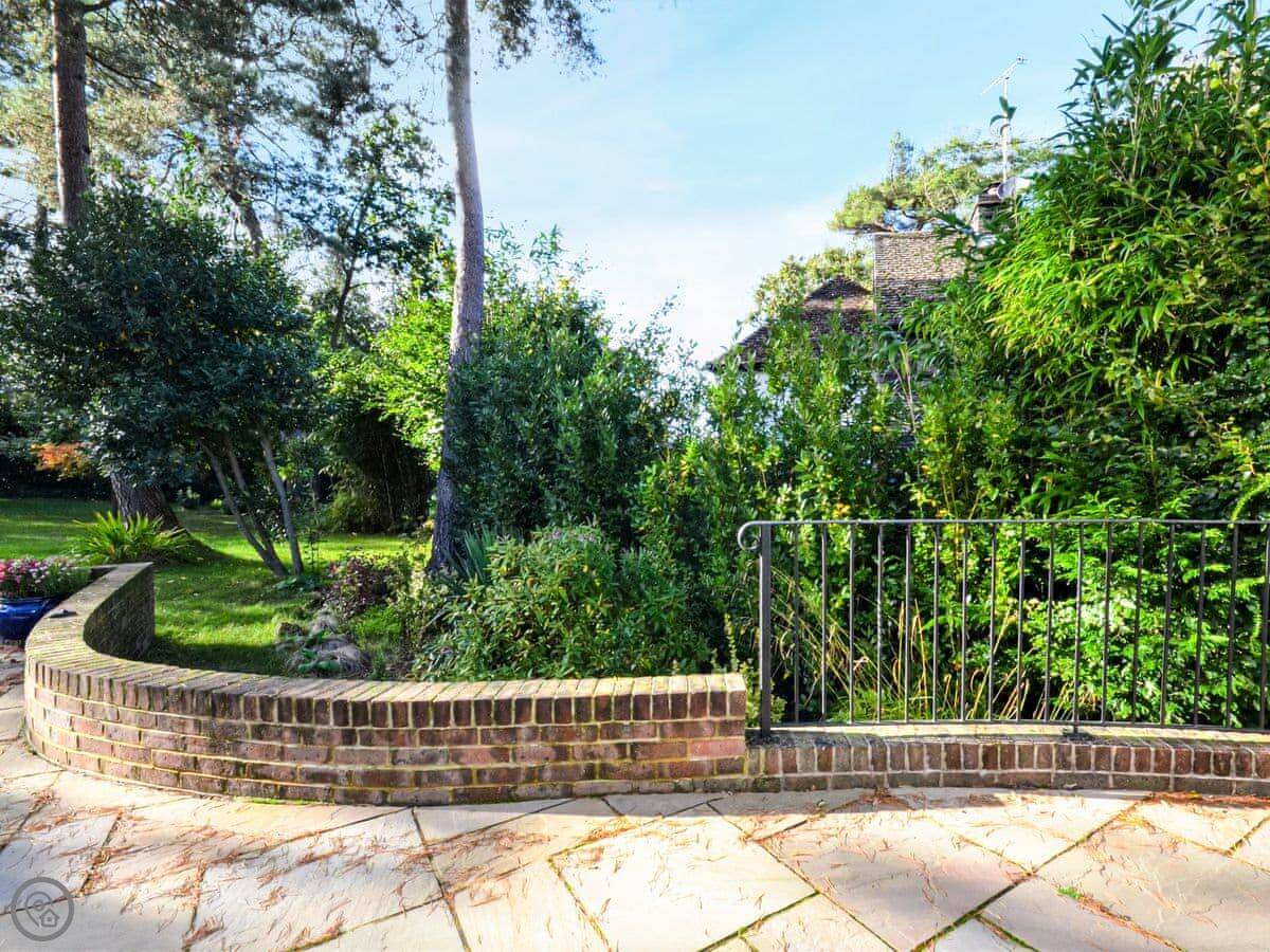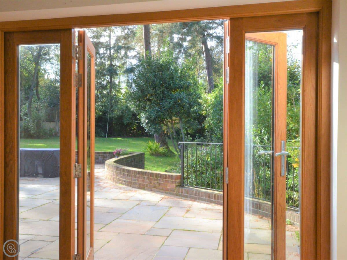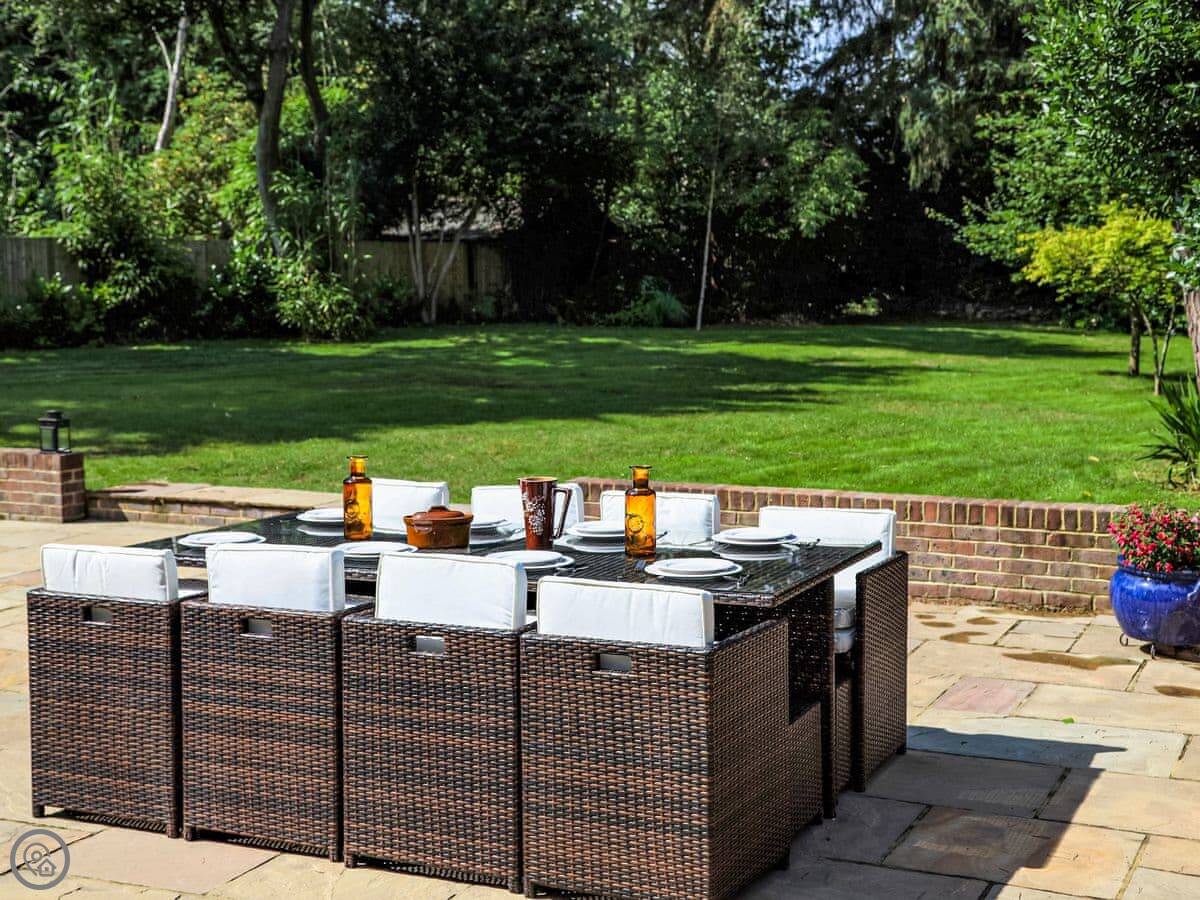 Outside, there's a car port with a table tennis table and a lawn at the front. At the back, there's a large patio and then a big, enclosed garden with trees around the edge. It's secure. You can bring one dog.