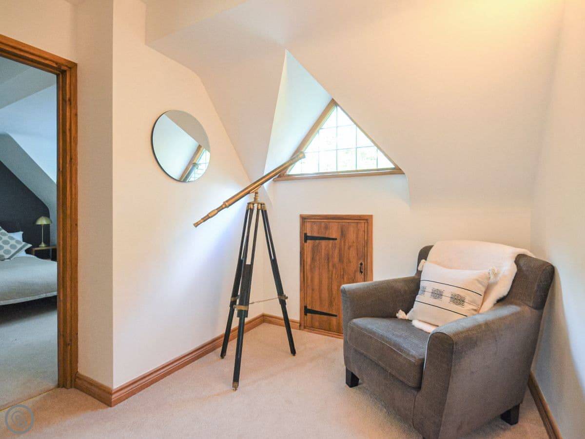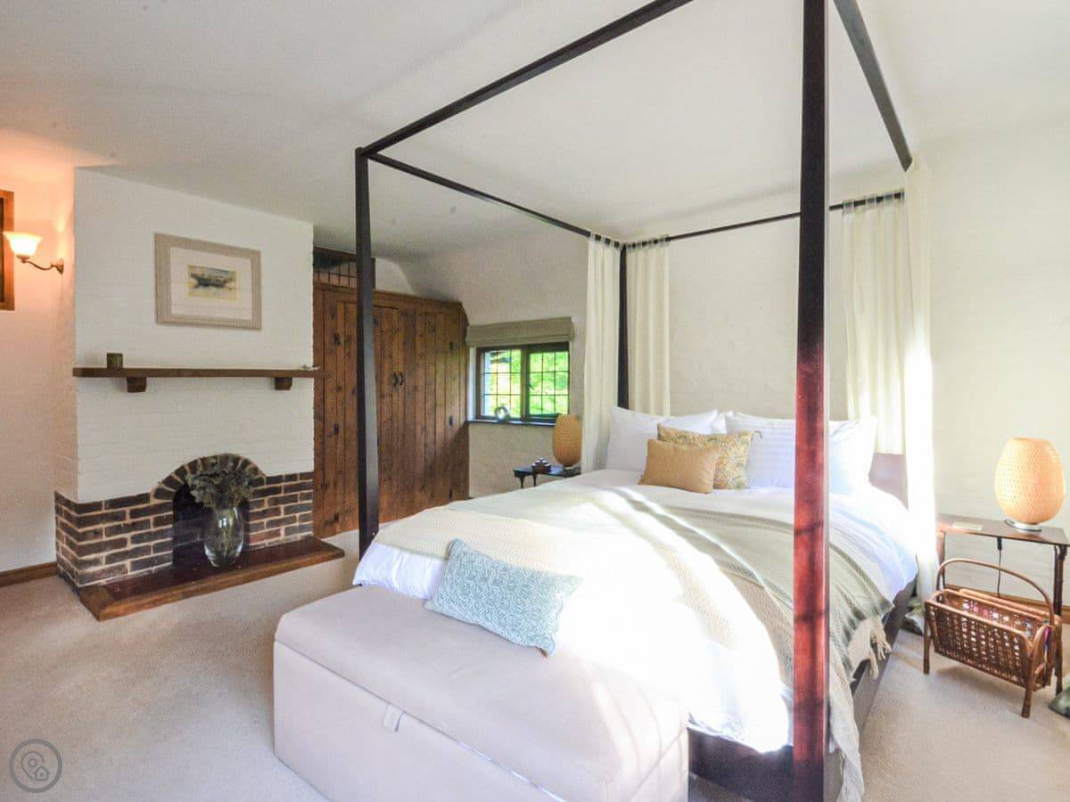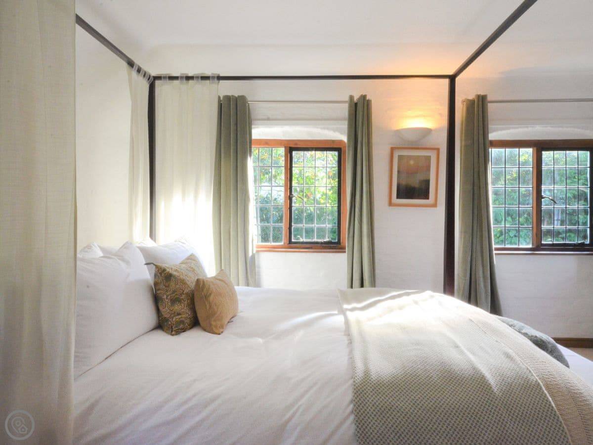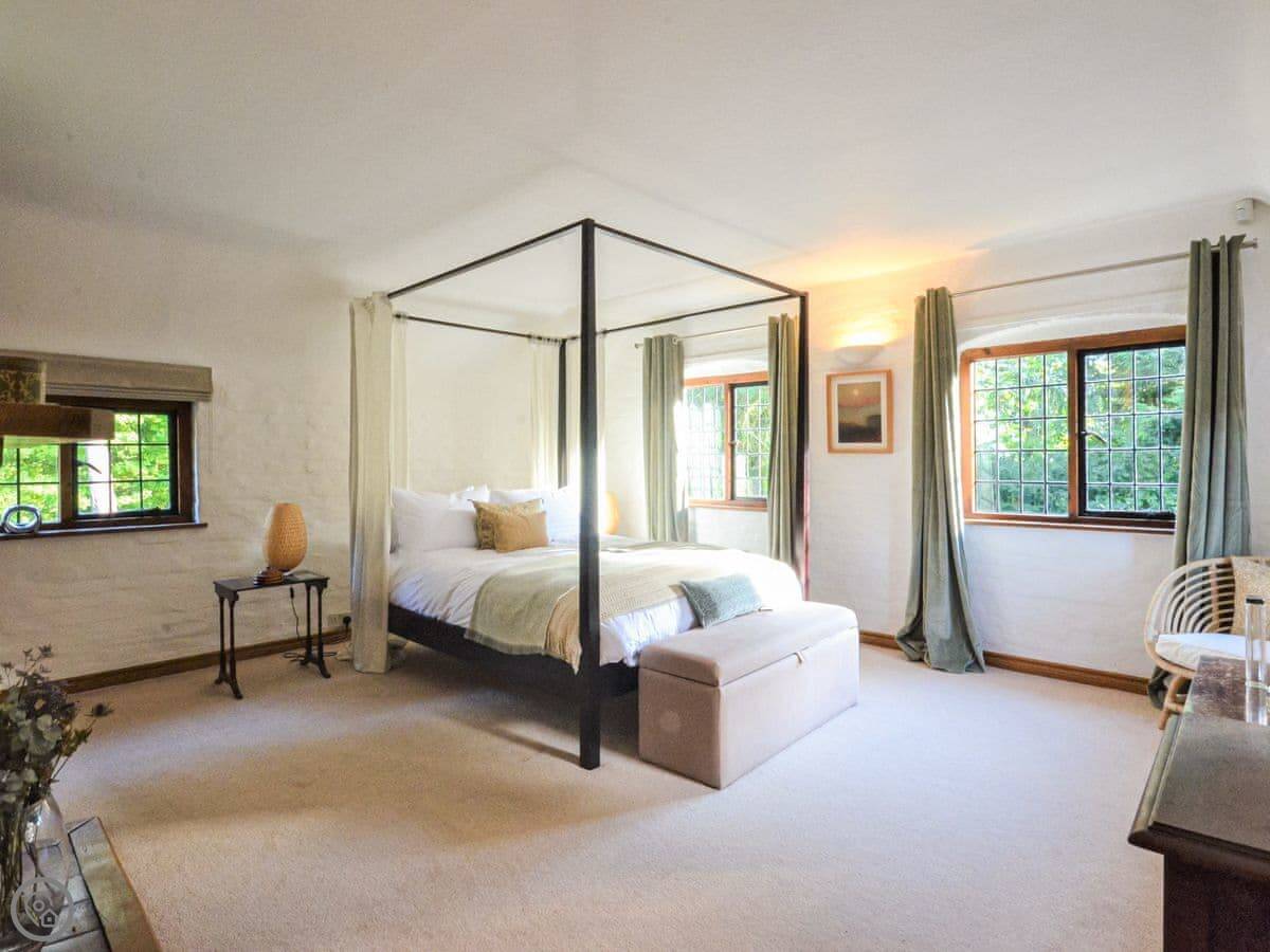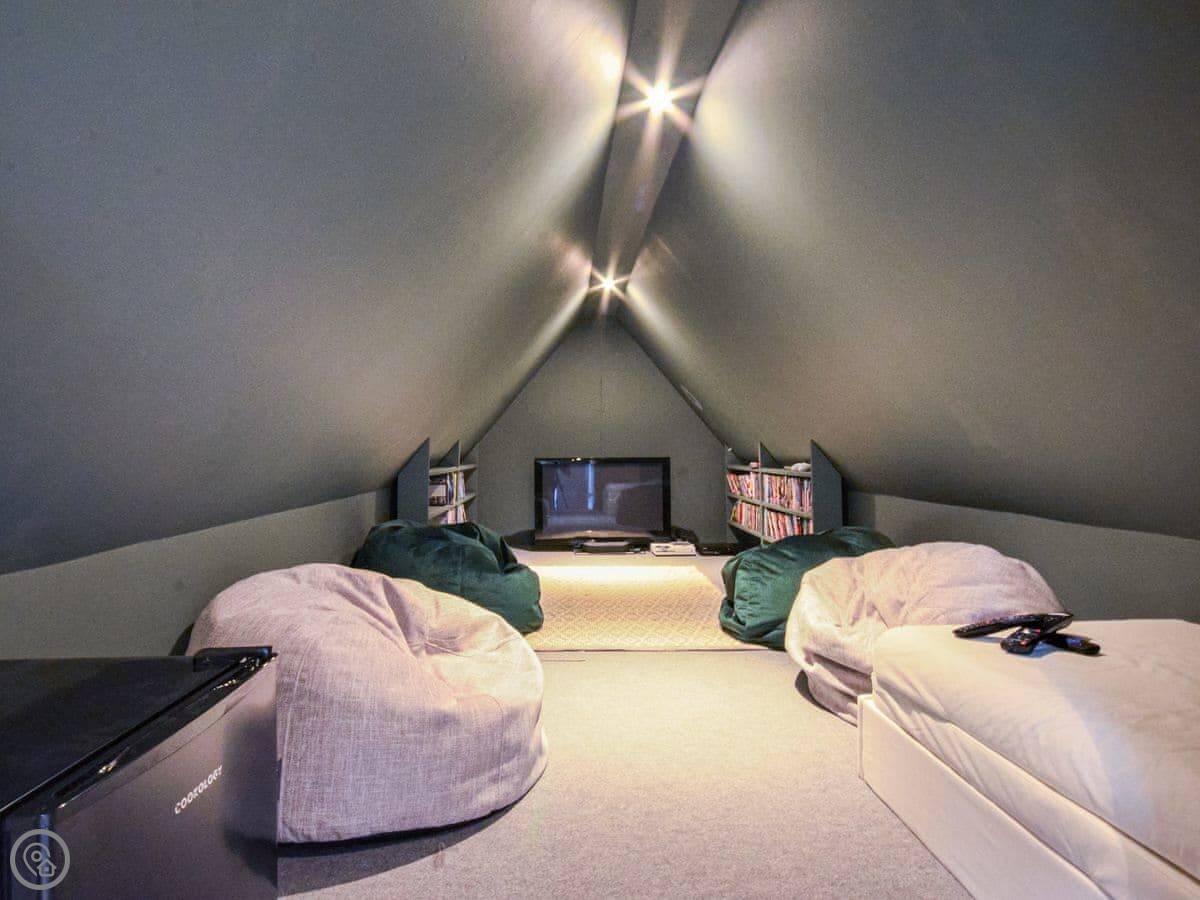 Upstairs, the main bedroom has a four-poster bed. There's another double bedroom and two more bedrooms with beds that can be set up as doubles or twins if you let us know. There's a study on this floor too. Then there's a second floor with a TV and games den. It's a good spot for kids to be on their own.