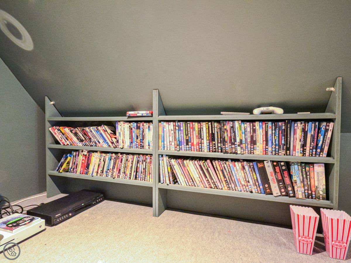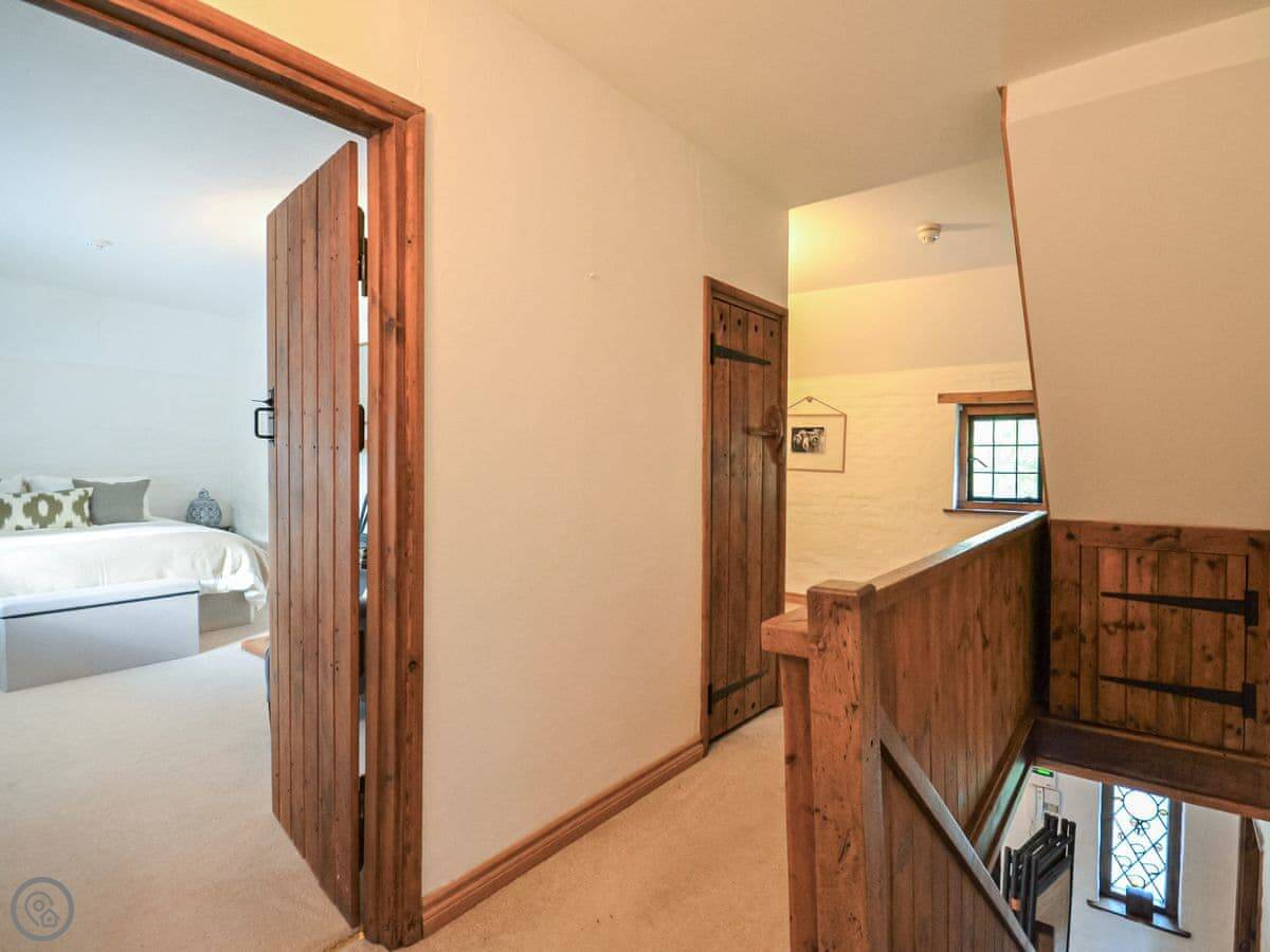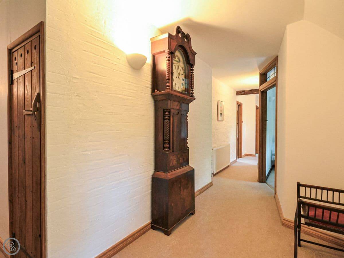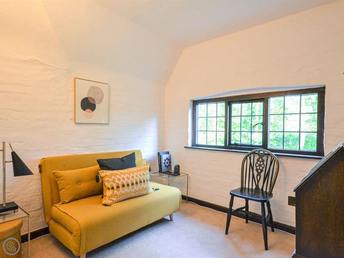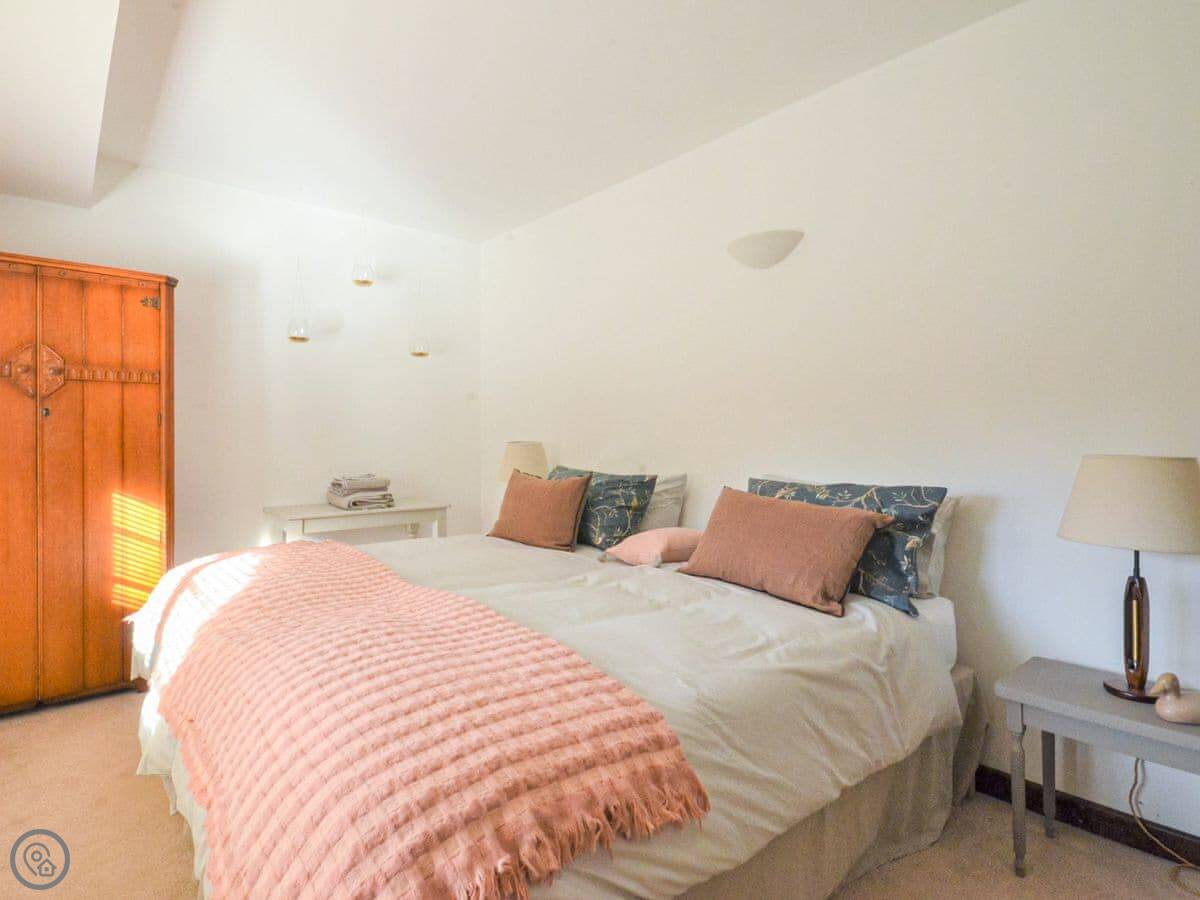 Upstairs, the main bedroom has a four-poster bed. There's another double bedroom and two more bedrooms with beds that can be set up as doubles or twins if you let us know. There's a study on this floor too. Then there's a second floor with a TV and games den. It's a good spot for kids to be on their own.