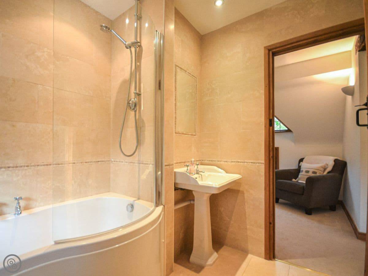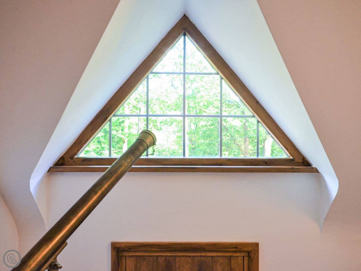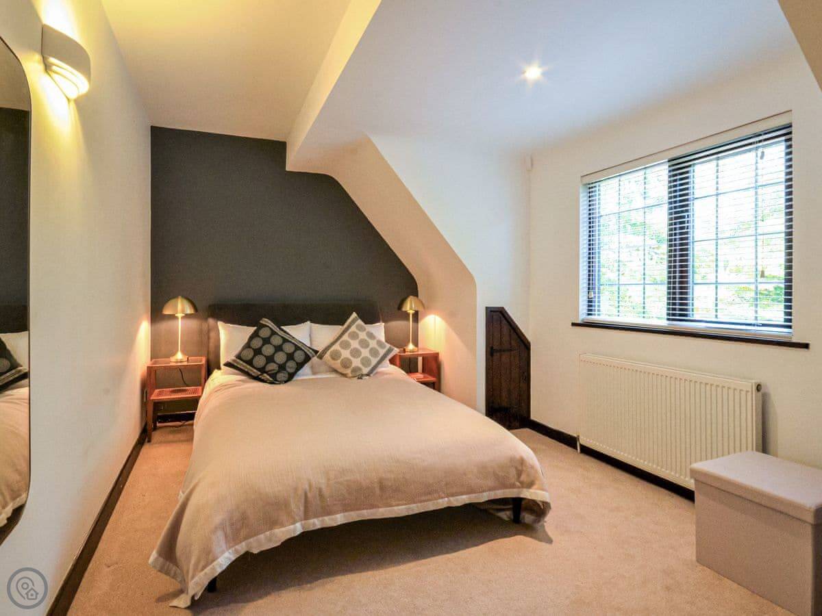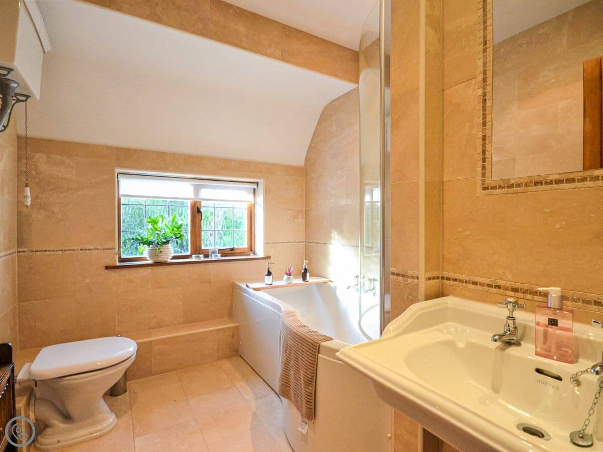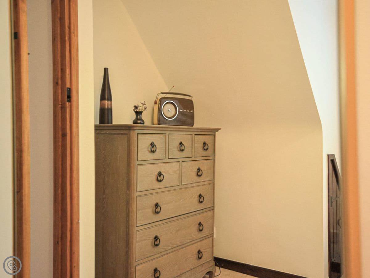 Upstairs, the main bedroom has a four-poster bed. There's another double bedroom and two more bedrooms with beds that can be set up as doubles or twins if you let us know. There's a study on this floor too. Then there's a second floor with a TV and games den. It's a good spot for kids to be on their own.