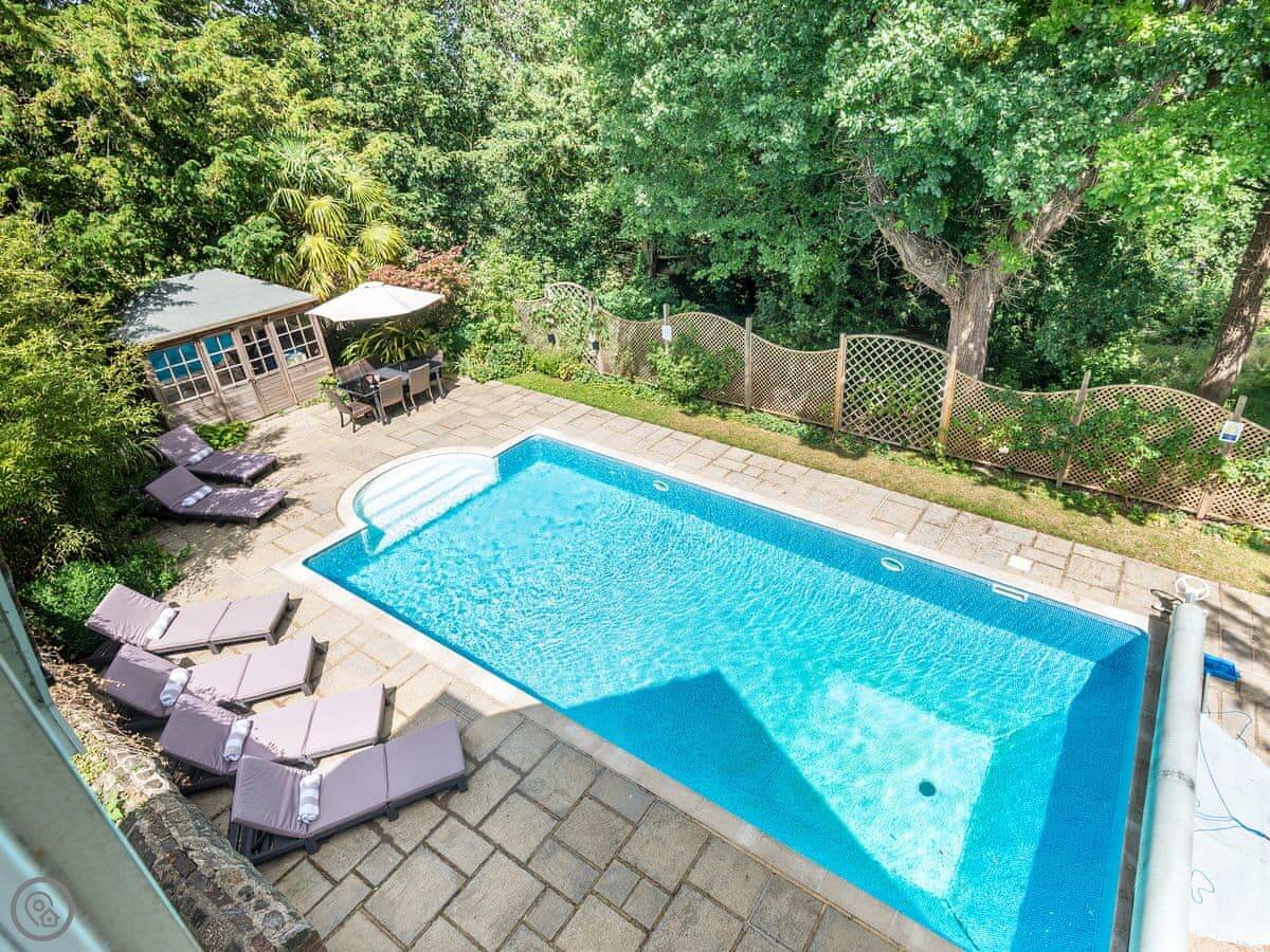 The Poolhouse sits in the spacious grounds of its owners’ house adjacent to the swimming pool which is available for use from the Whitsun weekend in May to early September. This home was formerly a pool house and has now been reconfigured to create a wonderful holiday home. Work has been carried out to the very highest standards to create a contemporary open plan living space. You enter the house through glazed double doors directly into the living area. The kitchen is well-equipped and there is a comfortable seating area with comfy sofas for those relaxing evenings indoors. The whole living space is modern and bright, flooded with light from windows on two sides. Also on the ground floor is an en-suite bedroom, furnished in cool, crisp, contemporary style and covered in luxurious bed linen to snuggle up in. This bedroom has French windows opening onto a small raised veranda with steps down to the pool area. This is the access to the garden from the house, as the pool area will be for the exclusive use of guests. On the first floor are two en-suite bedrooms, one with kingsize bed and one with double bed. These two bedrooms are crisp and contemporary with the same standard of luxurious bed linens as the one downstairs. The beds look so inviting you might want to settle down for a quick snooze as soon as you see them. Outside in the garden by the pool there are loungers for post swim relaxation, and a table and chairs for al fresco dining. The garden around the pool is only available while the pool is open for guests.
