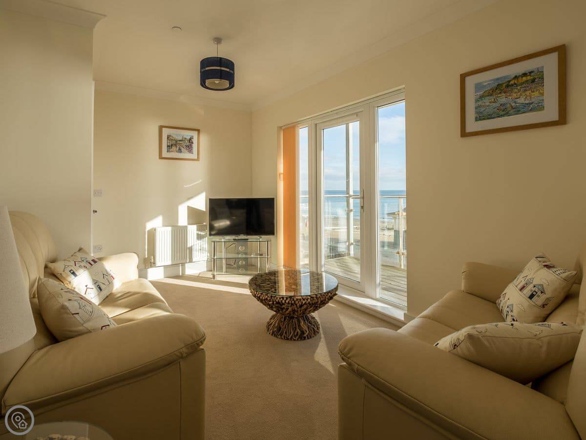 The living area is open plan. There's a balcony that looks out over the sea. You get a good view.