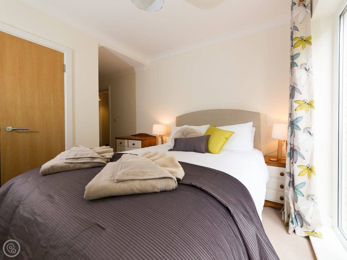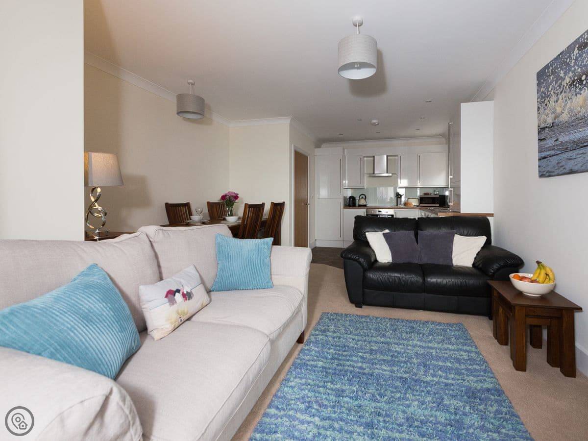 It sleeps four people in two bedrooms. One has a king-size bed with its own bathroom attached. The other has two single beds and uses the main bathroom. The living room, kitchen, and dining area are all one open space. There’s a balcony you can step out onto from the living room. You get a decent view of the beach and the sea.