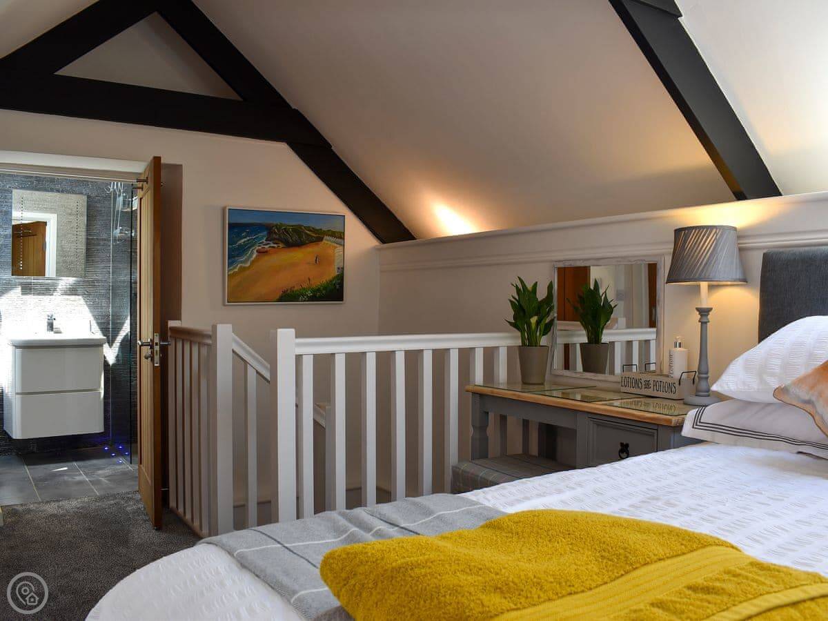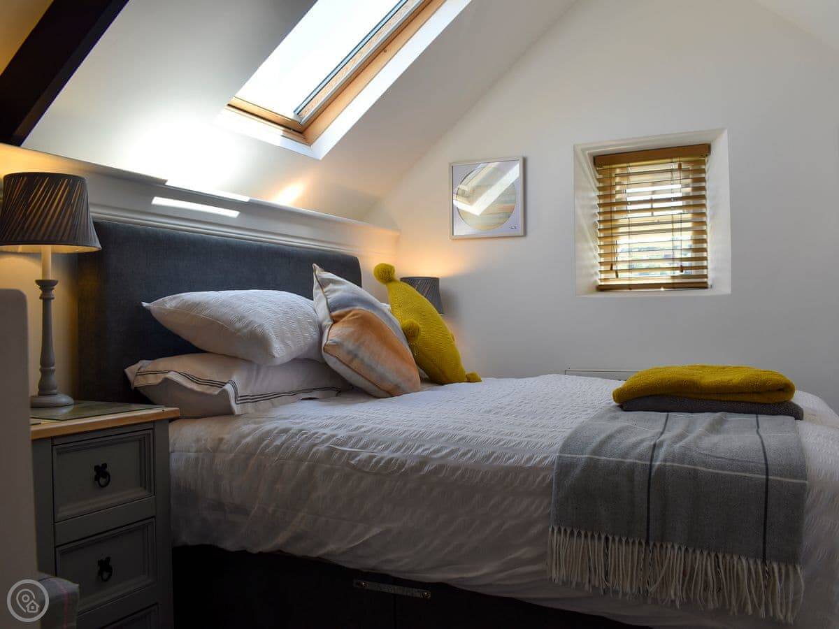 It sleeps four. There are two bedrooms. One is on the ground floor with twin beds. The other is upstairs with a kingsize bed. The bathroom is upstairs too. The stairs are open-tread and quite steep, so they're not ideal for unsteady guests.