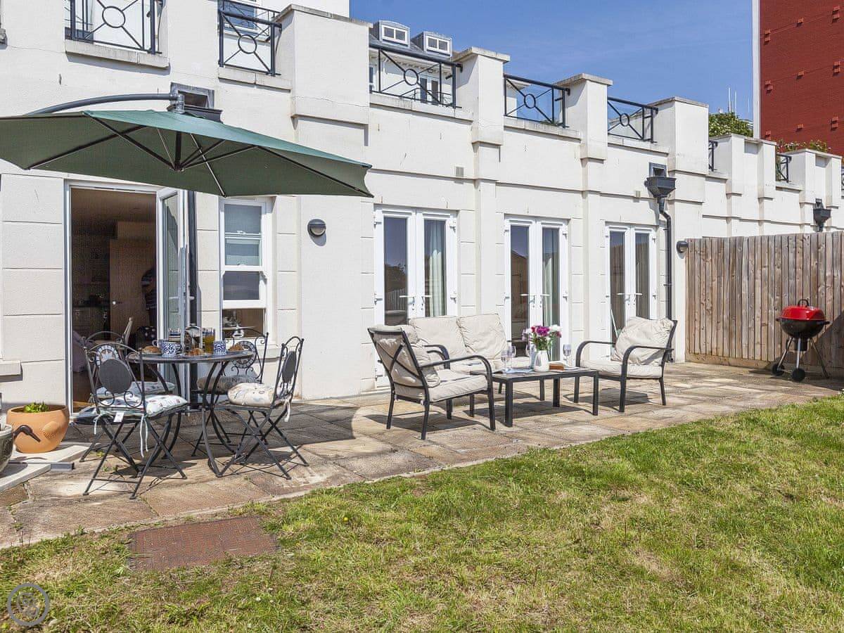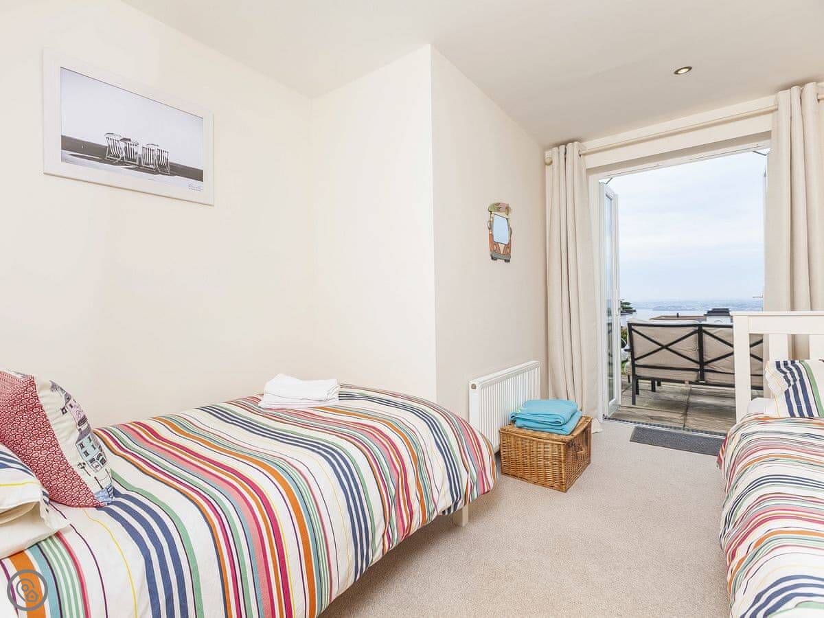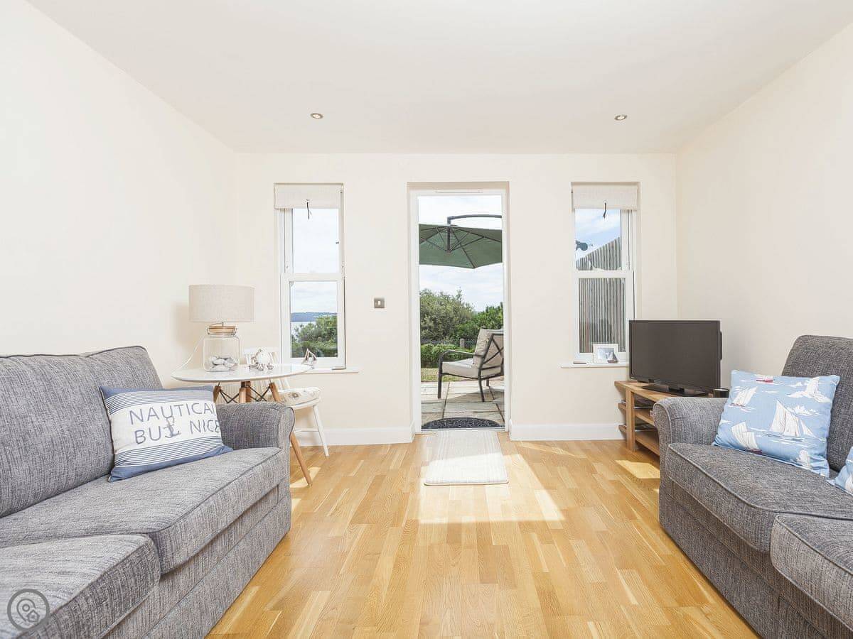 The living room has these big folding doors that open right up. They lead out to a enclosed garden with a little lawn and a patio. You can sit out there with a drink and just watch the boats. The main bedroom has French doors too, so you get the view from there as well.