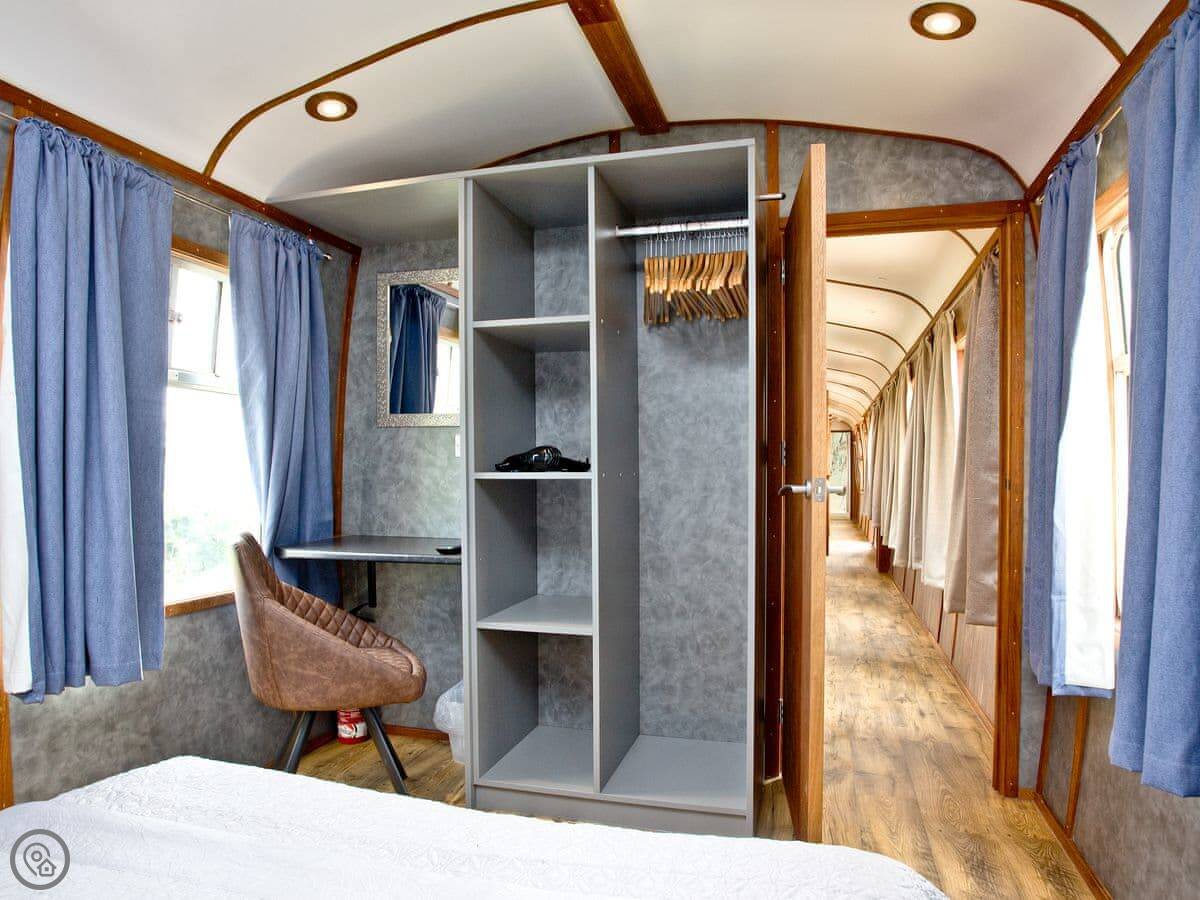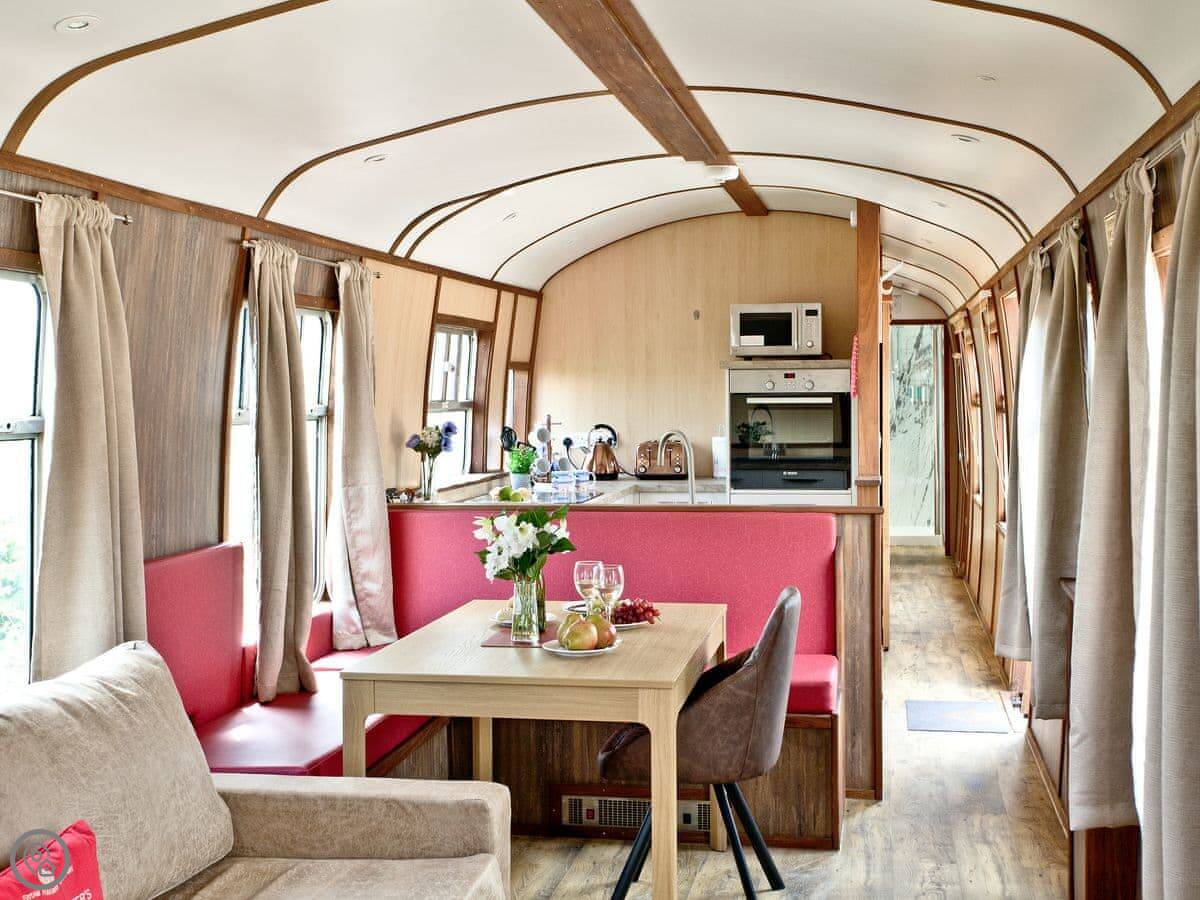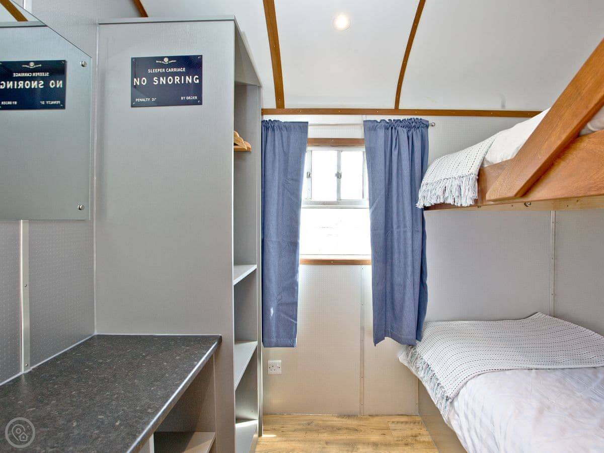 This is Brunel Boutique Railway Carriage 3, in Dawlish Warren. It's a detached railway carriage that's been done up to sleep six. You've got three bedrooms, two are proper doubles and one is a bunk room. There's one bathroom, with a shower.