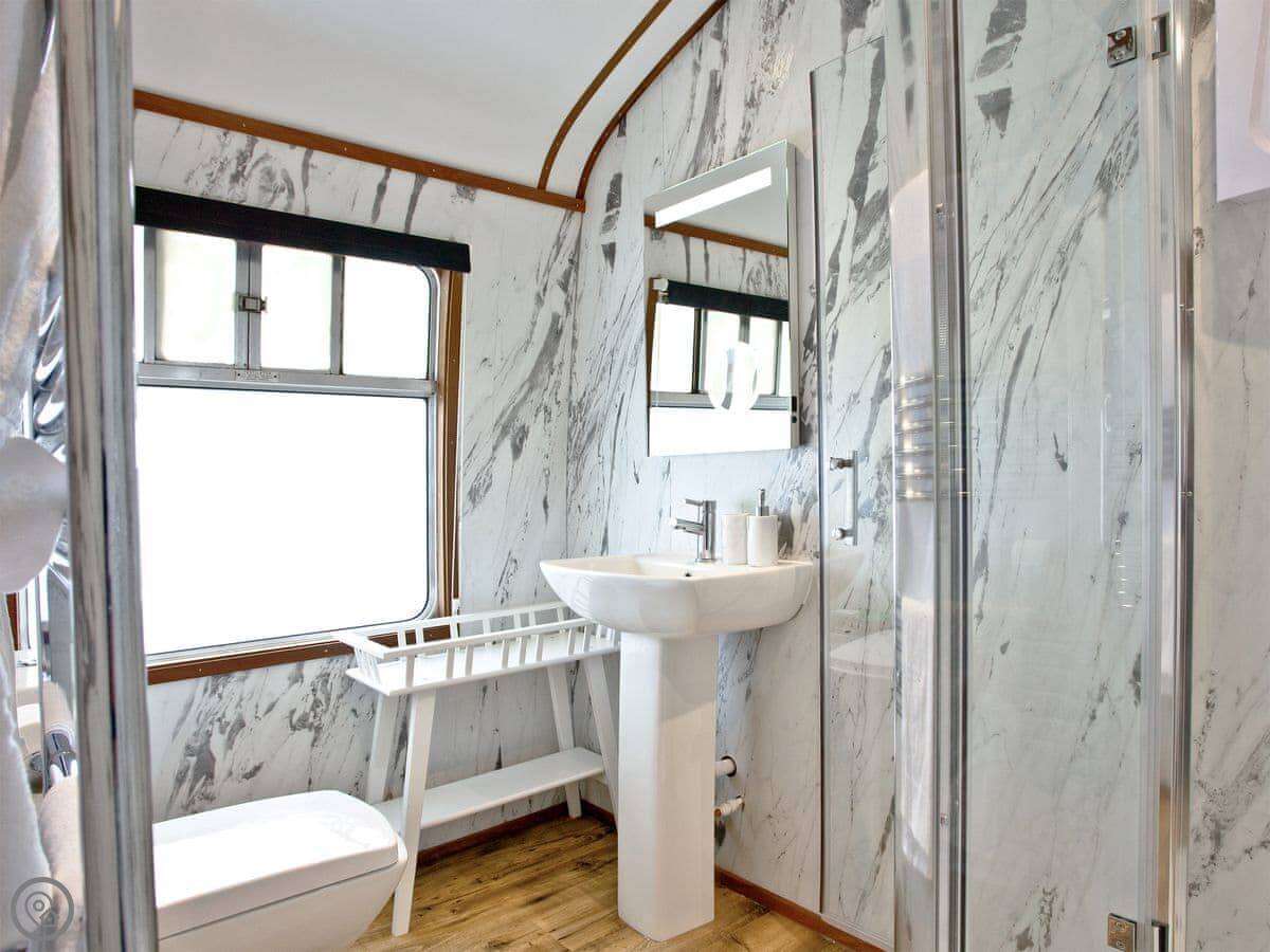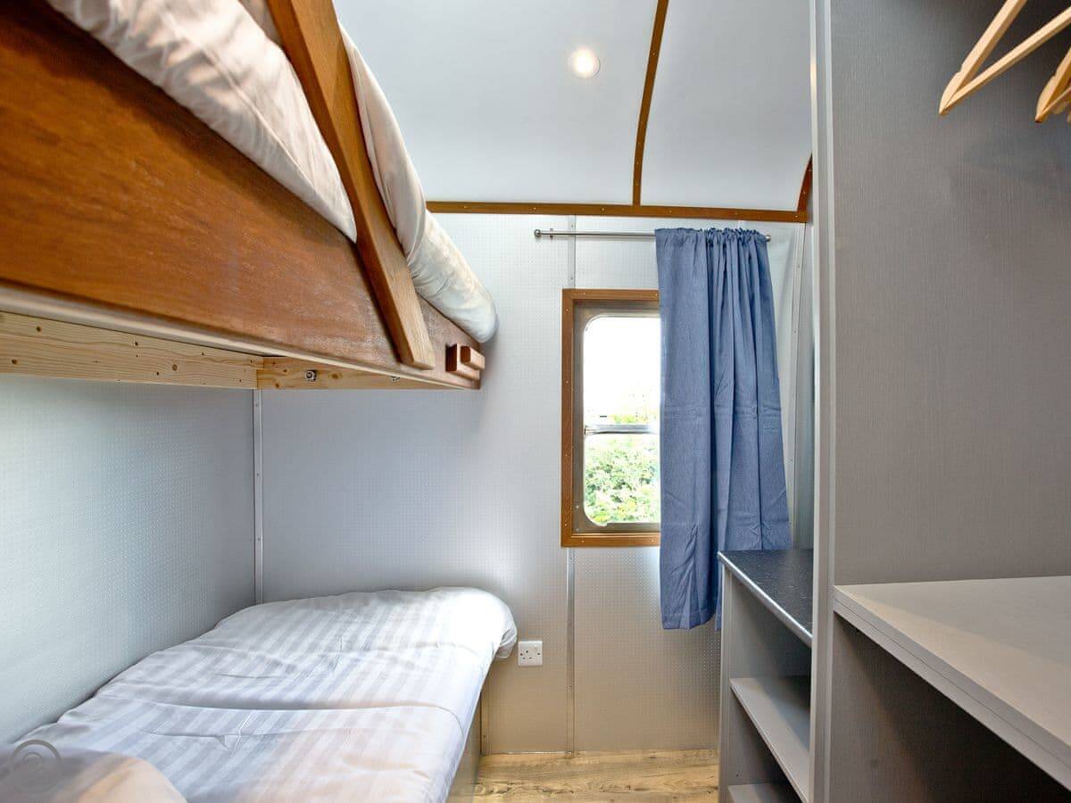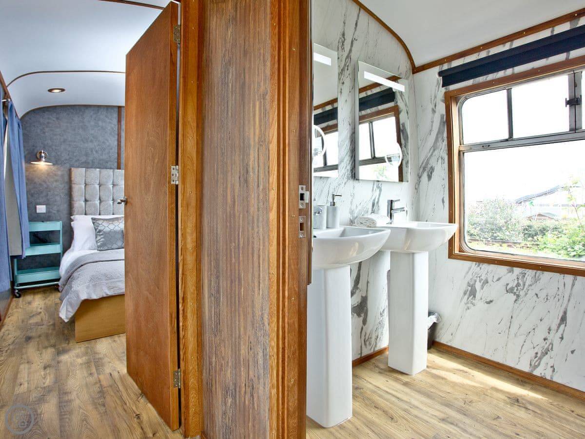 This is Brunel Boutique Railway Carriage 3, in Dawlish Warren. It's a detached railway carriage that's been done up to sleep six. You've got three bedrooms, two are proper doubles and one is a bunk room. There's one bathroom, with a shower.