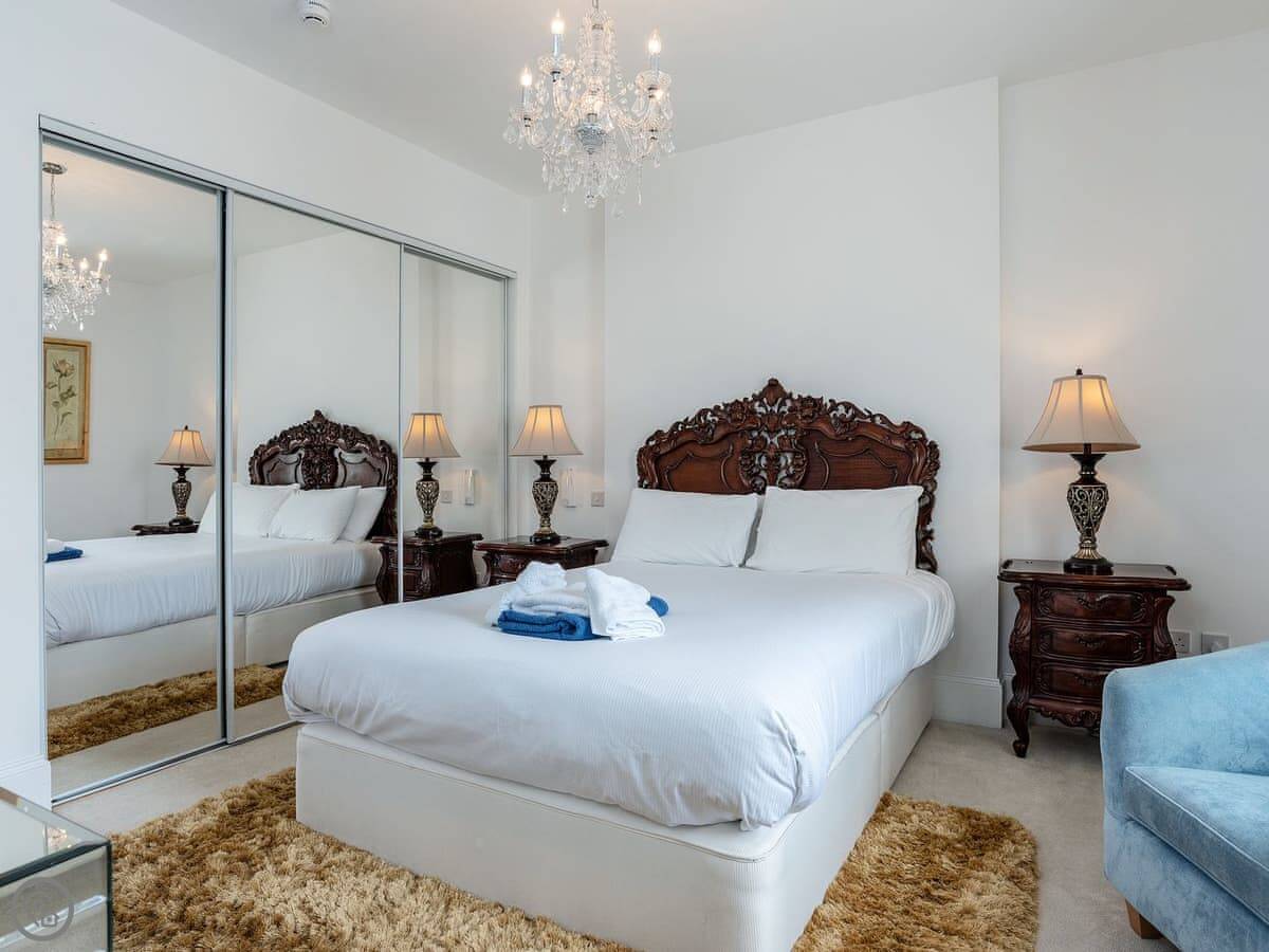 It sleeps two. One bedroom with a kingsize bed, and an en suite bathroom with a bath that has a shower over it. The mirrors in the bedroom are full length, which is handy. The place has a 4 Star rating, so it's comfortable and everything's in good order.