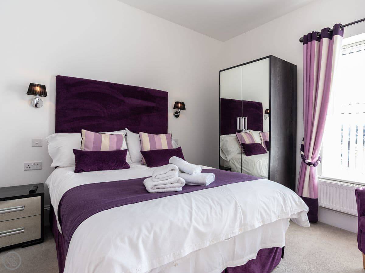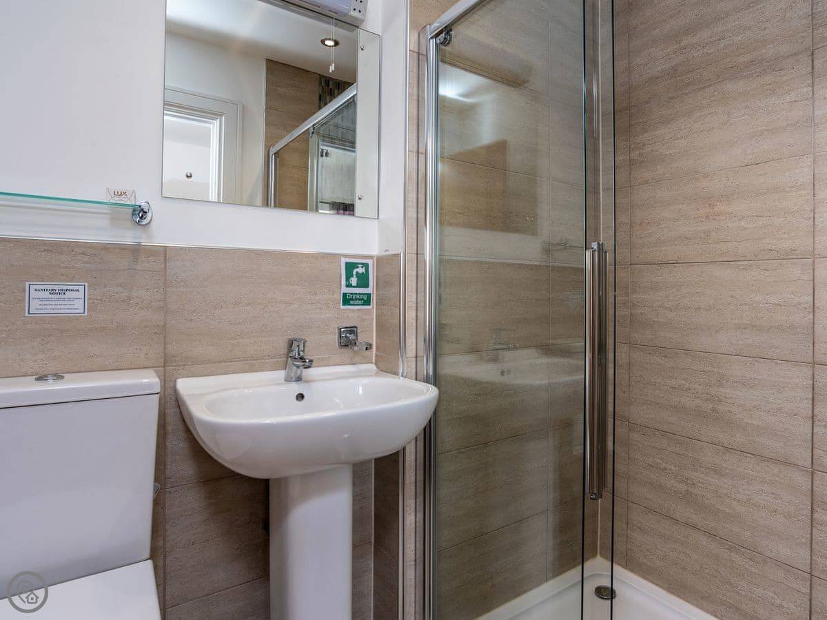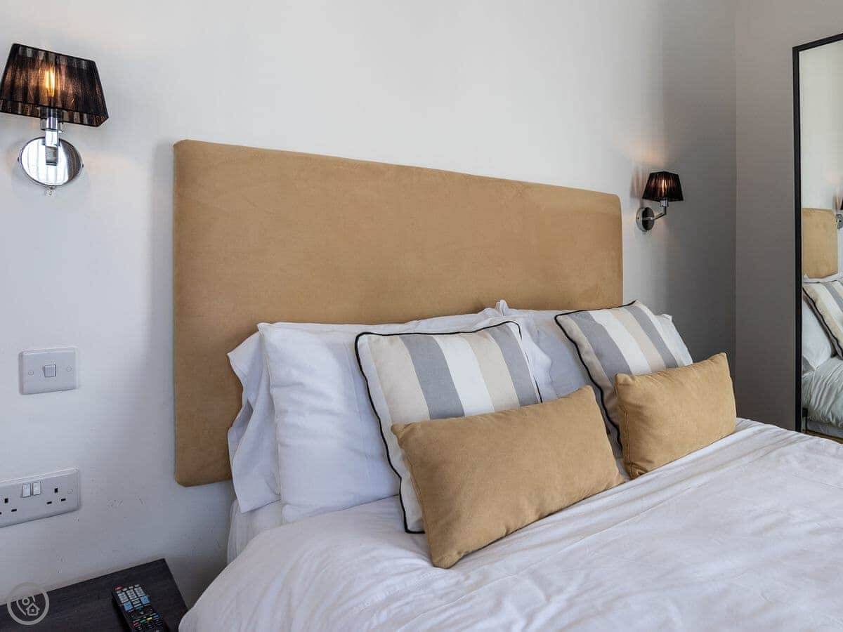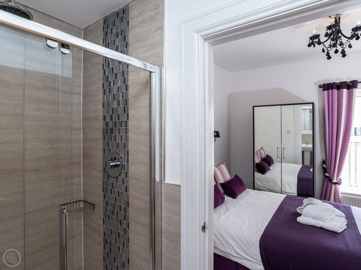It sleeps four people in two double bedrooms. Each bedroom has its own en-suite shower room, so it works well for two couples or a family. The living area is open plan with the kitchen. It's all done in neutral colours.
