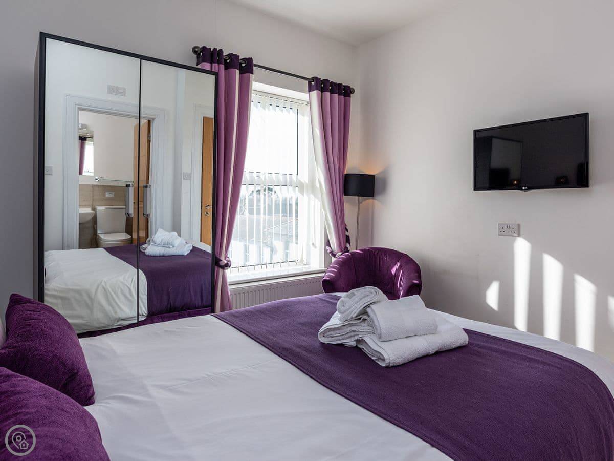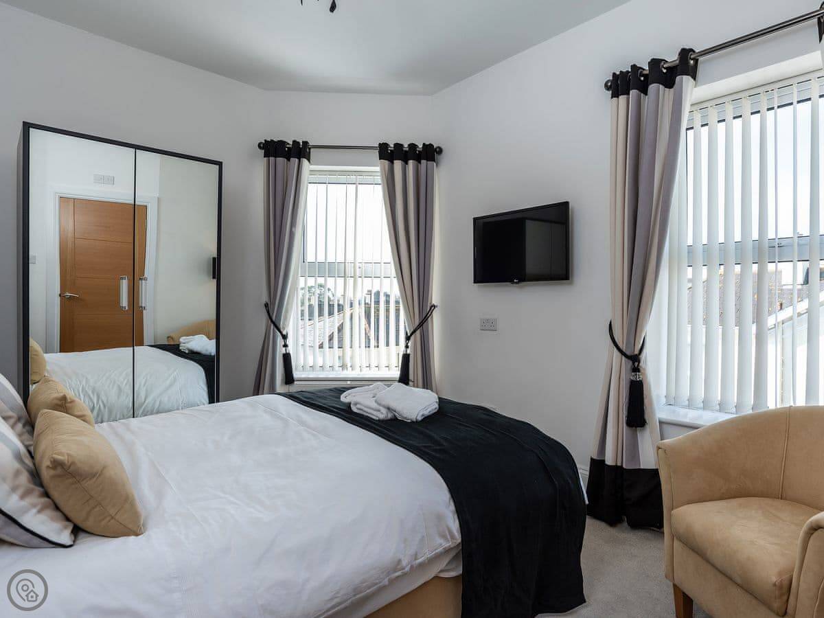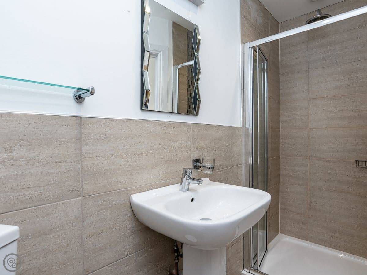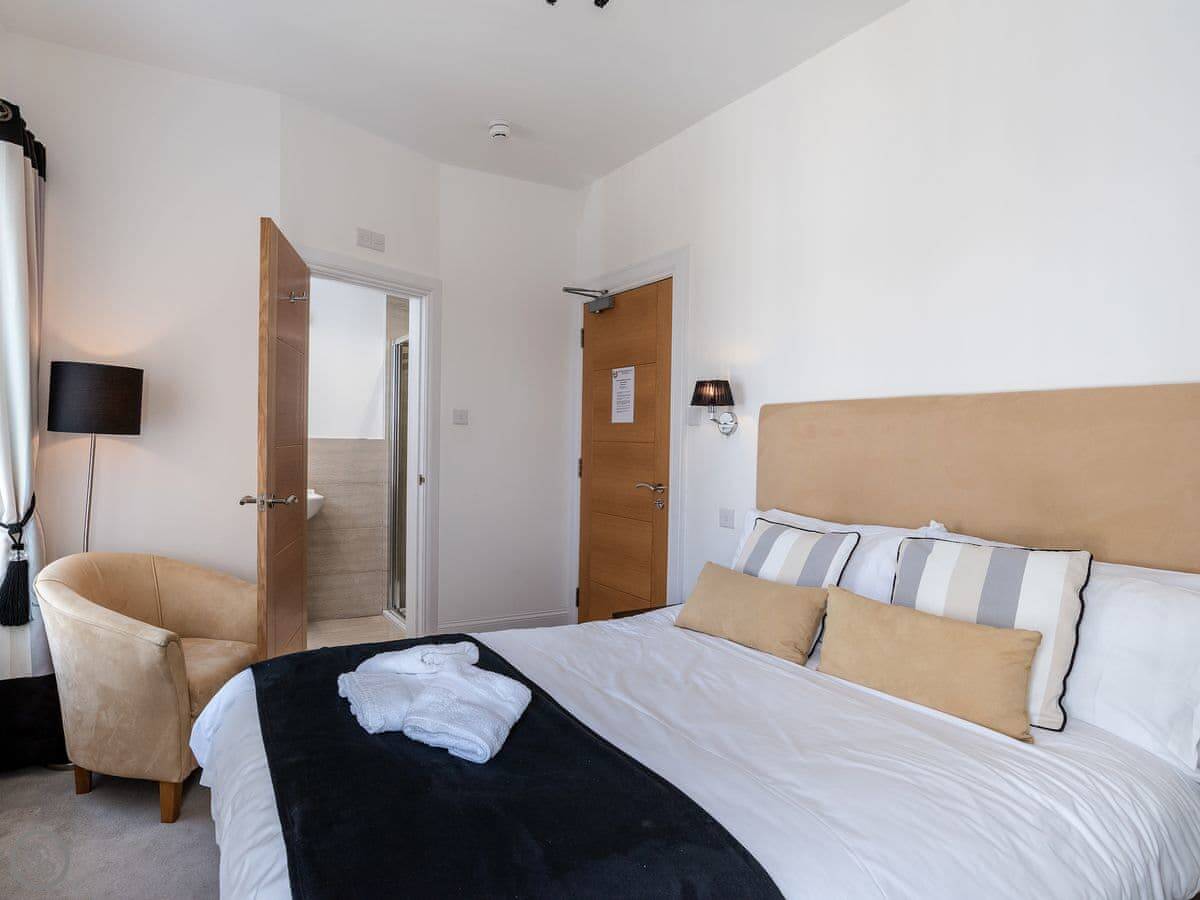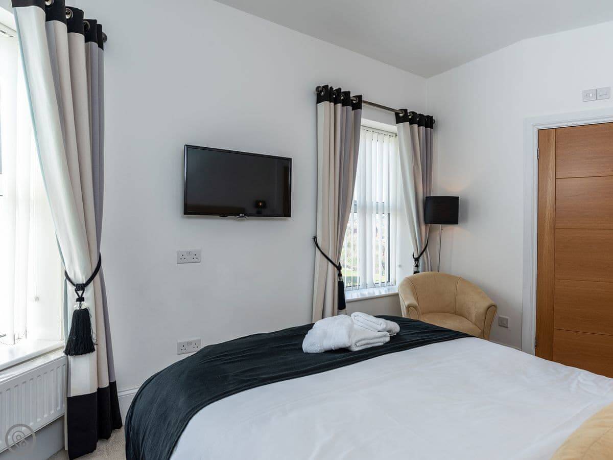 It sleeps four people in two double bedrooms. Each bedroom has its own en-suite shower room, so it works well for two couples or a family. The living area is open plan with the kitchen. It's all done in neutral colours.