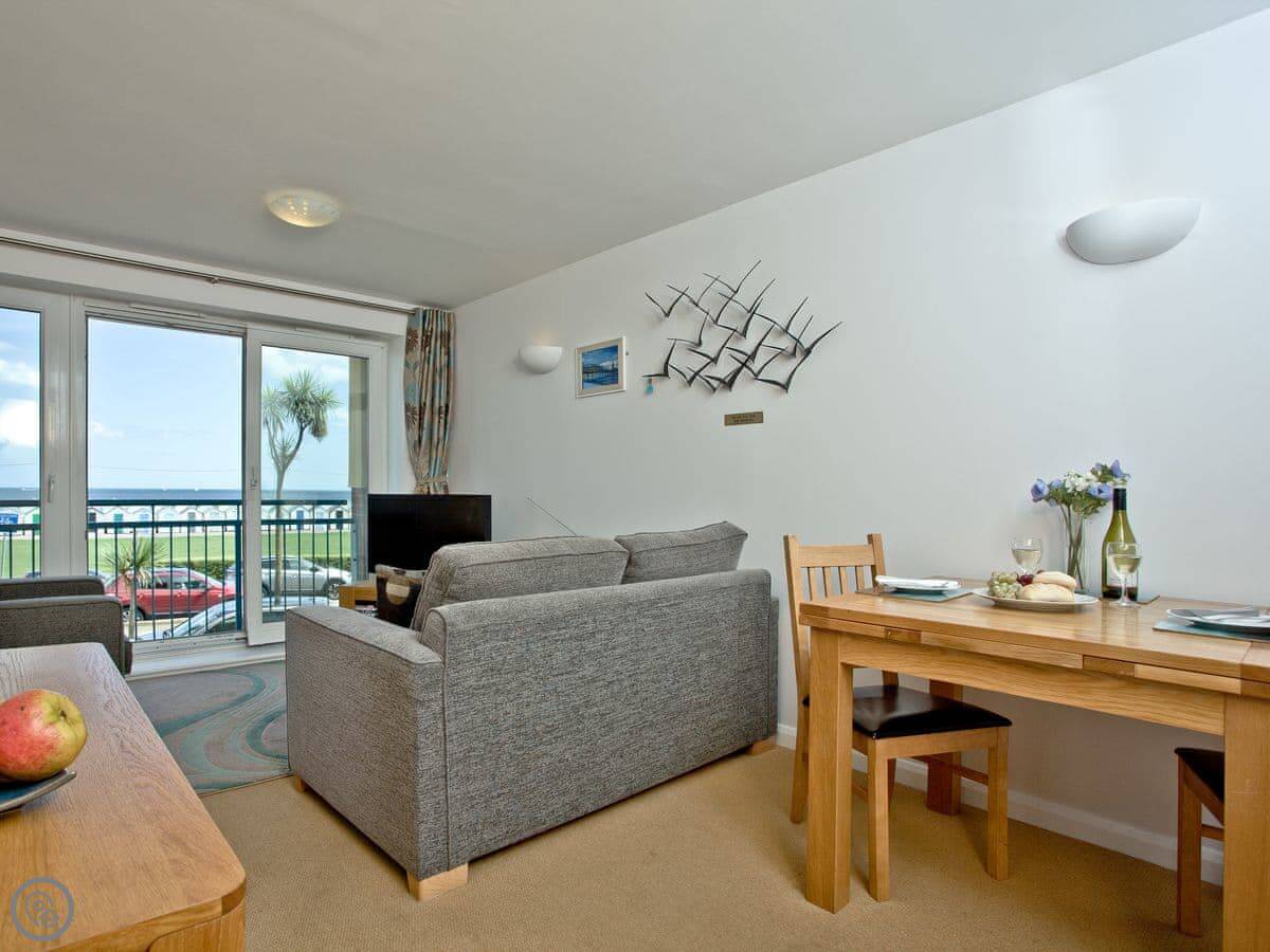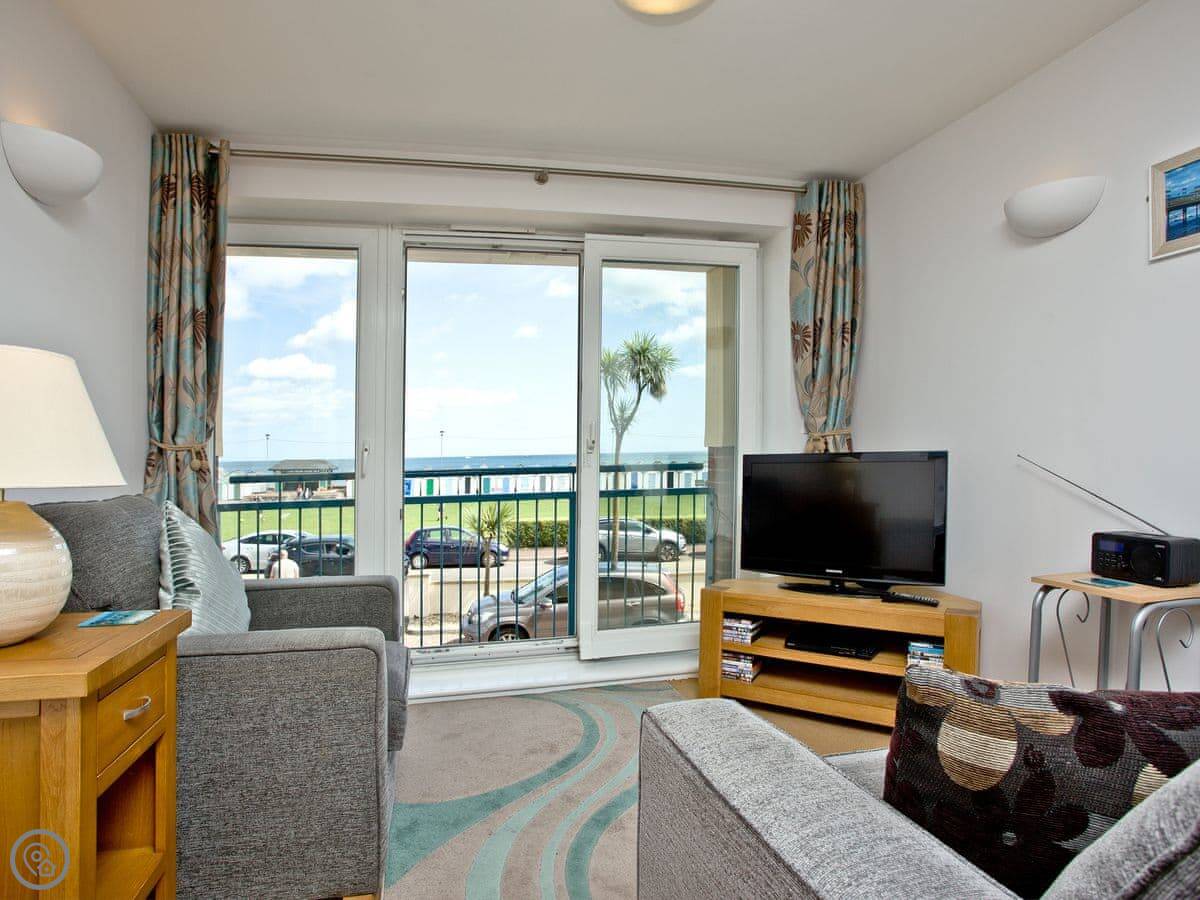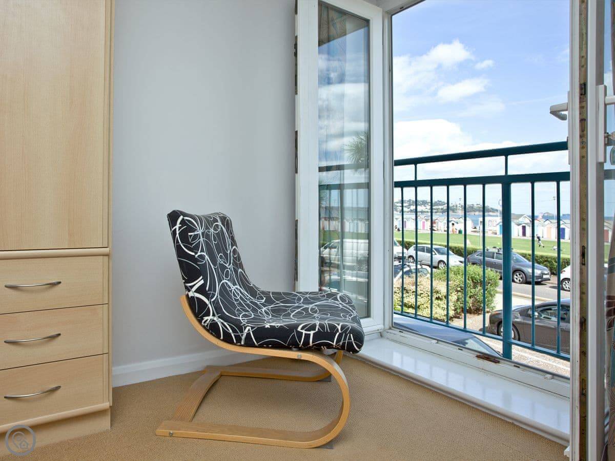 The main thing is the view. You look straight out over Preston Sands beach, and you can see right across the bay from Torquay round to Brixham. There's a Juliet balcony to stand at. The parking space is yours, which is handy.
