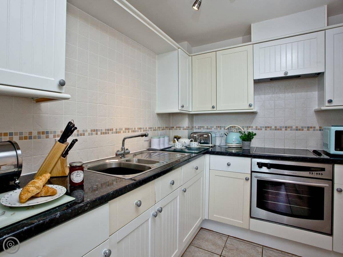 Inside, it's got what you'd need: a washing machine, a dishwasher, and WiFi. It's part of a block of apartments, so it's not a standalone cottage.