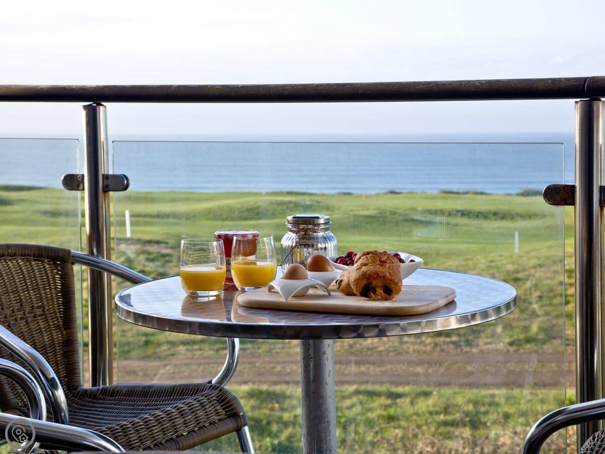 The main thing is the view. You look straight out over Fistral Beach and the headland. The main bedroom has doors onto a covered balcony with a table and chairs, so you can sit out there with a drink.