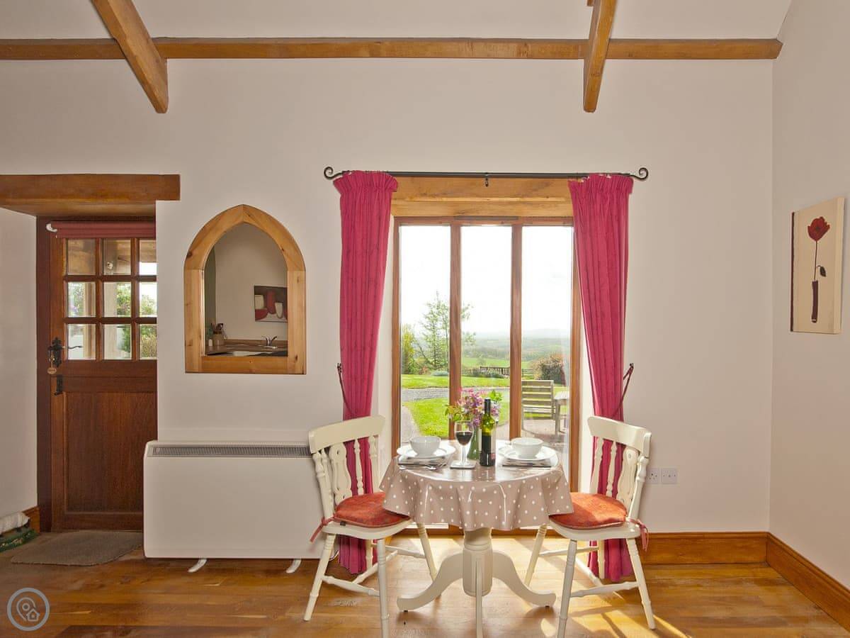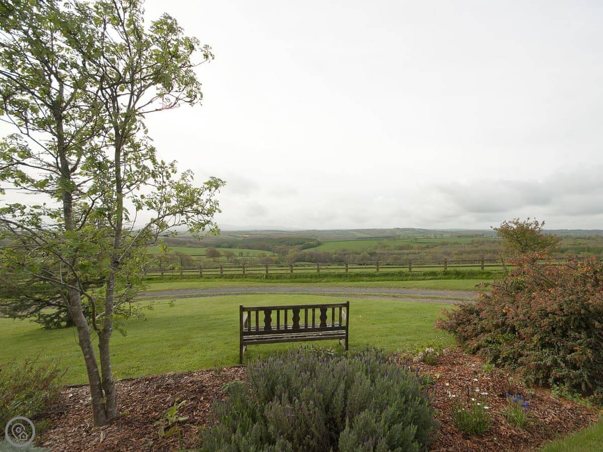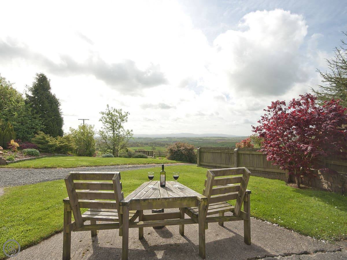 Outside there's a patio with a table and chairs. It looks out over our fields towards Dartmoor. You can see the edge of the moor from there. There's a barbecue you can use.