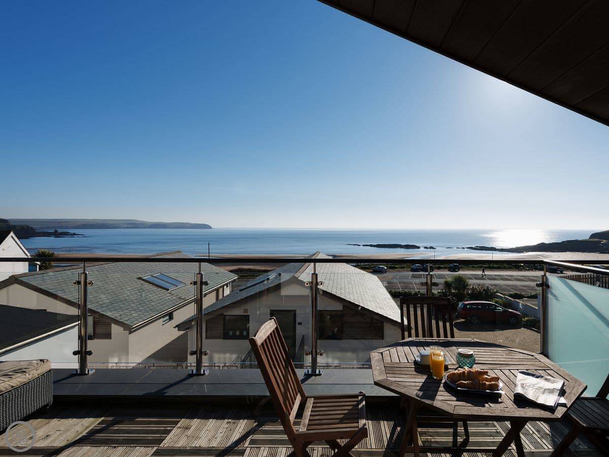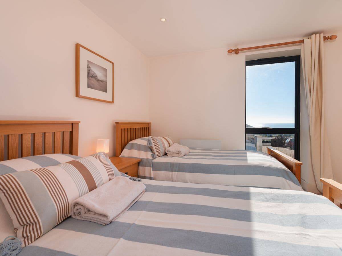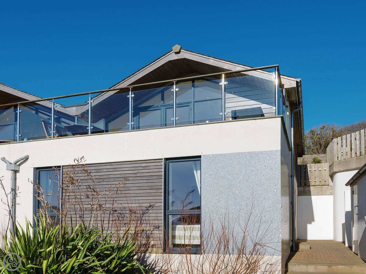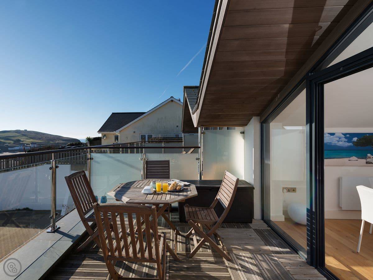 It sleeps six. Three bedrooms, two bathrooms. It's got a 5 Star rating, which in this case means it's well-finished. Oak floors, underfloor heating, that sort of thing. The living room and kitchen are upstairs to make the most of the view. There's a good-sized balcony off the living room.