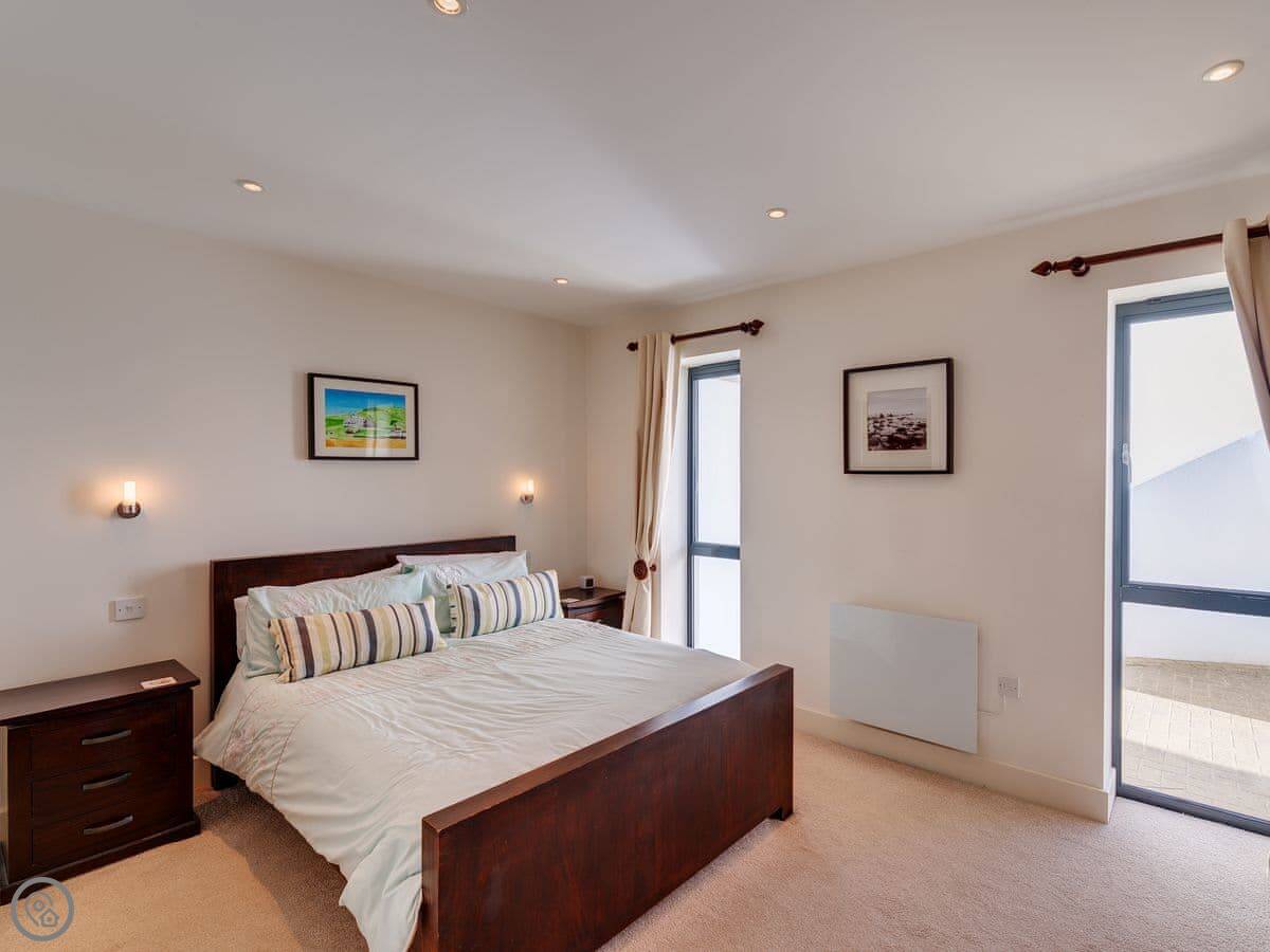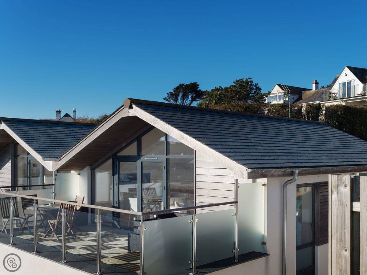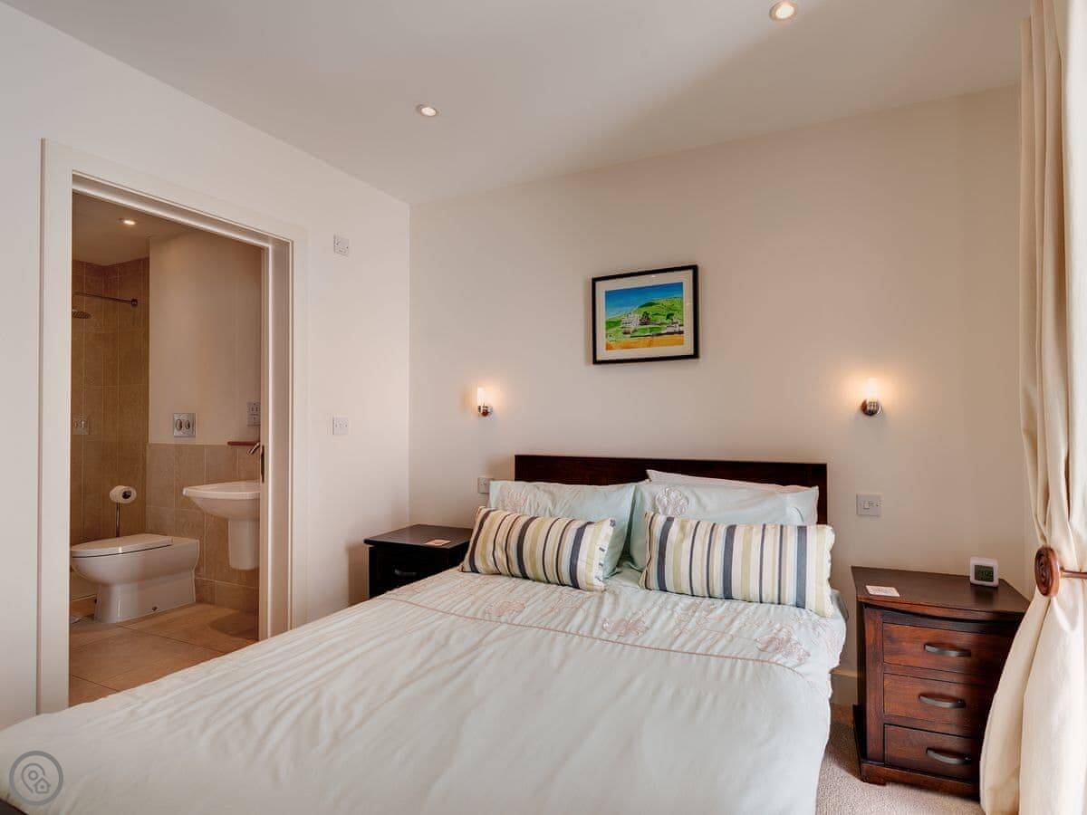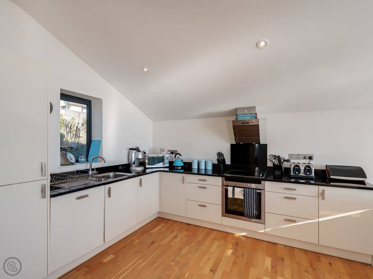 It sleeps six. Three bedrooms, two bathrooms. It's got a 5 Star rating, which in this case means it's well-finished. Oak floors, underfloor heating, that sort of thing. The living room and kitchen are upstairs to make the most of the view. There's a good-sized balcony off the living room.