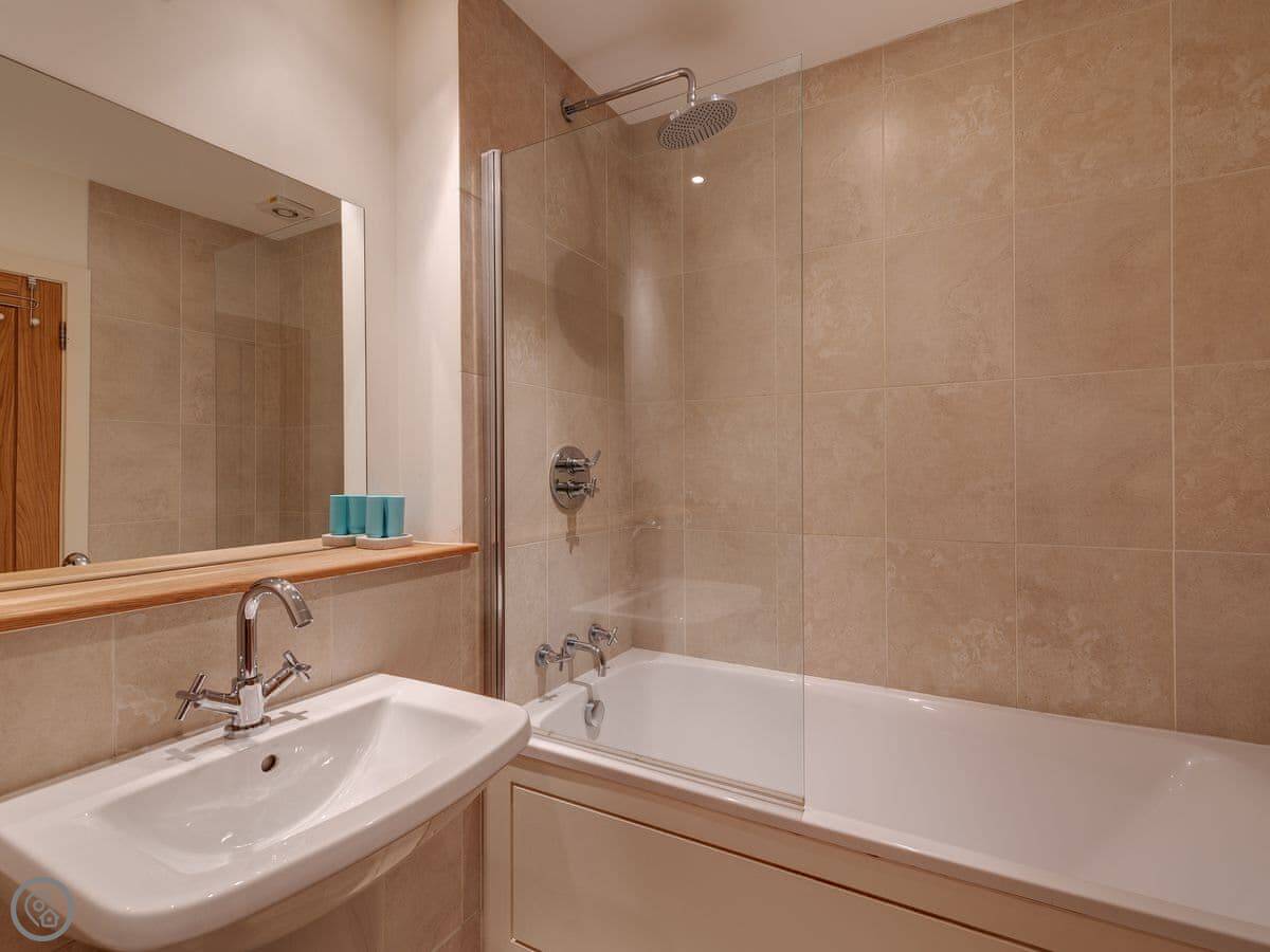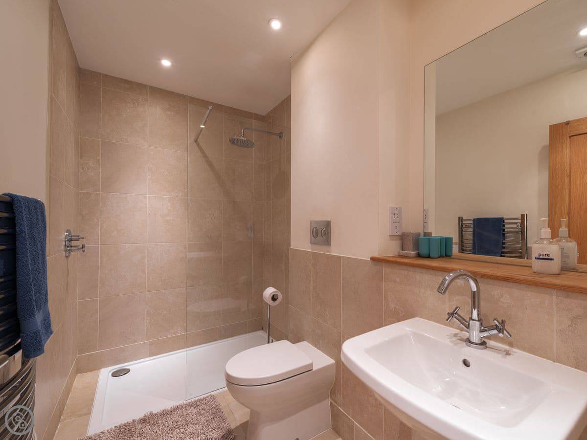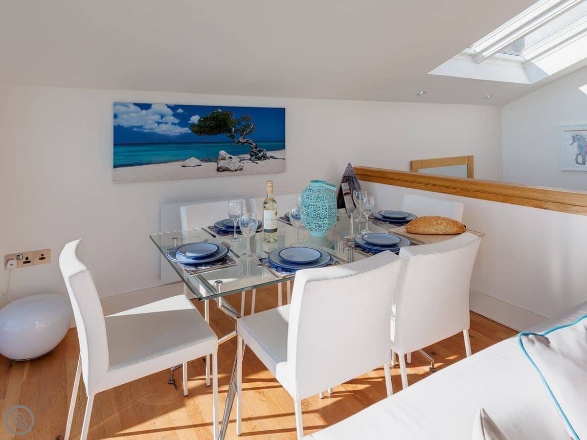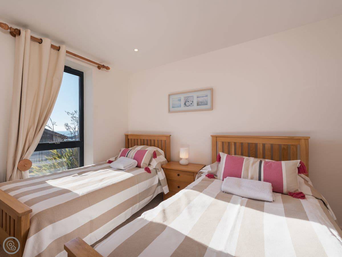 It sleeps six. Three bedrooms, two bathrooms. It's got a 5 Star rating, which in this case means it's well-finished. Oak floors, underfloor heating, that sort of thing. The living room and kitchen are upstairs to make the most of the view. There's a good-sized balcony off the living room.