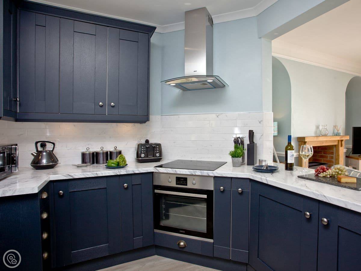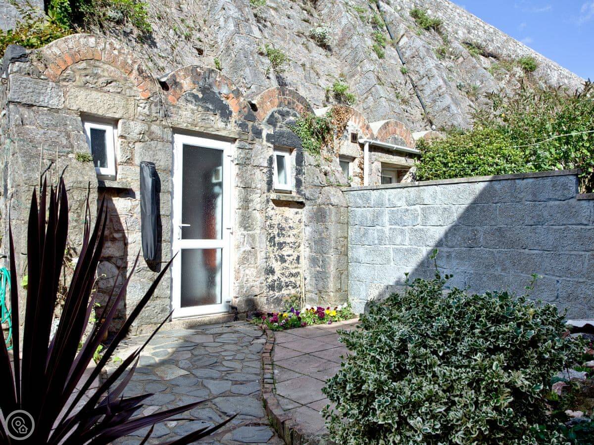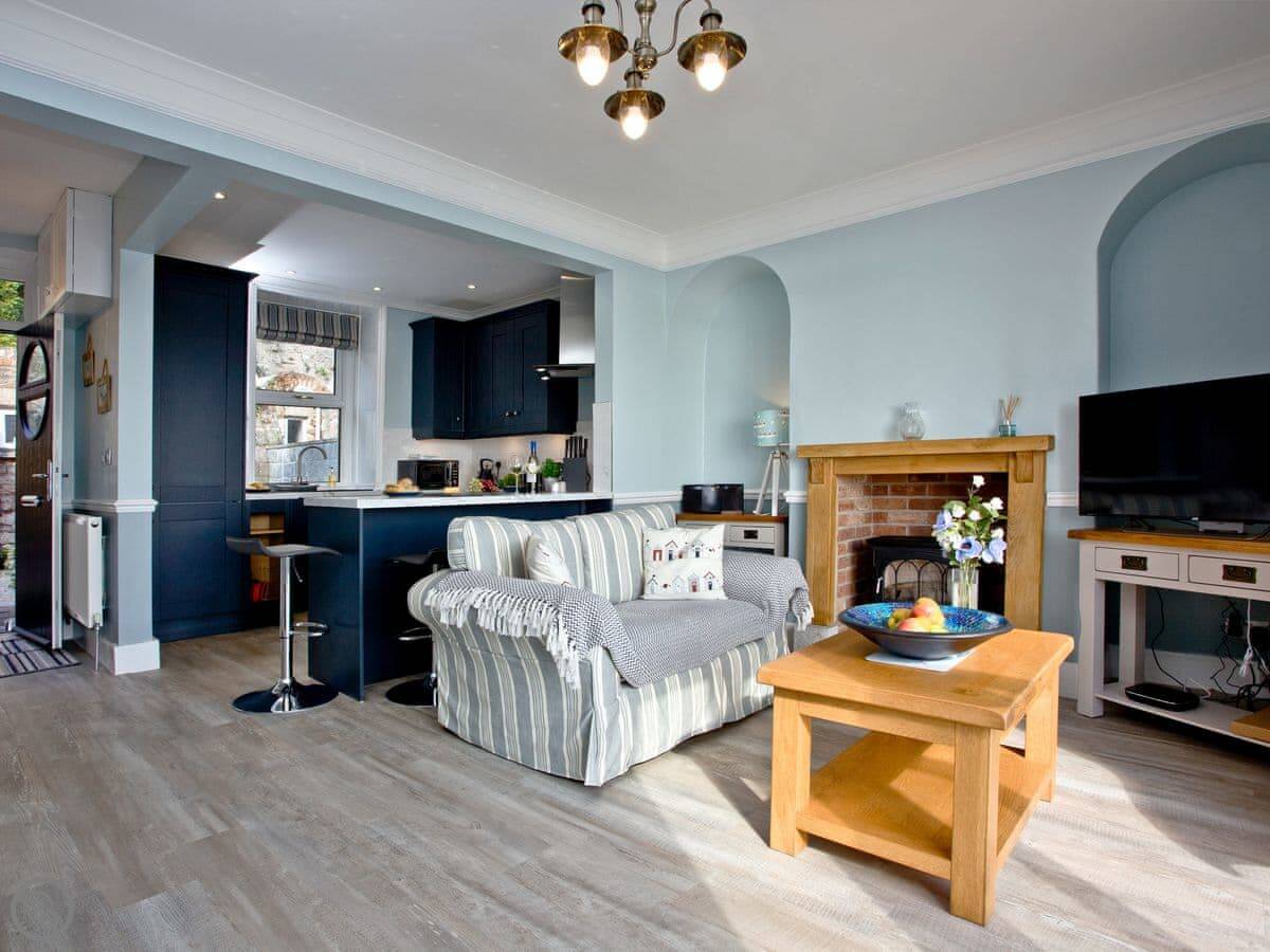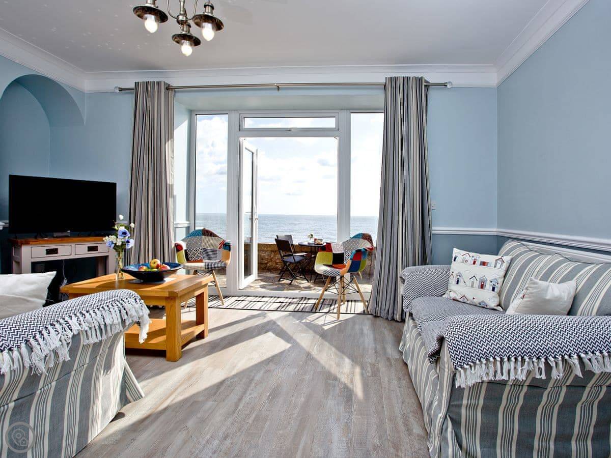 The living area is all open plan. Kitchen, sofa, dining table, all in one room. There's a TV and WiFi. The patio doors lead out to the garden. That garden is enclosed, but the wall on the sea side is a straight drop down to the railway line, so you need to be careful. It's not suitable for children, so we don't allow anyone under 16.