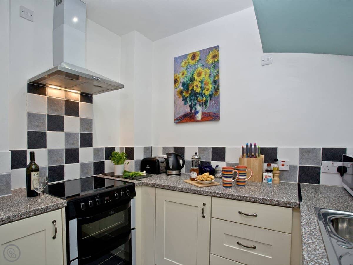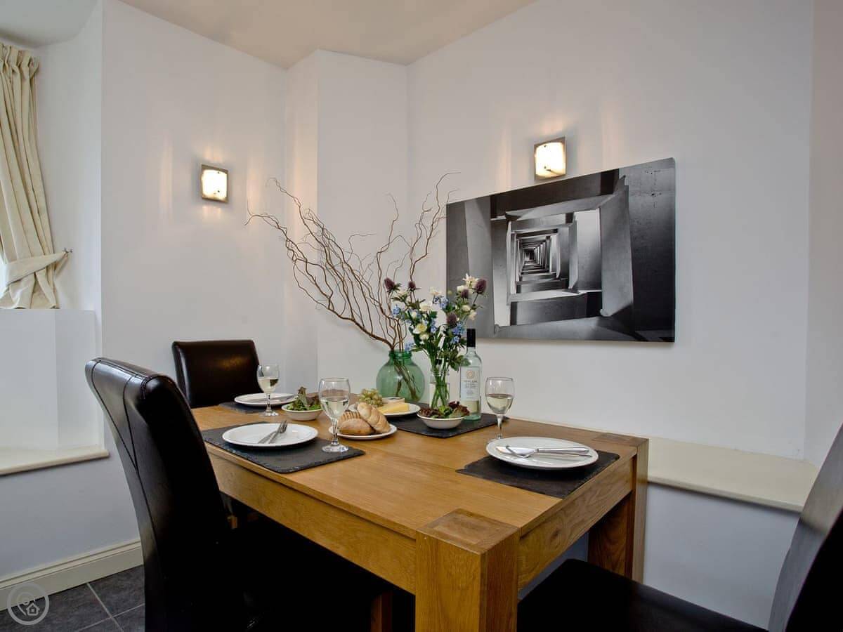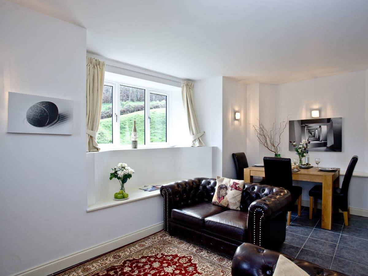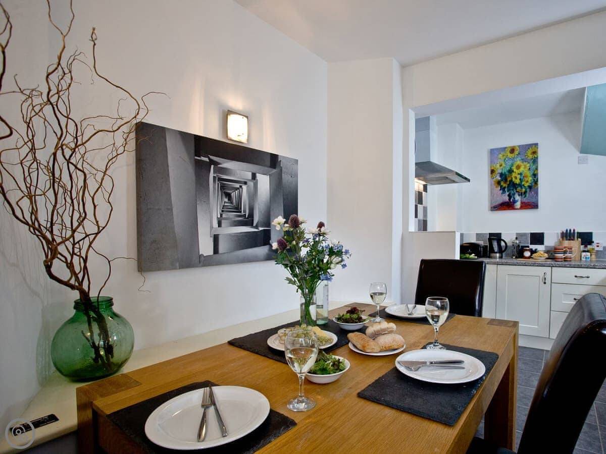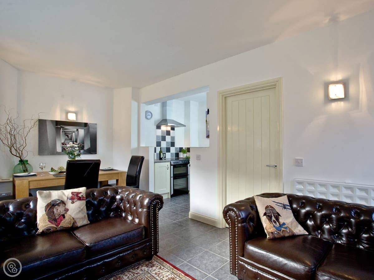 The living area is all one open space downstairs. Kitchen, dining table, and sofas are together. That's handy if you're cooking while others are watching TV.