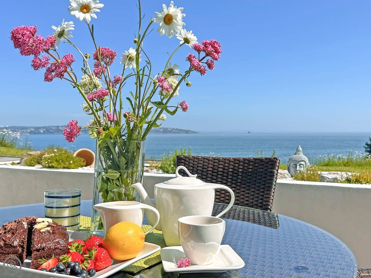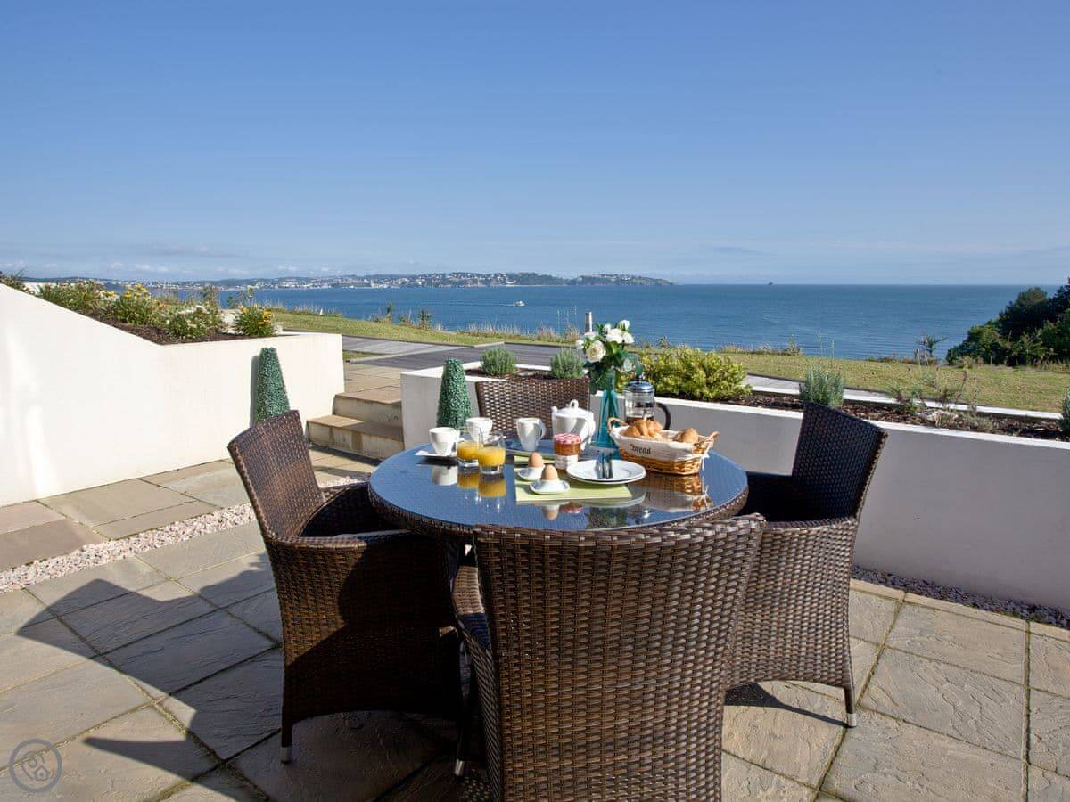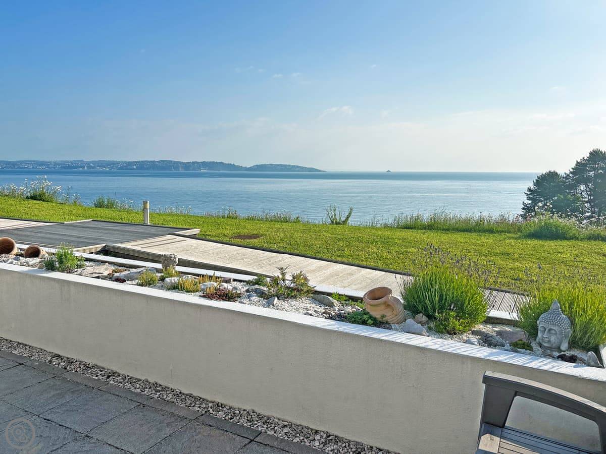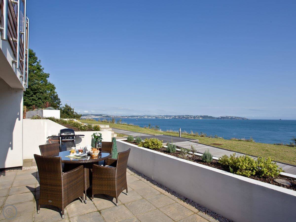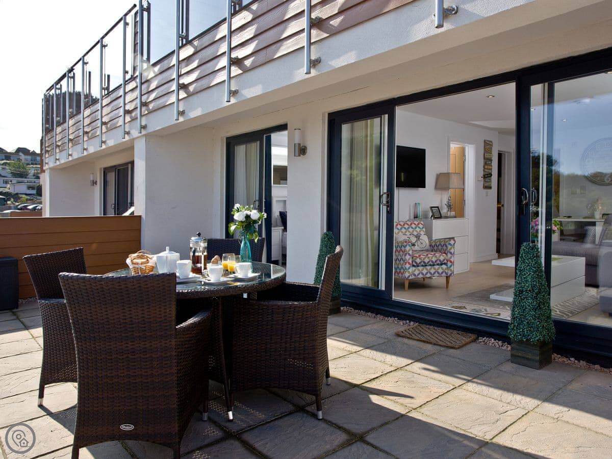 The main thing is the terrace. It's a large, private space with a table and chairs. You get a proper view of Fishcombe Cove and the sea. It catches the sun.