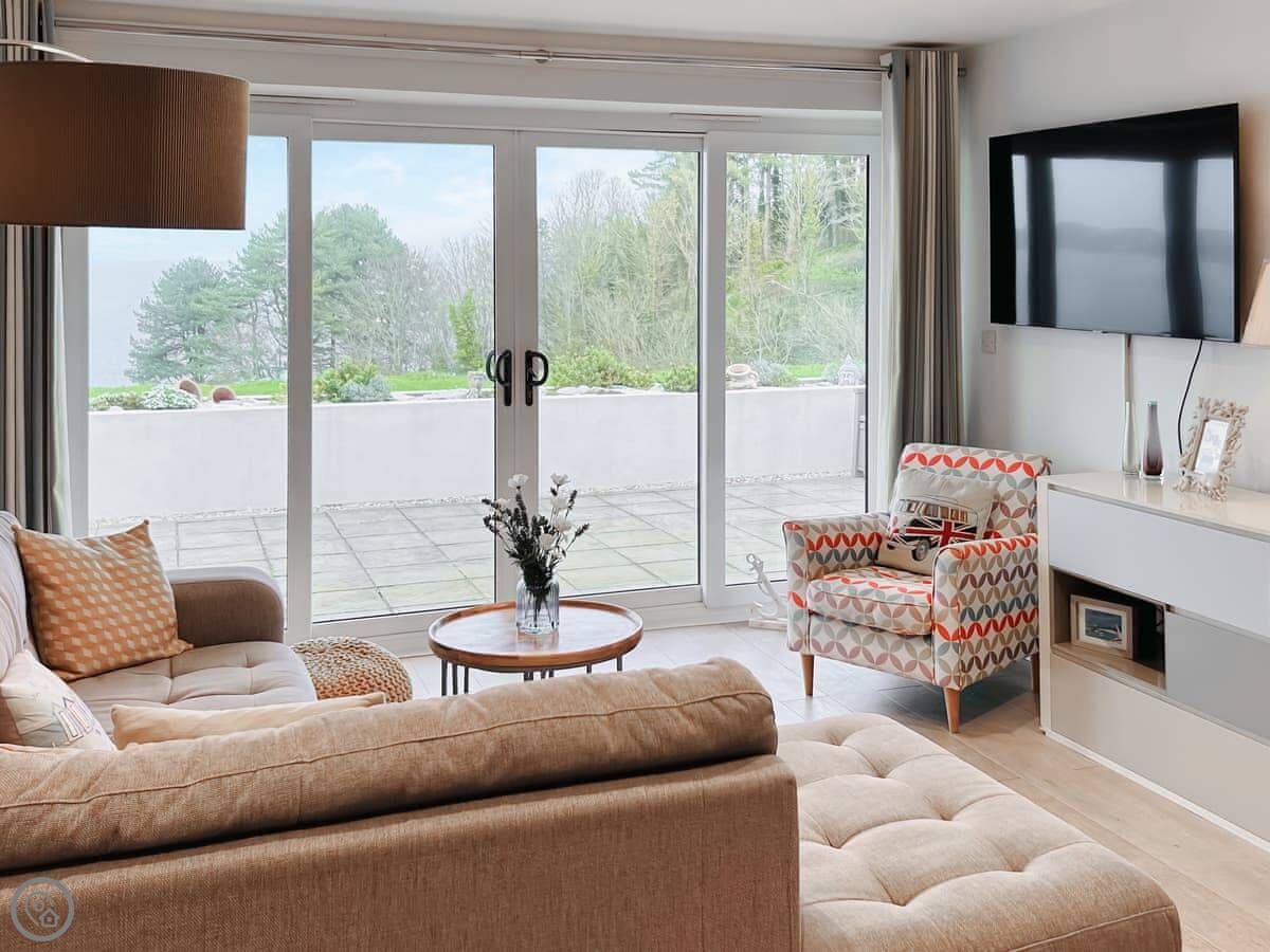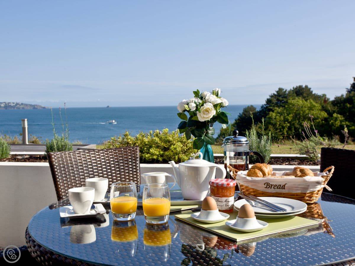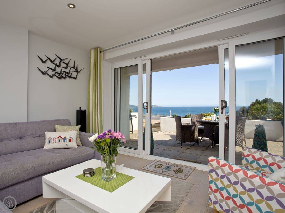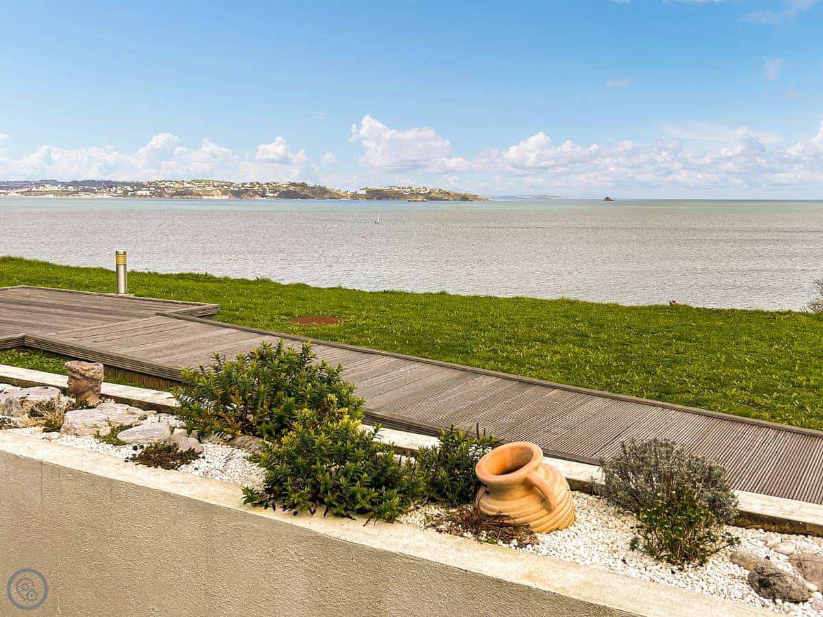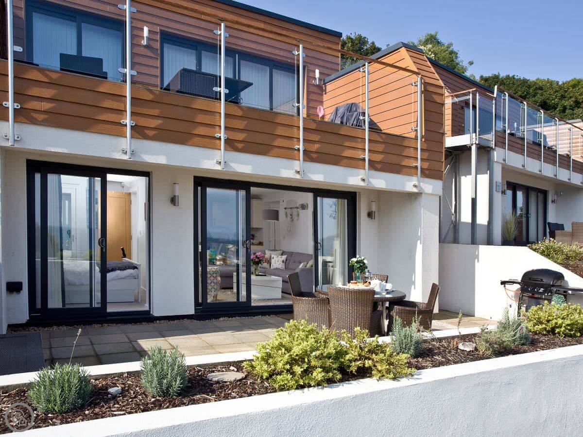 The main thing is the terrace. It's a large, private space with a table and chairs. You get a proper view of Fishcombe Cove and the sea. It catches the sun.
