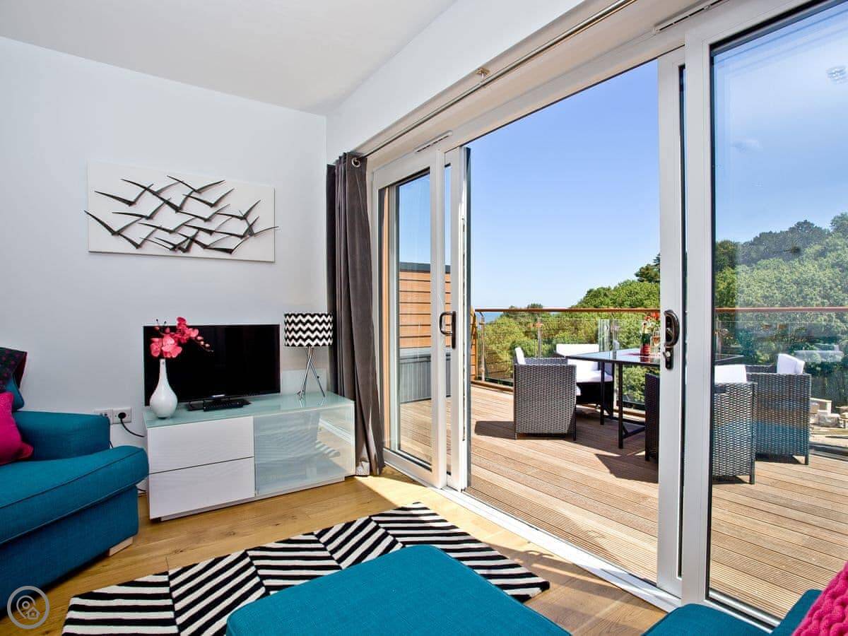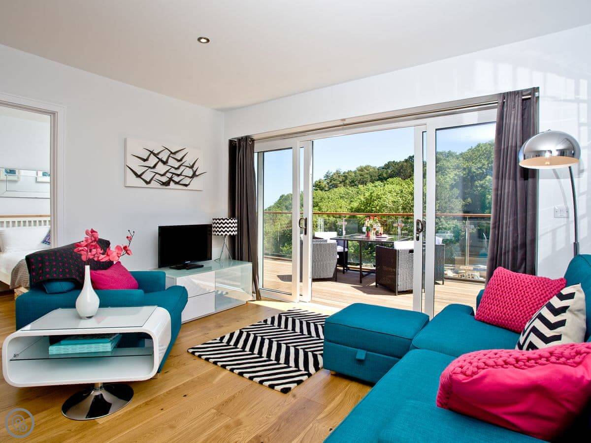 Inside, it's done in a modern way. The doors open right up onto the balcony, so it feels quite open when the weather's nice. It's a clean, comfortable place to come back to.