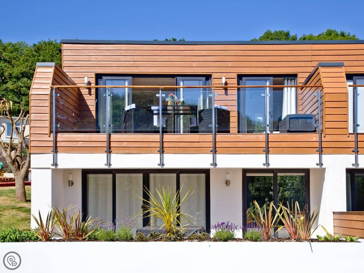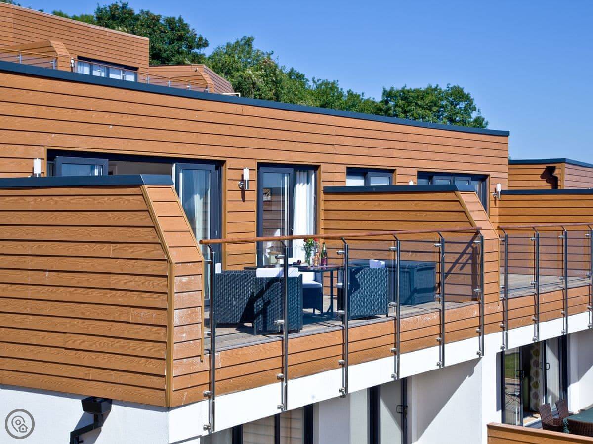 You go up a small ramp to get to the front door. The main thing about the place is the balcony. It's full width, so you get a pretty good view out over the water. You can see the boats come and go. It's sheltered here, so you often see people kayaking or fishing.