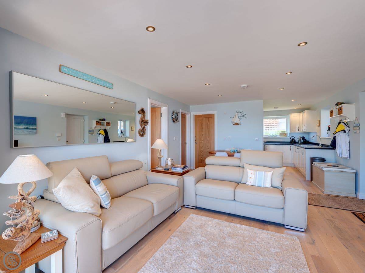 Inside, it's been done up with a bit of a seaside theme. It's a good size, one of the bigger ones here. There's a kitchen with a dishwasher and a washing machine. The living room has a 40-inch smart TV. You get WiFi.