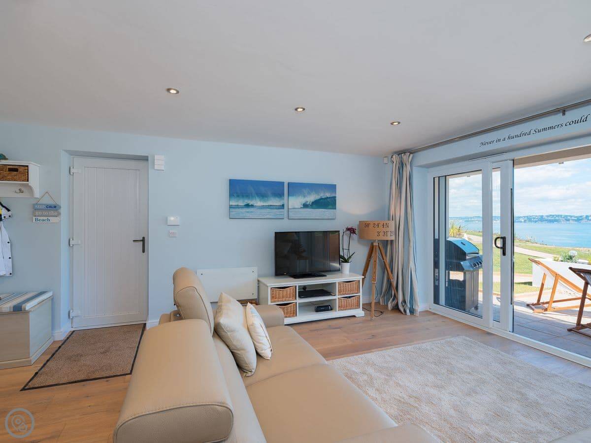 The main thing about this place is the view. It's right at the front of the building, looking straight out over Fishcombe Cove. You get that view from the living room and the main bedroom. The windows have privacy glass.