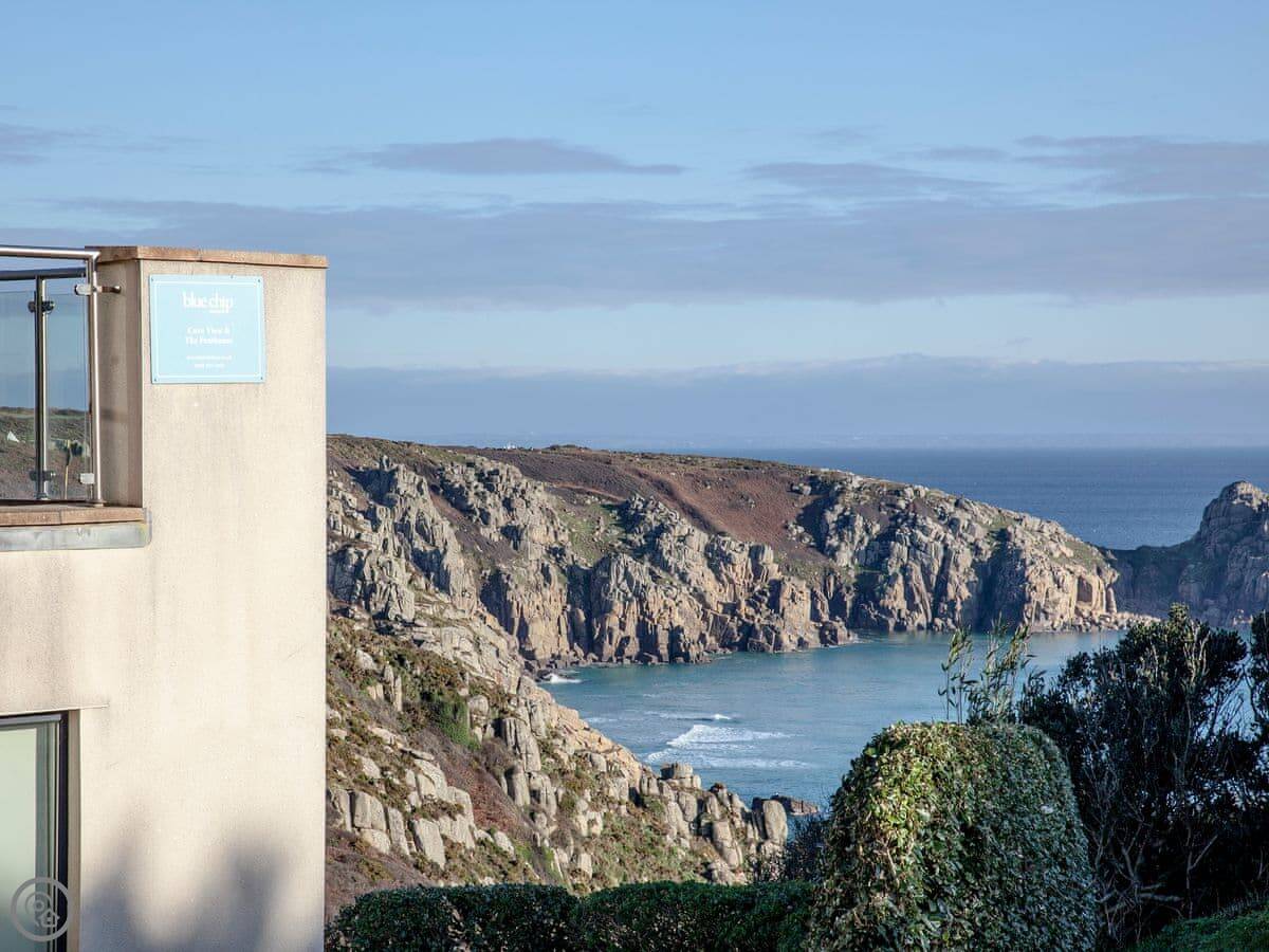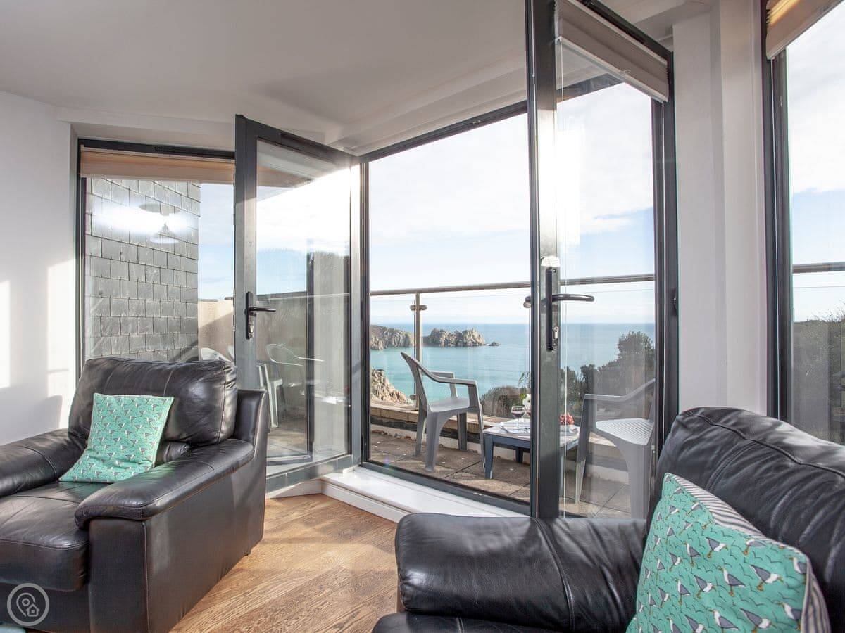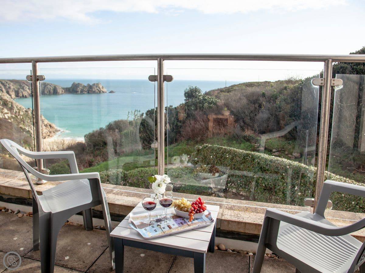 The main thing is the view. You're looking out over Porthcurno beach and the sea. There's a little furnished balcony to sit on and watch it.