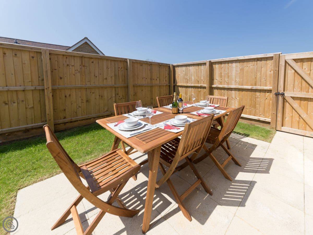 The kitchen is open plan with the dining area. Patio doors go out to the back garden. The garden is enclosed. It's got a table and chairs out there. There's parking for three cars on the driveway.