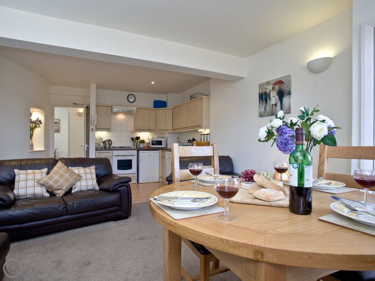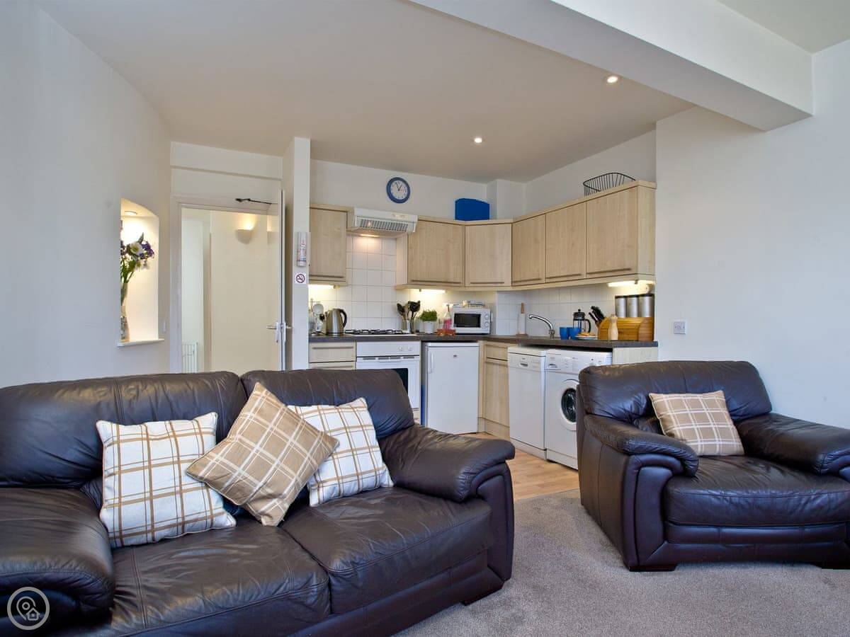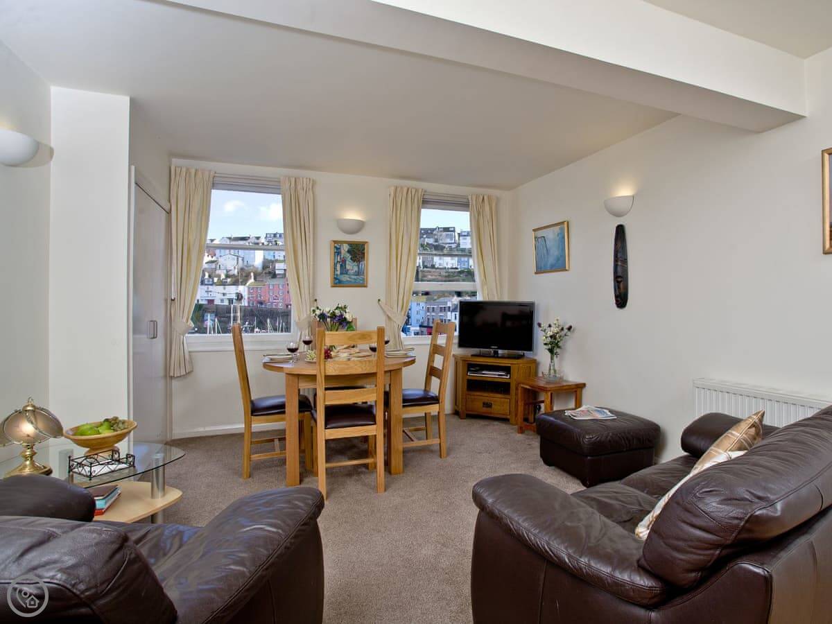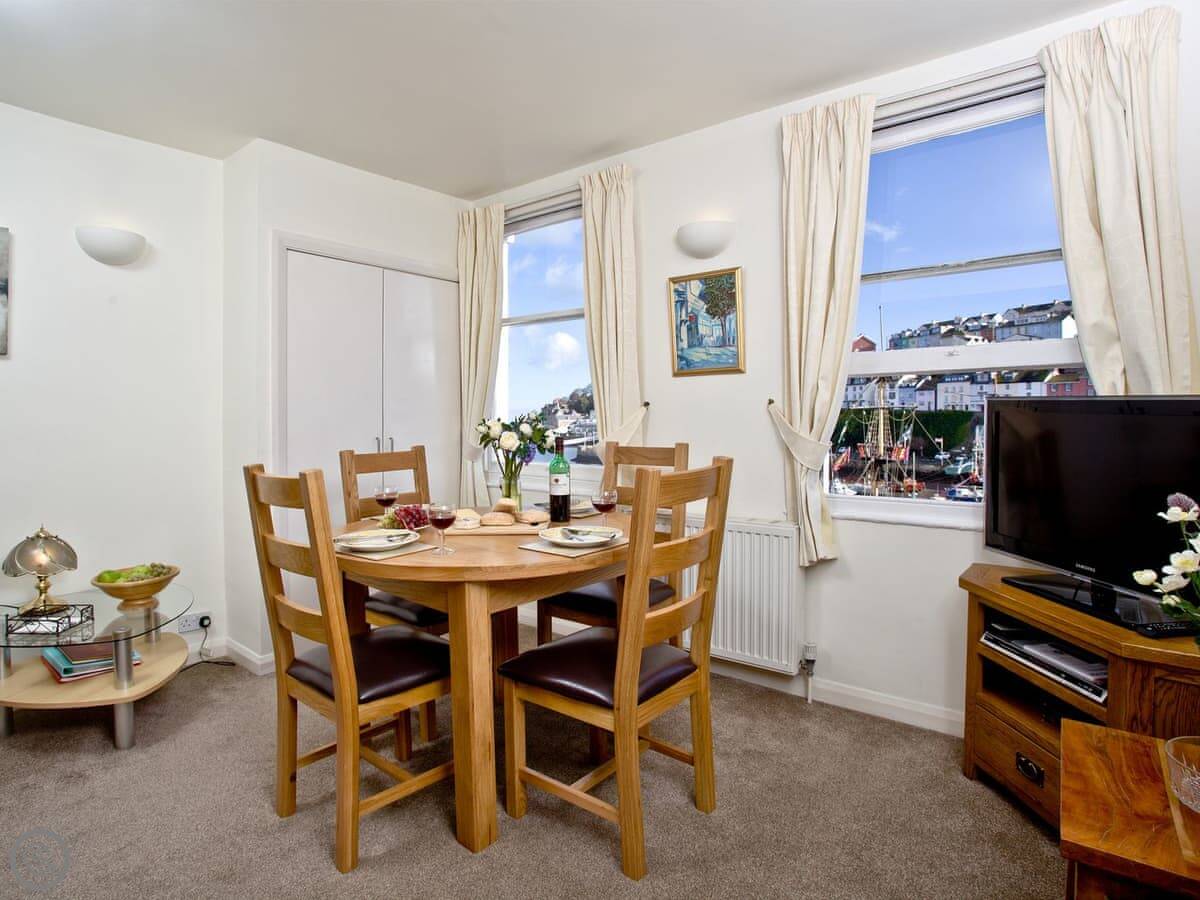 2 Fishermans Loft is in Brixham harbour, on the second floor. The windows look right out over the water and the fishing boats. You can see the Golden Hind replica from the lounge.