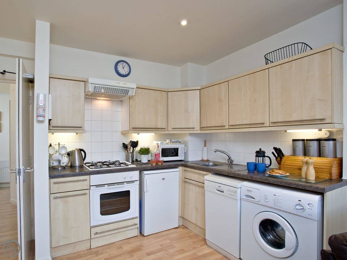 It's a 4 Star place, so it's comfortable and well looked after. Because it's in an old harbour building, you get to it through a shared hall. There are two flights of stairs up to the front door. They're normal stairs, but there's no lift.