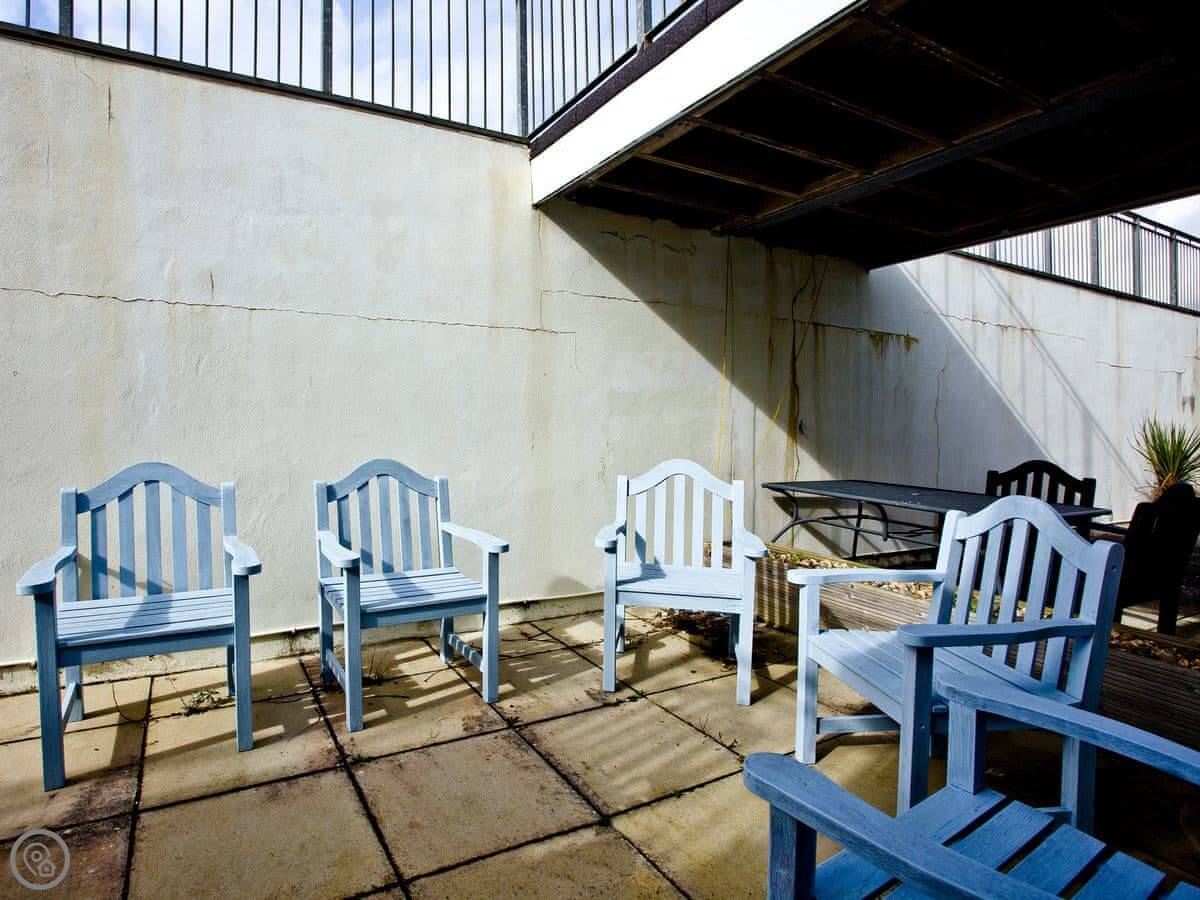 It sleeps six. There are three bedrooms and they each have their own bathroom, which is handy. The living area is upstairs. That means the views are better from there. There's a terrace outside the living room.