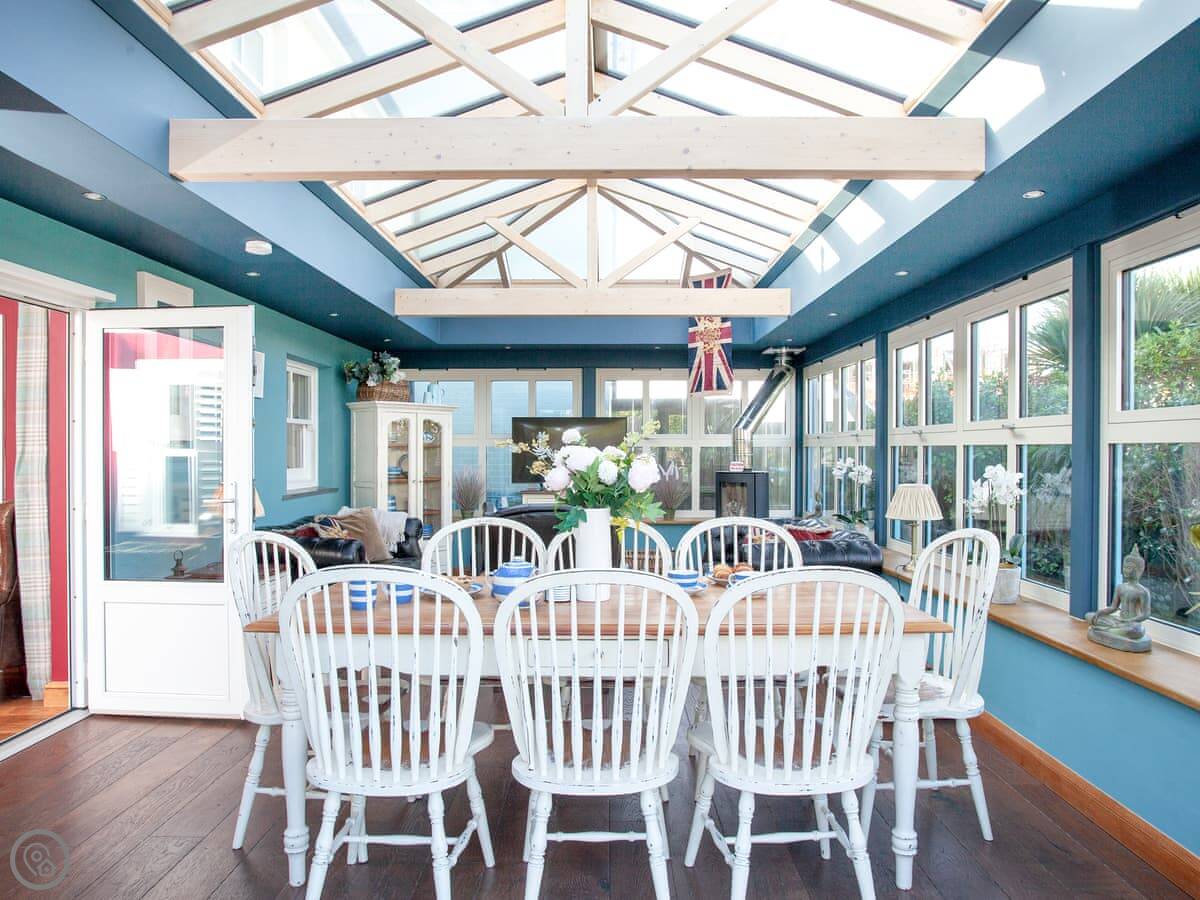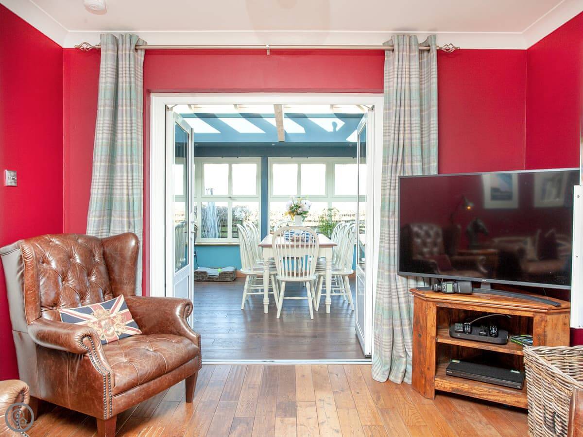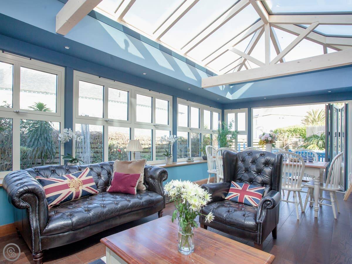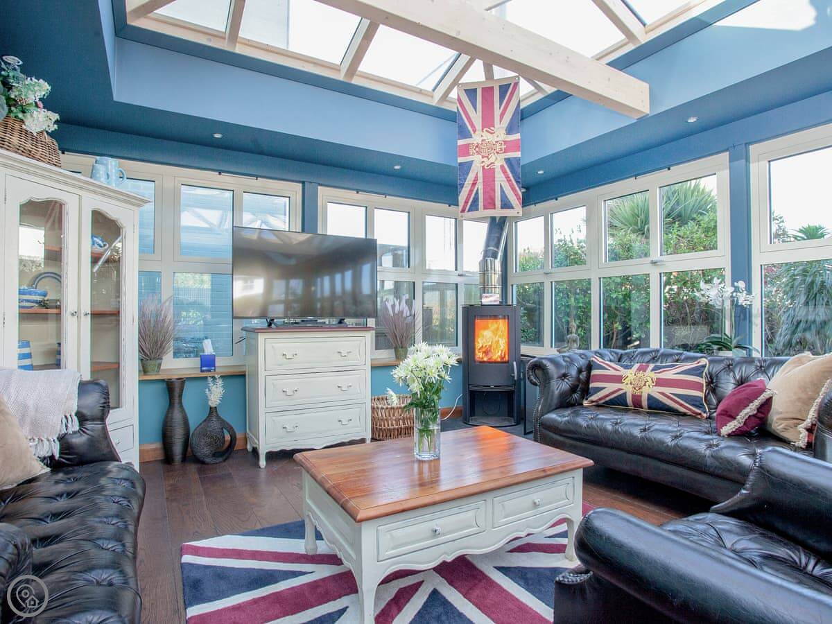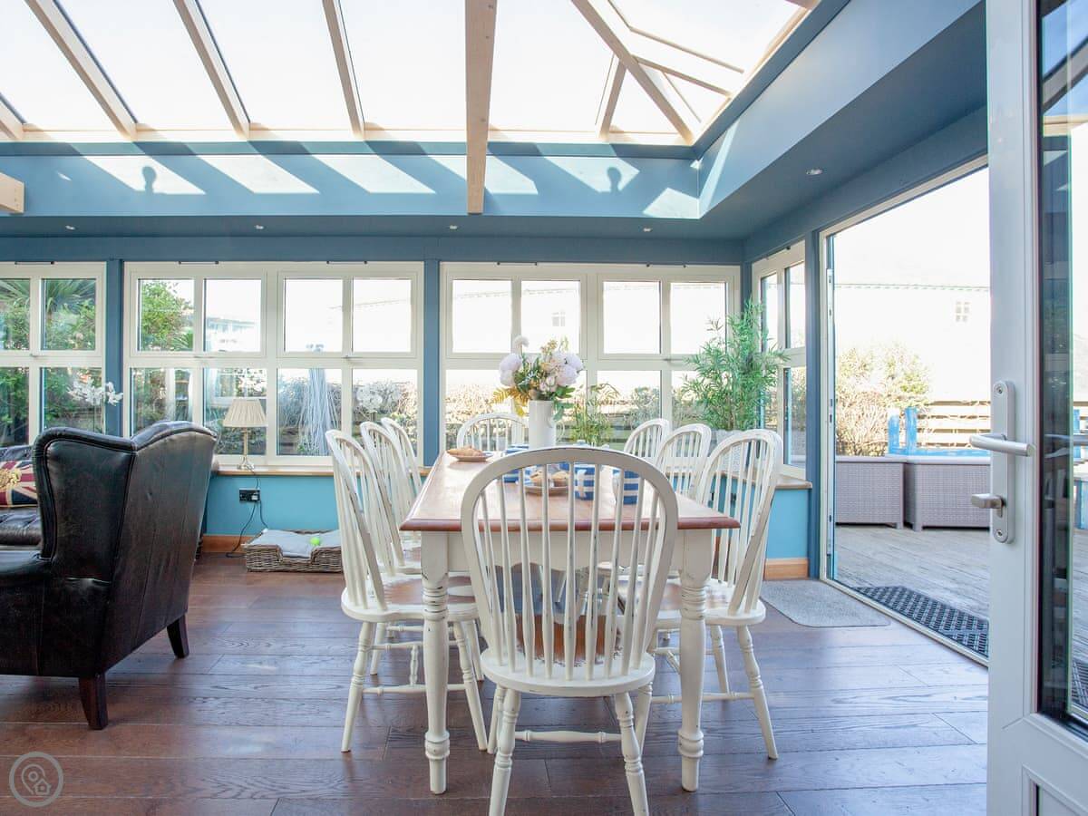 The best room is probably the conservatory. It's got big doors that open out to the patio. There's a hot tub out there with a view.