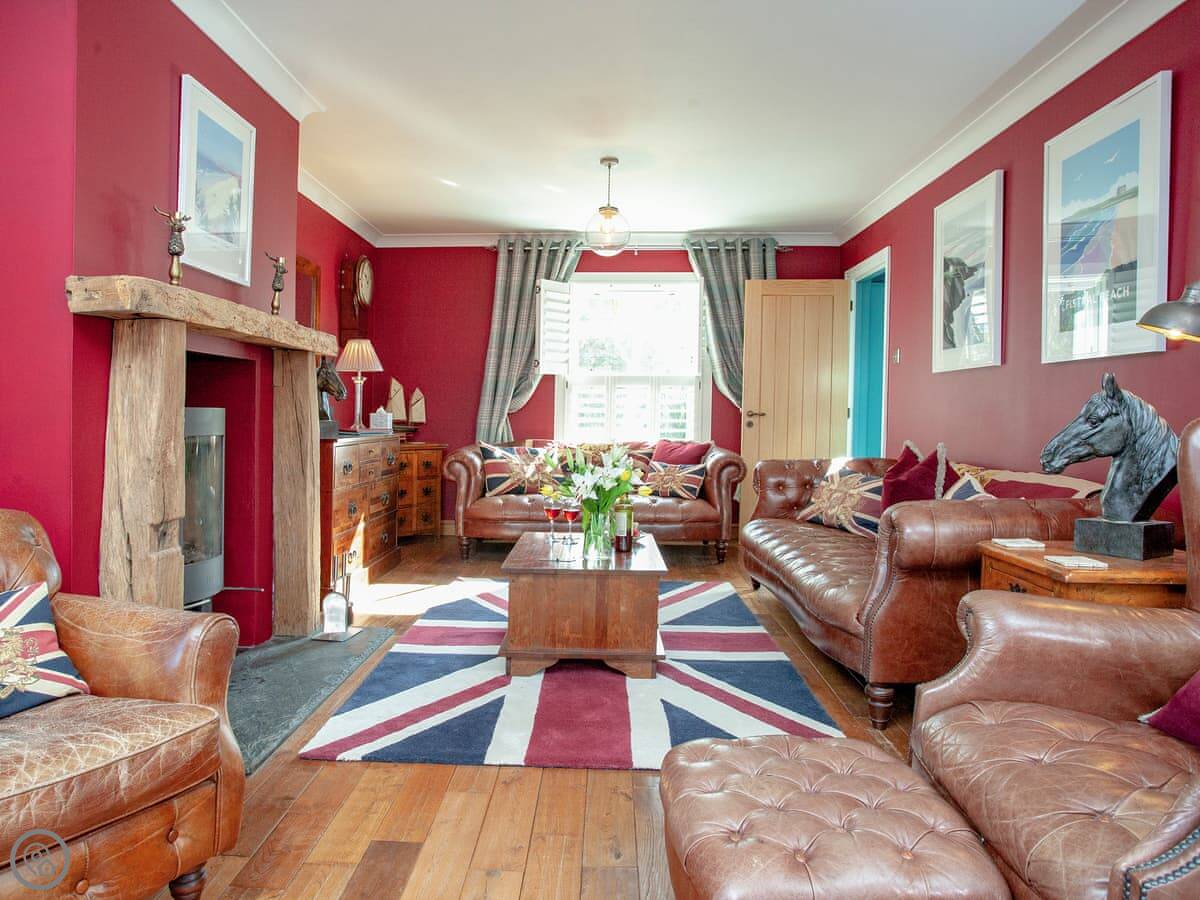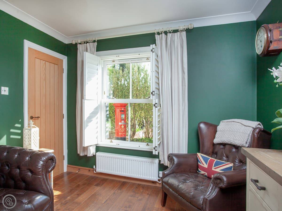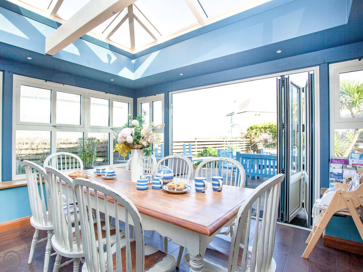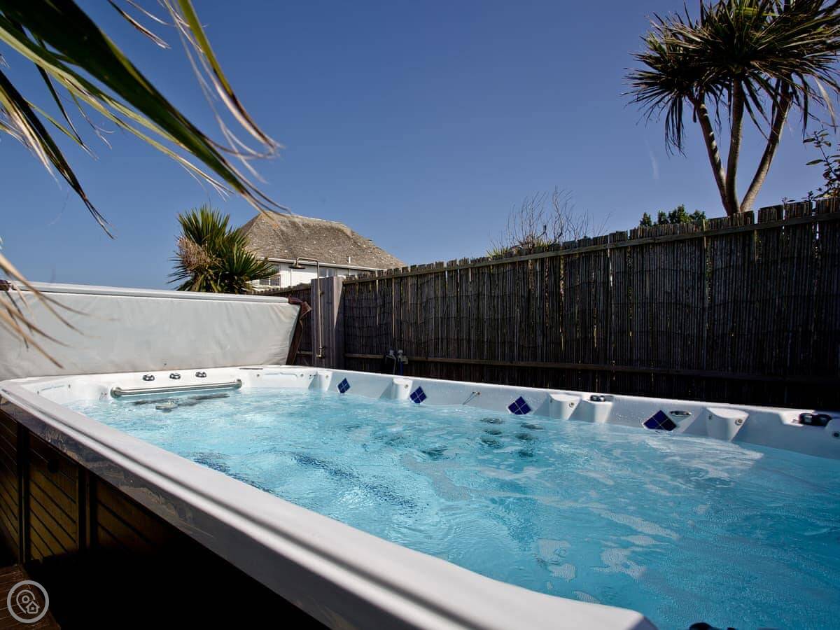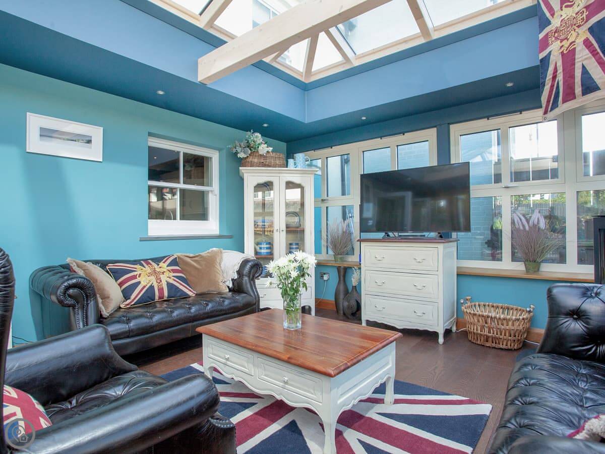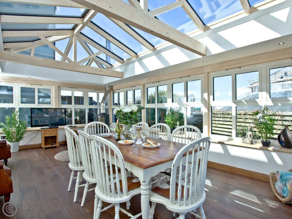 The best room is probably the conservatory. It's got big doors that open out to the patio. There's a hot tub out there with a view.