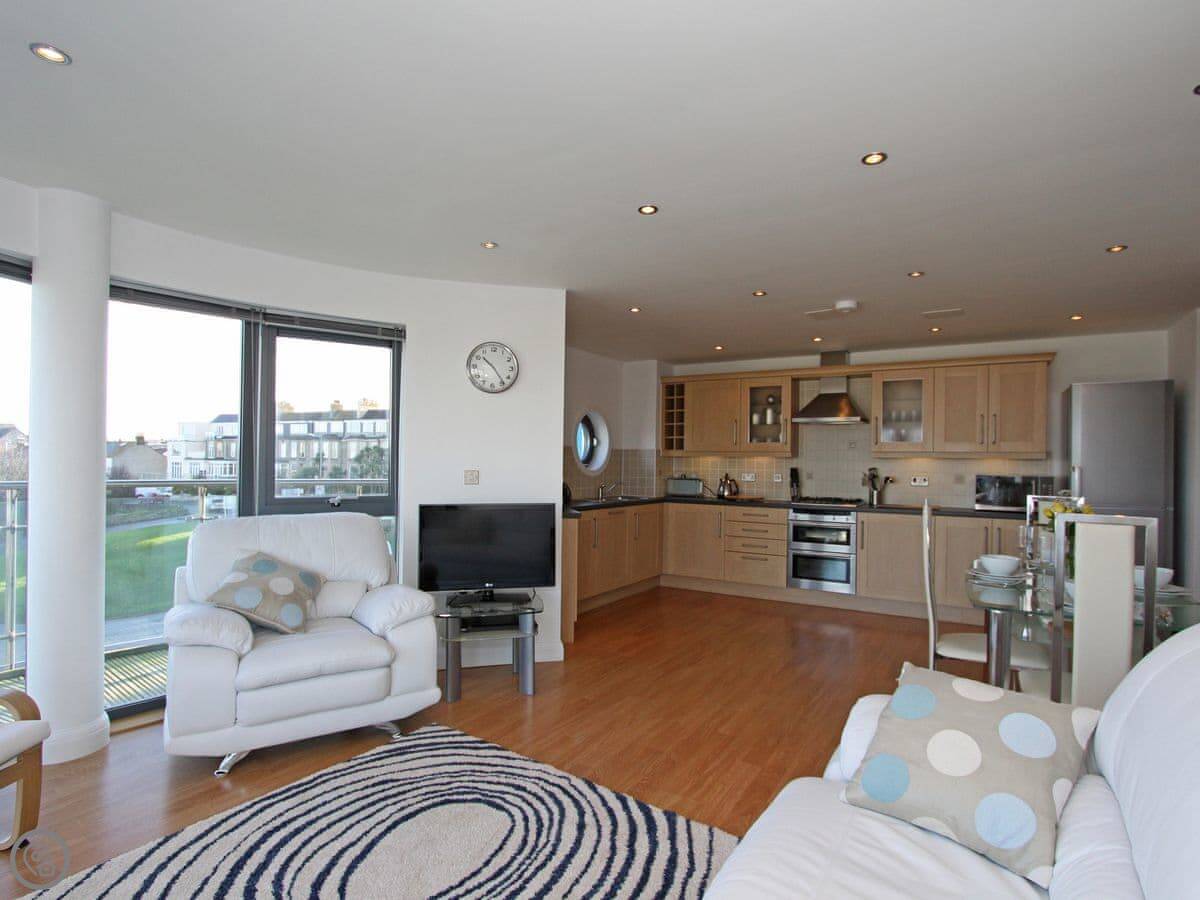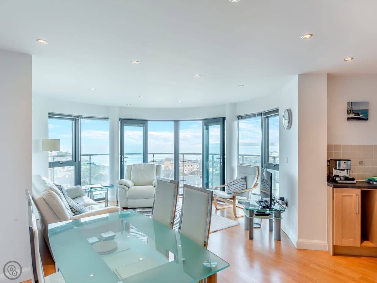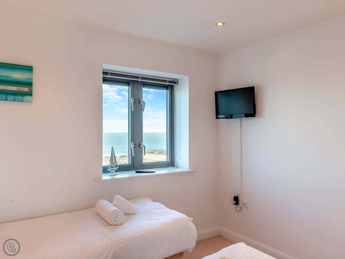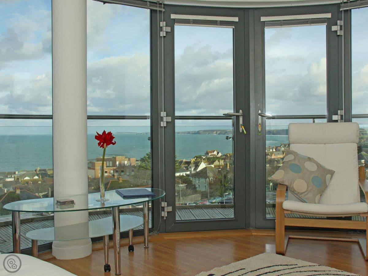 10 Horizons is a first-floor apartment on Mount Wise in Newquay. You get great views over the town and out to the coast from the main living room window. You can see the sea from both bedrooms too.