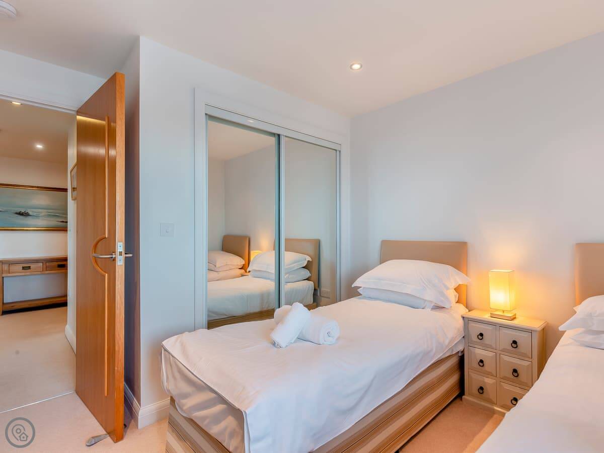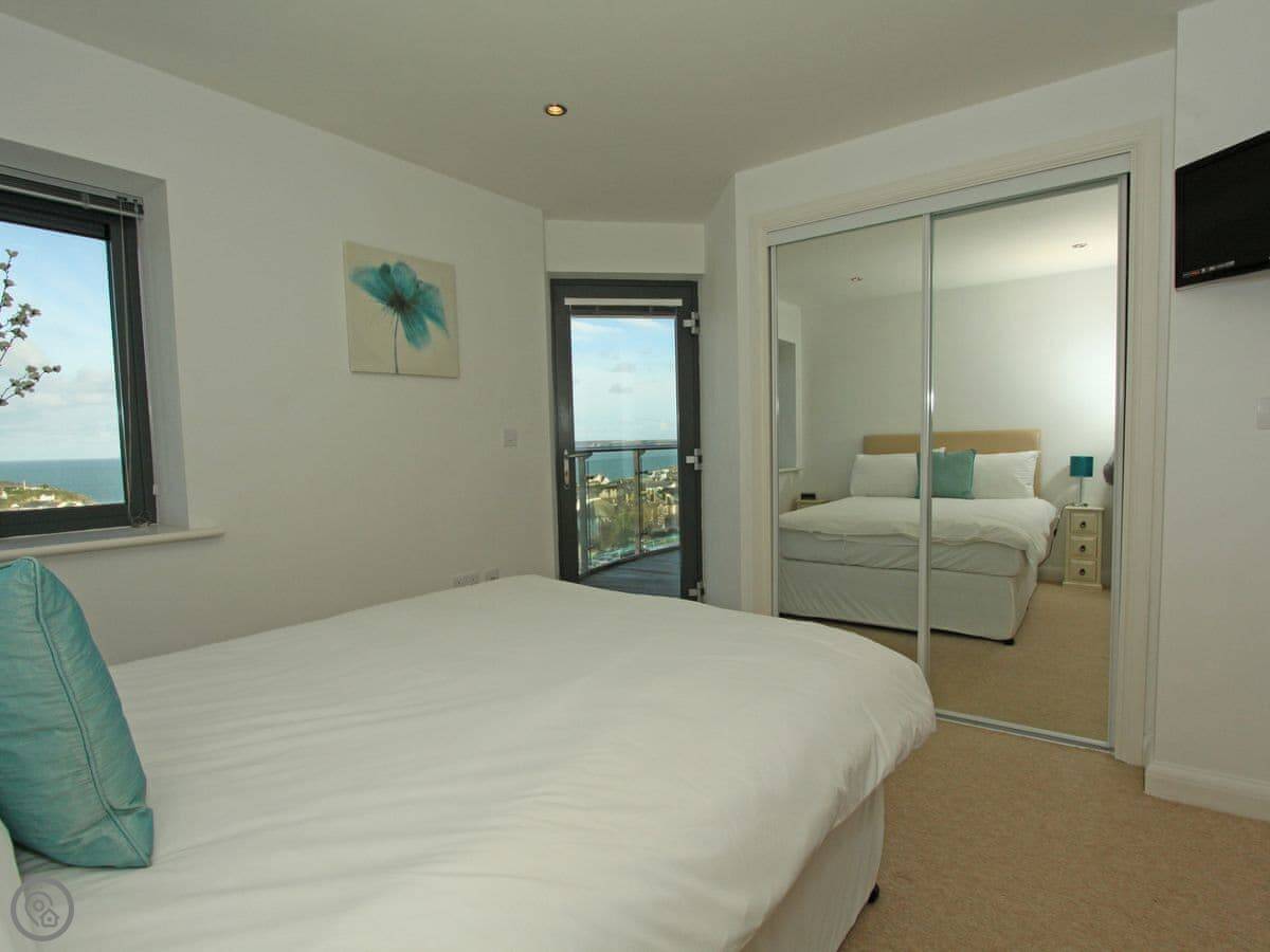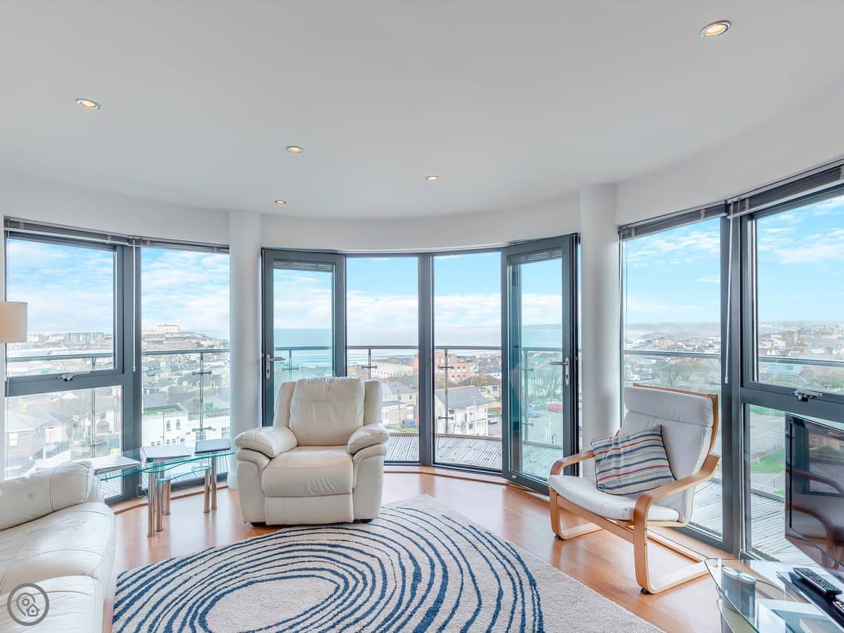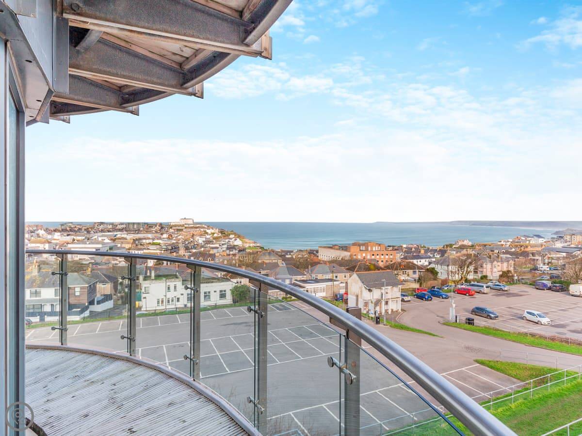 You're up on the hill, so it's a short walk down into the town centre. Takes about ten minutes. Fistral Beach and Towan Beach are about a fifteen-minute walk. The property has an allocated space in the underground car park.