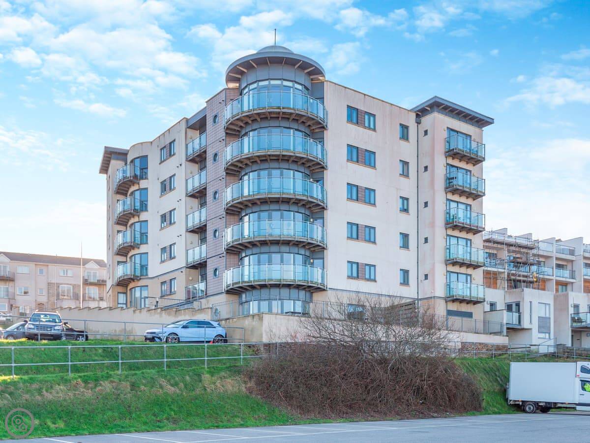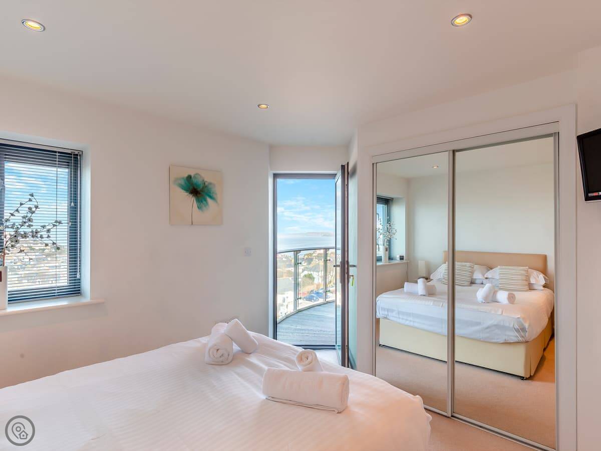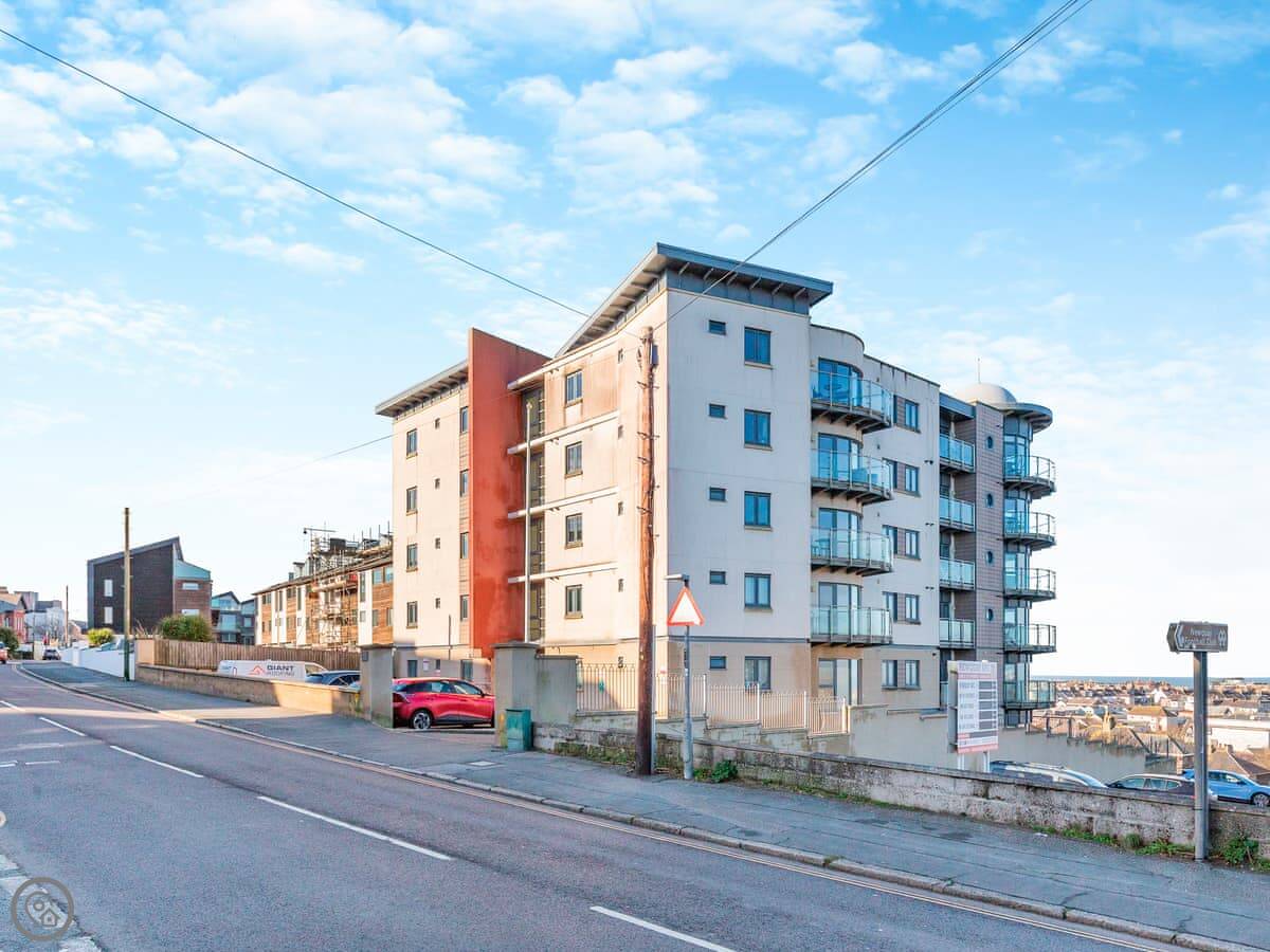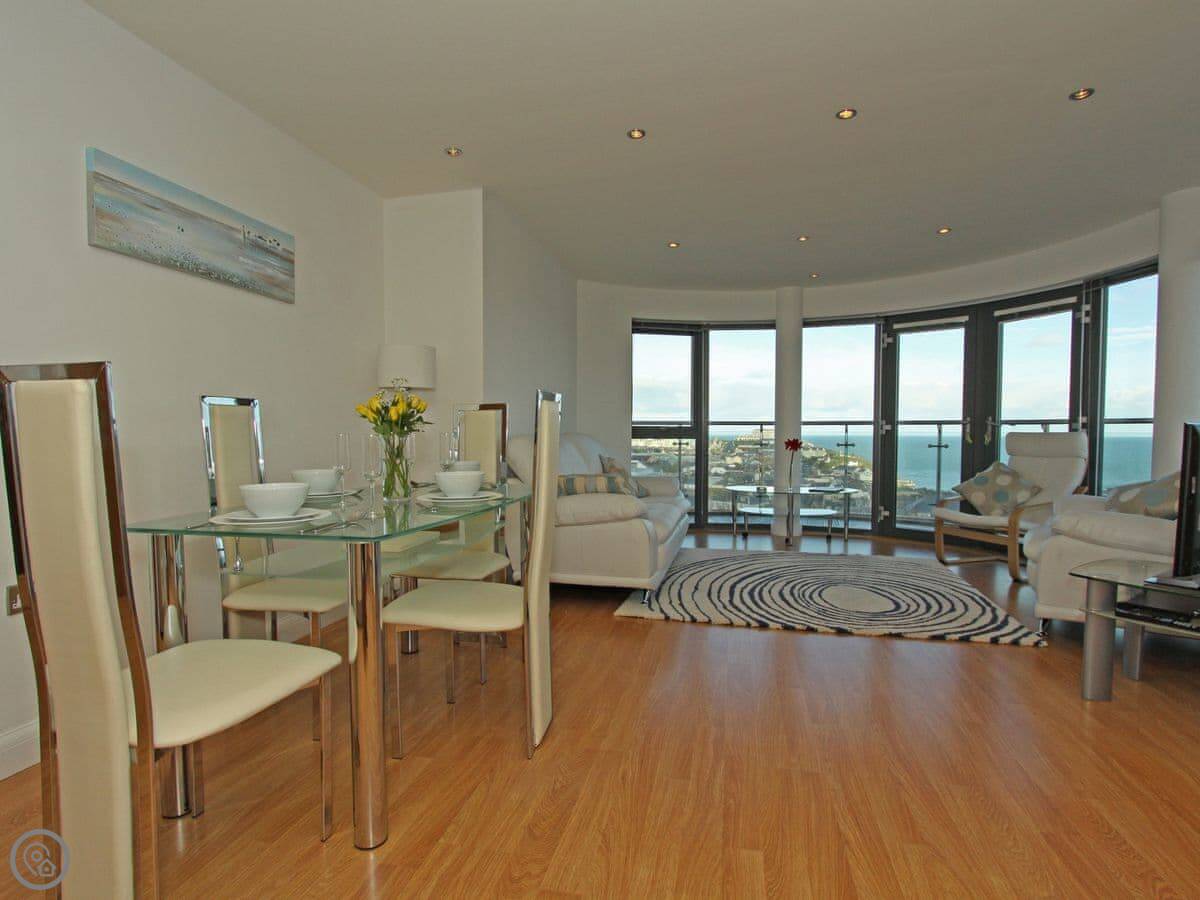 You're up on the hill, so it's a short walk down into the town centre. Takes about ten minutes. Fistral Beach and Towan Beach are about a fifteen-minute walk. The property has an allocated space in the underground car park.