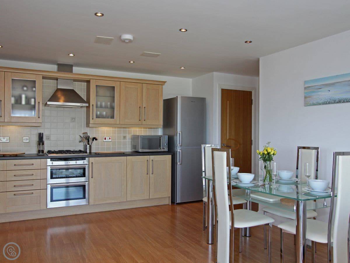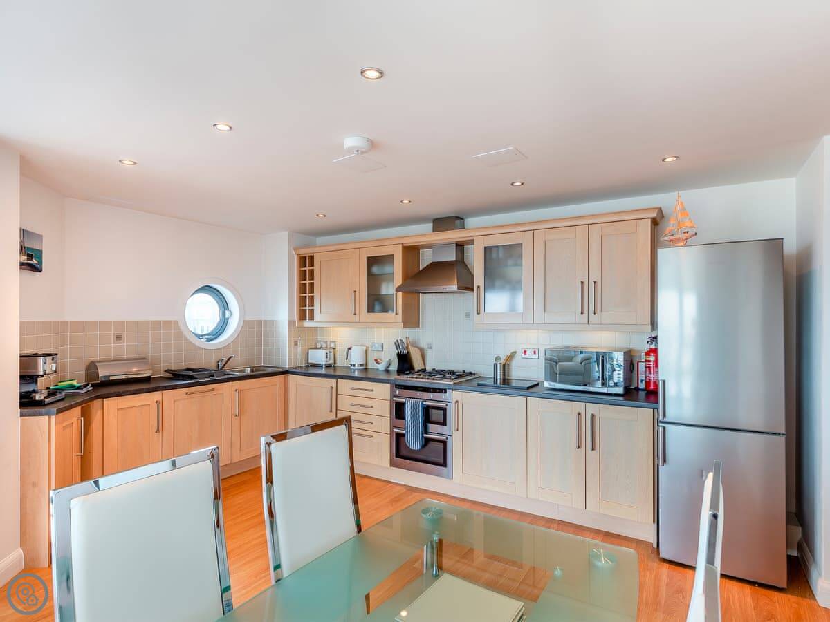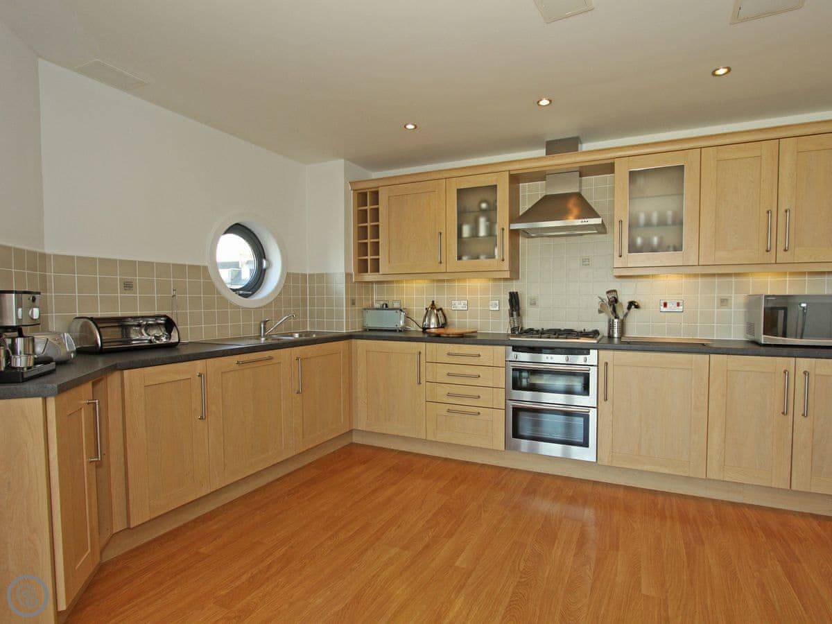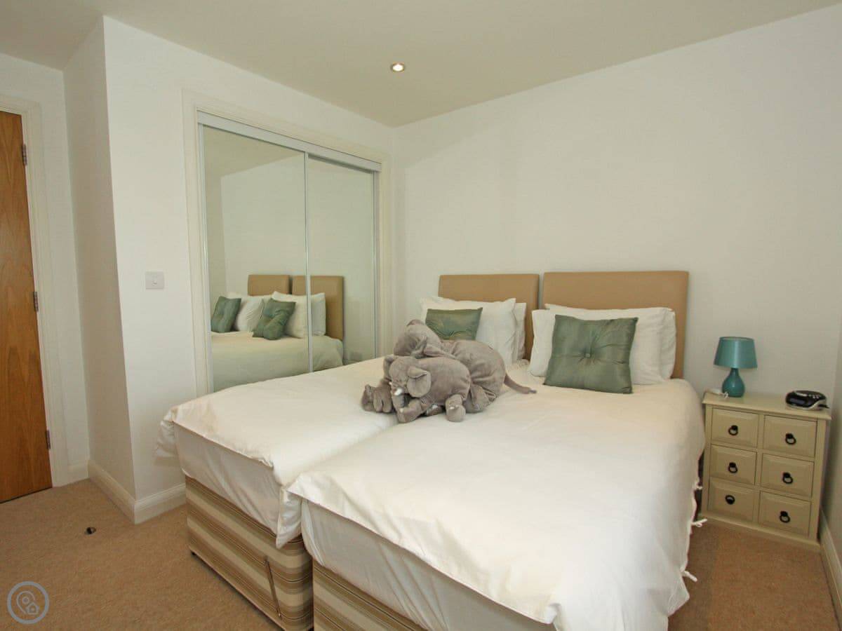 You're up on the hill, so it's a short walk down into the town centre. Takes about ten minutes. Fistral Beach and Towan Beach are about a fifteen-minute walk. The property has an allocated space in the underground car park.