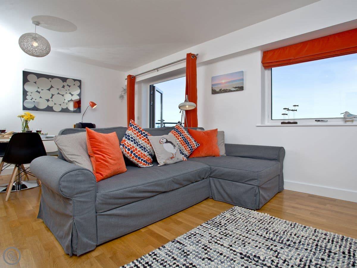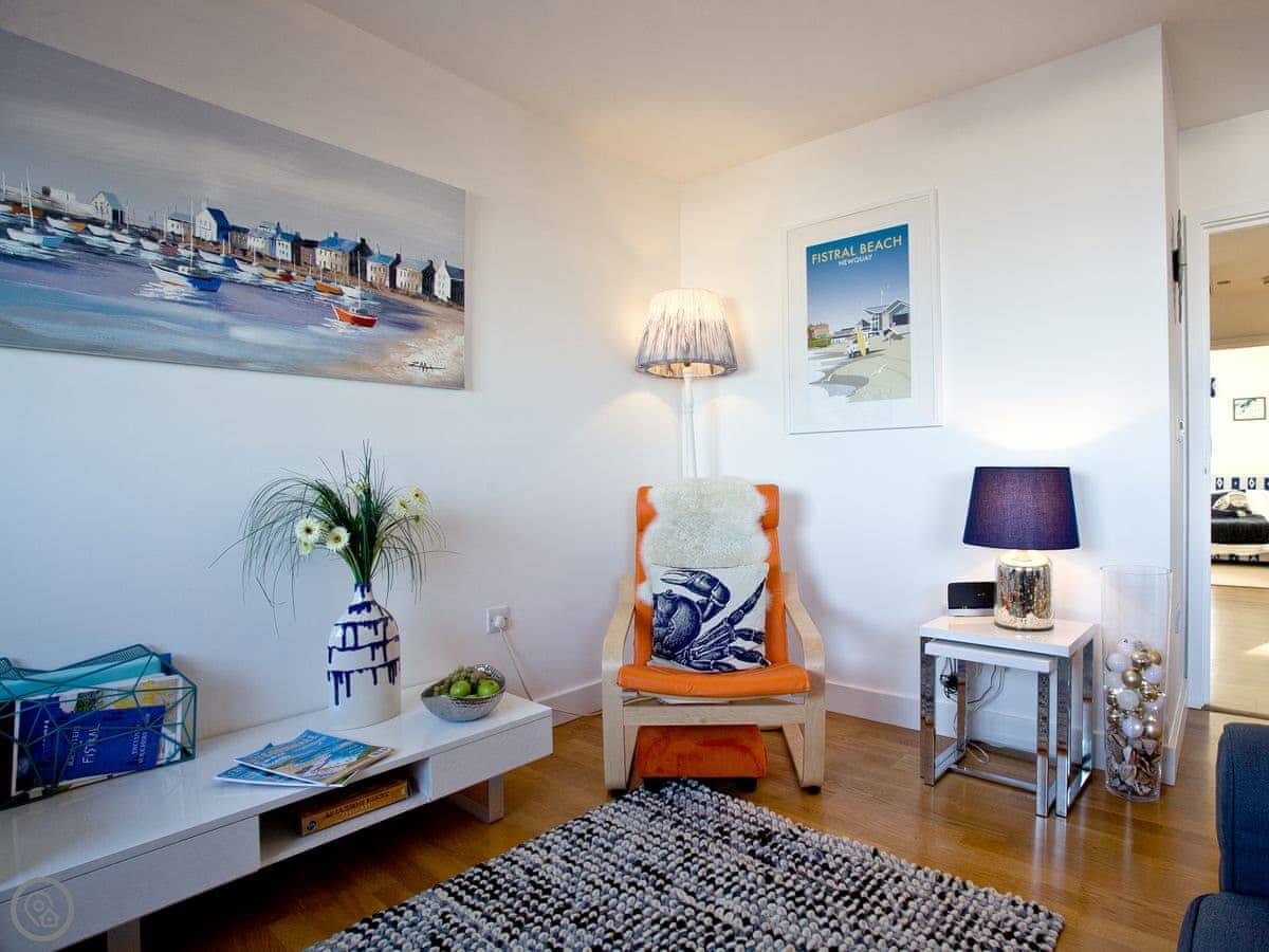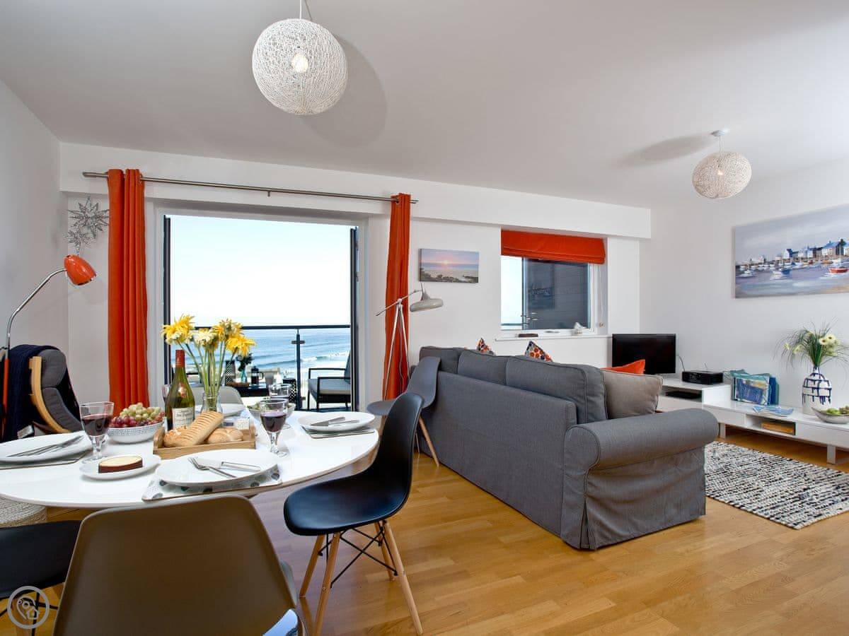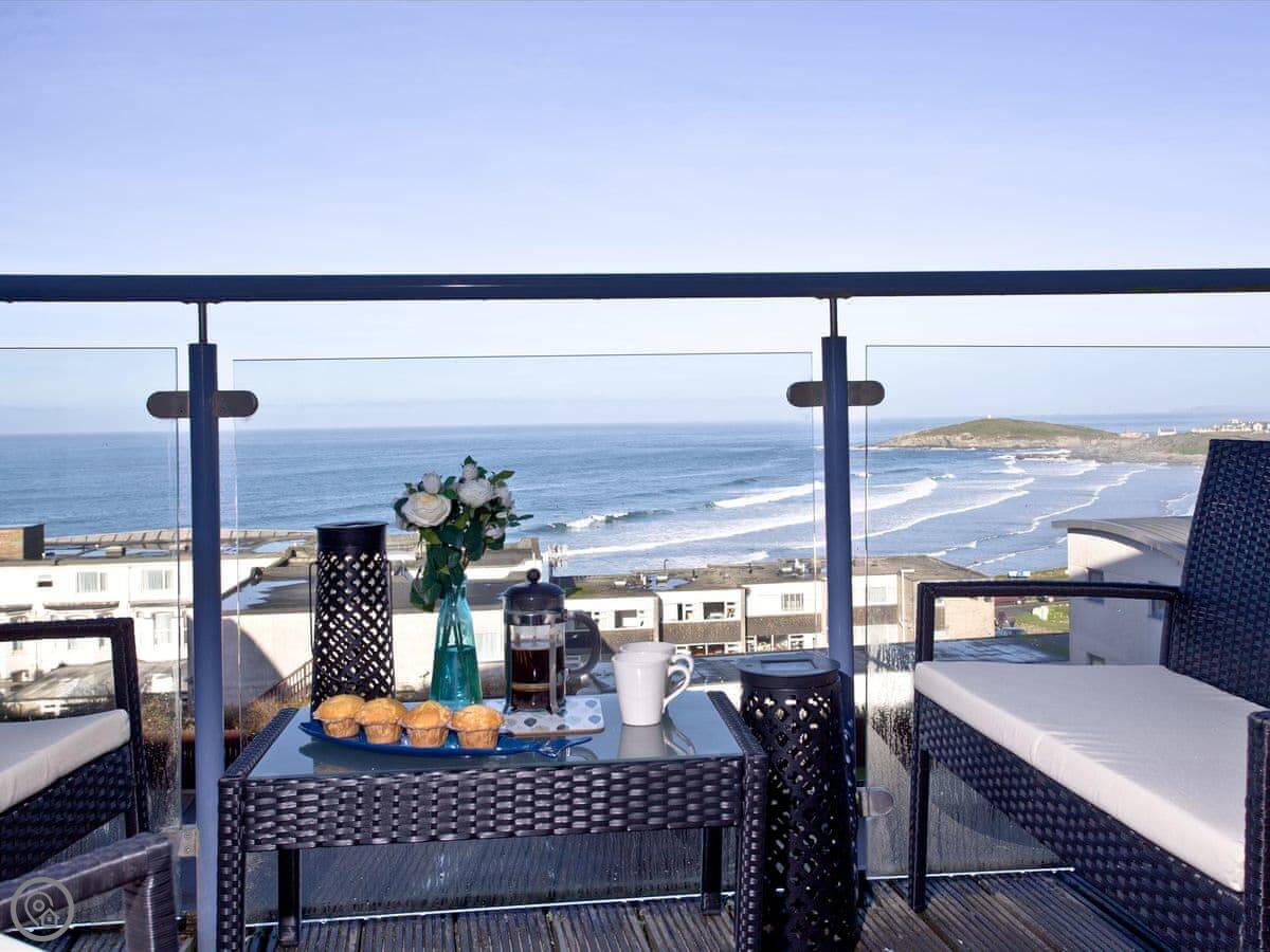 The main thing is the view. The living room opens onto a balcony that looks straight out over Fistral Beach. You can sit out there with a cup of tea. We leave some blankets for that.