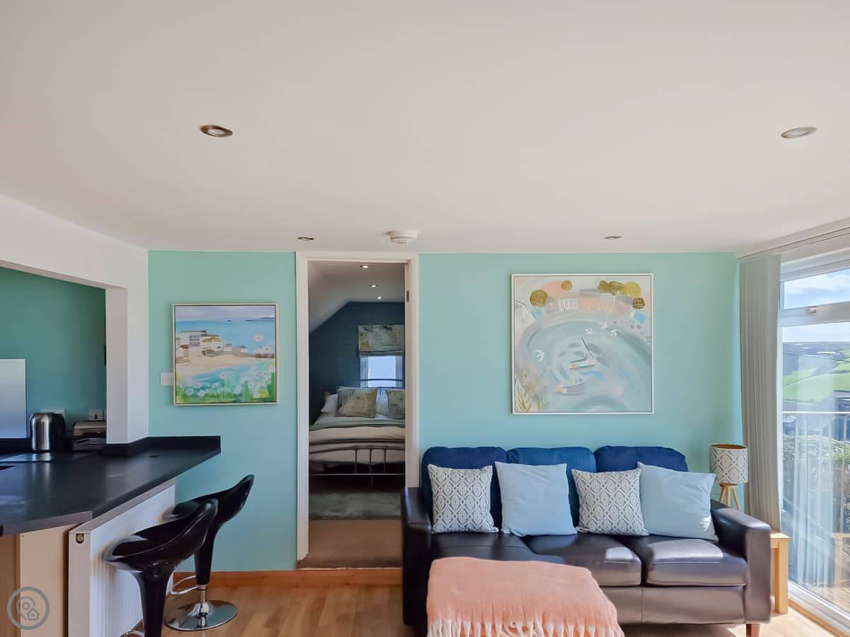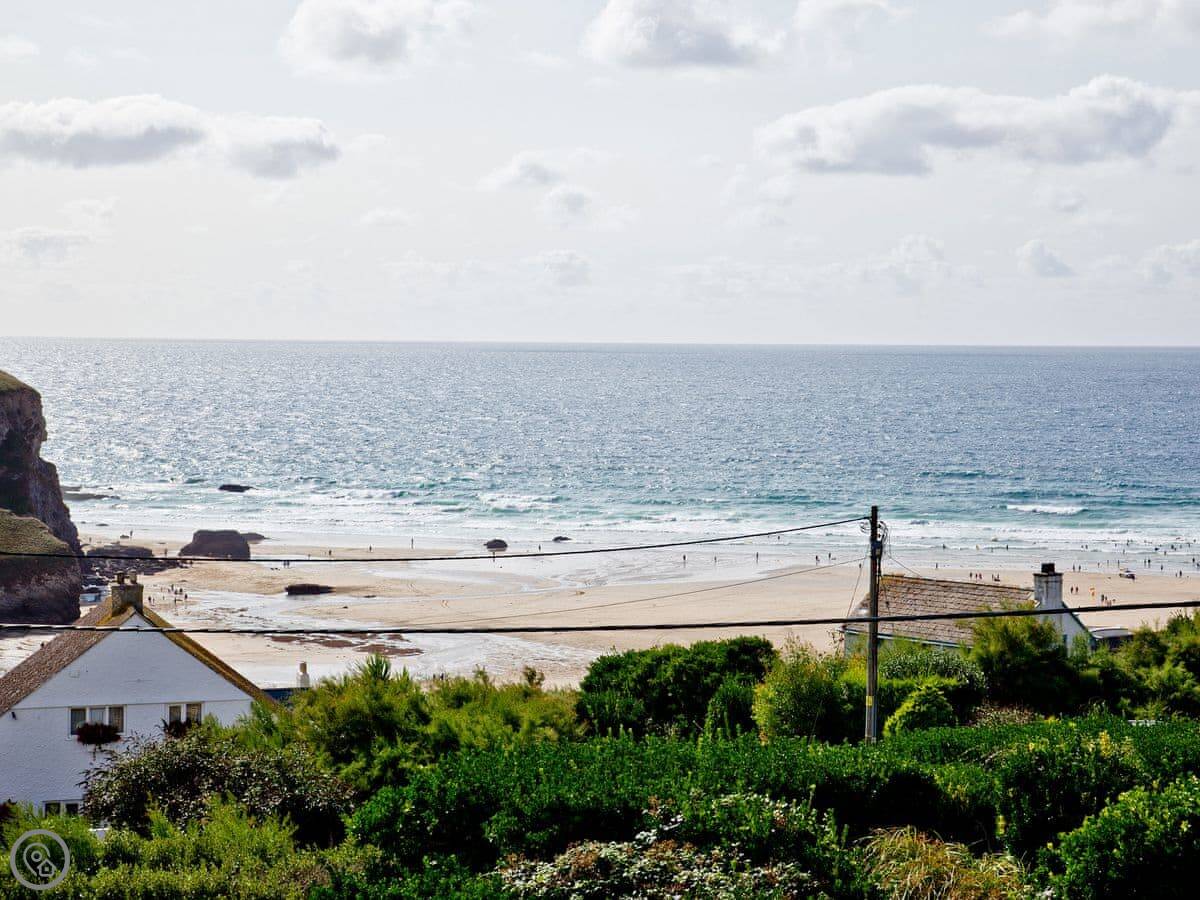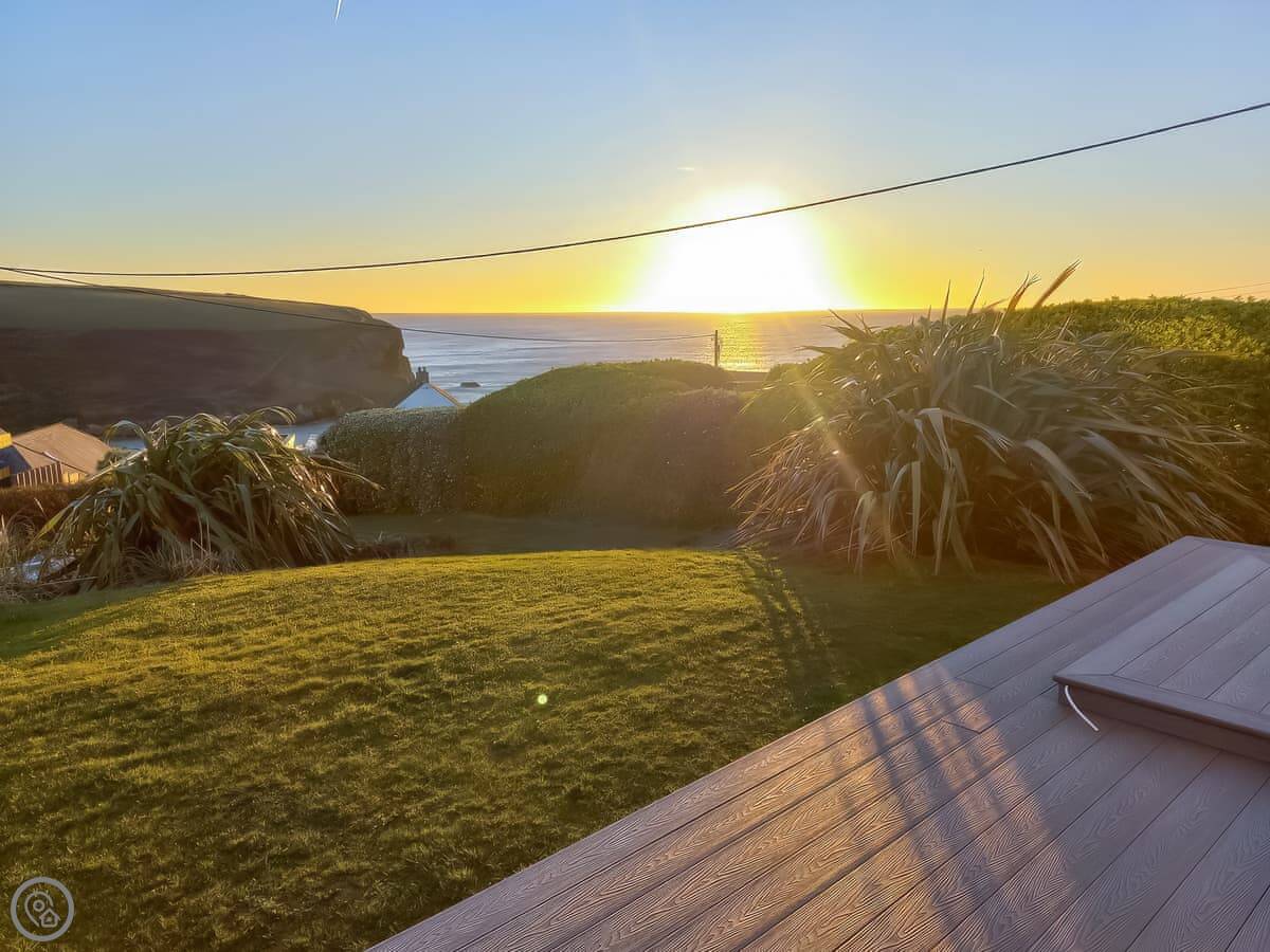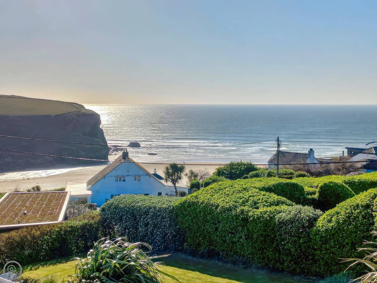 The main thing is the position. It’s right on the cliff above Mawgan Porth beach. The views from the garden and the upstairs flat are straight out to sea. It’s a short walk down to the sand, maybe five minutes. The coast path runs past the bottom of the garden.