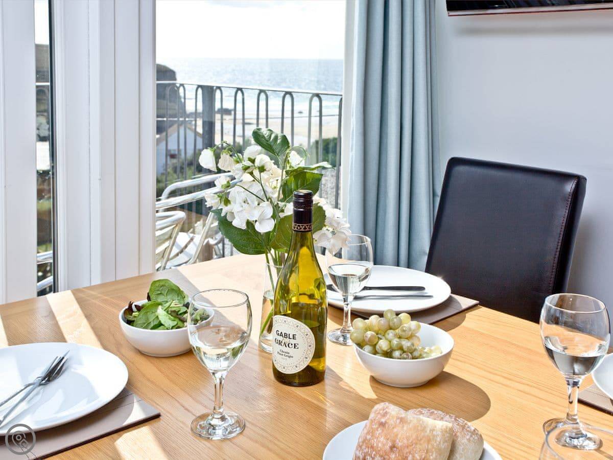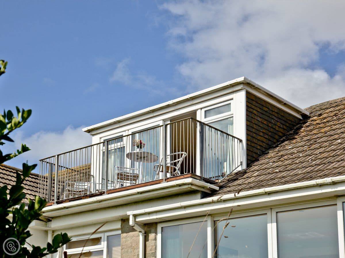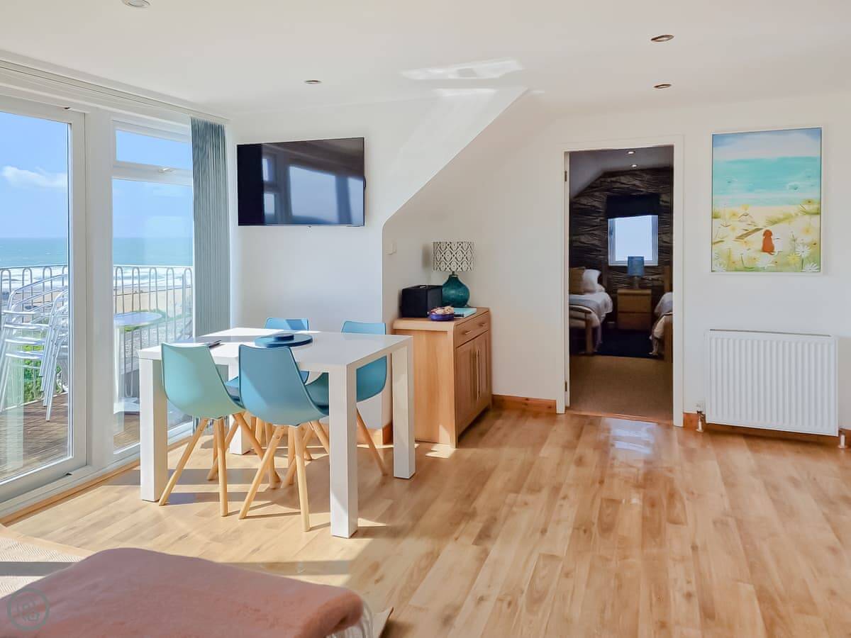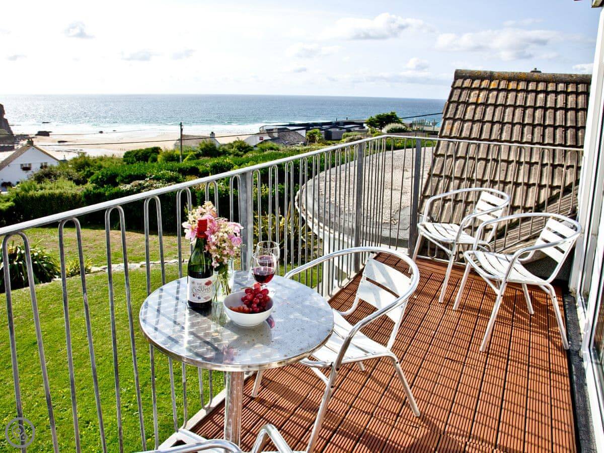 The main thing is the position. It’s right on the cliff above Mawgan Porth beach. The views from the garden and the upstairs flat are straight out to sea. It’s a short walk down to the sand, maybe five minutes. The coast path runs past the bottom of the garden.