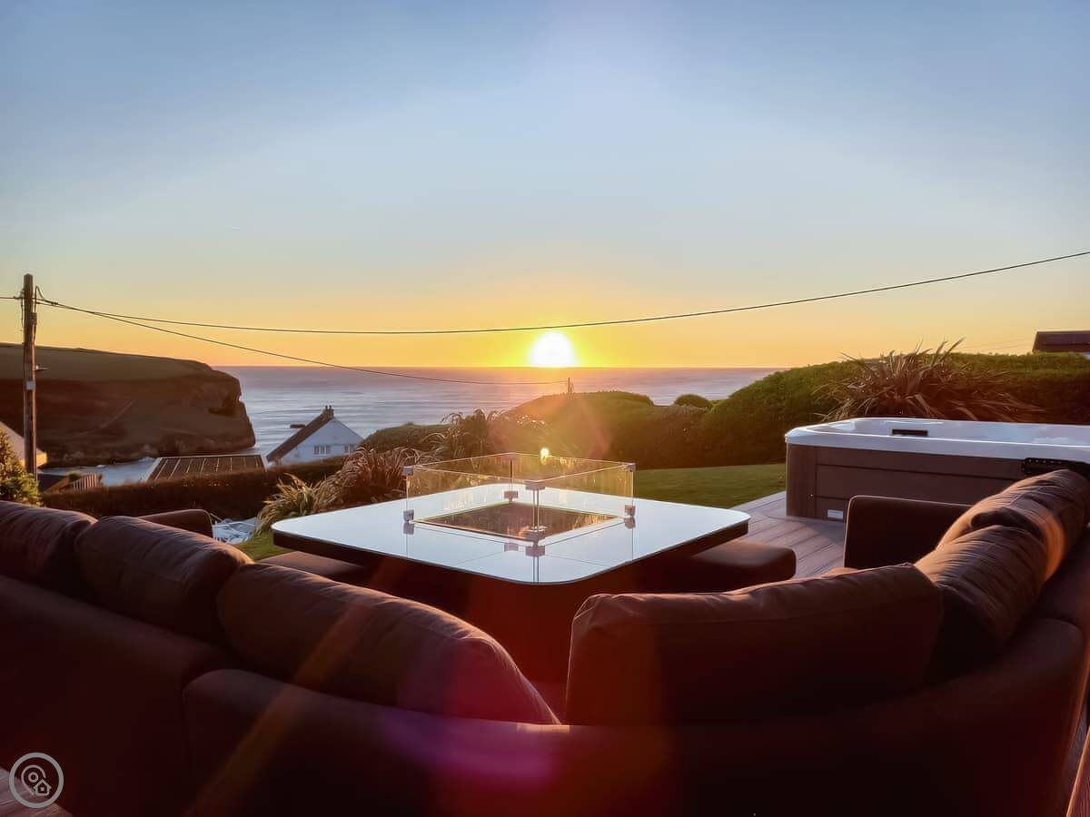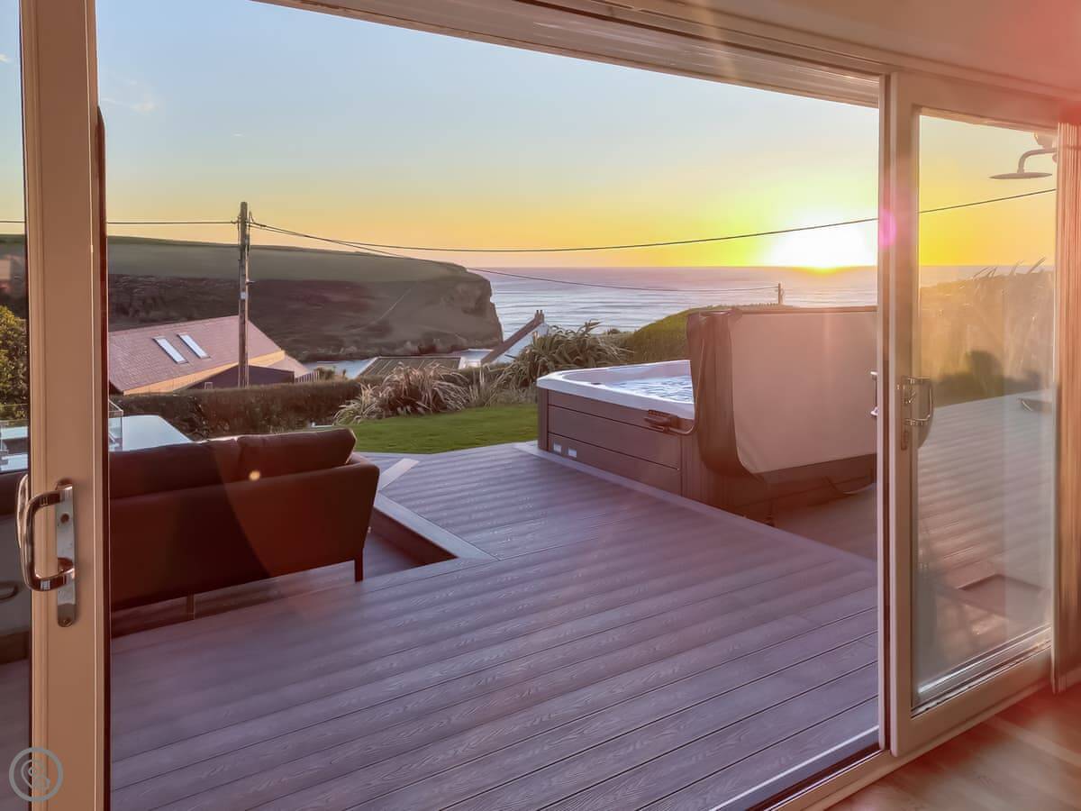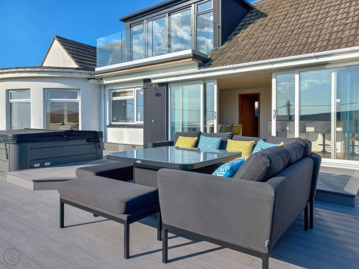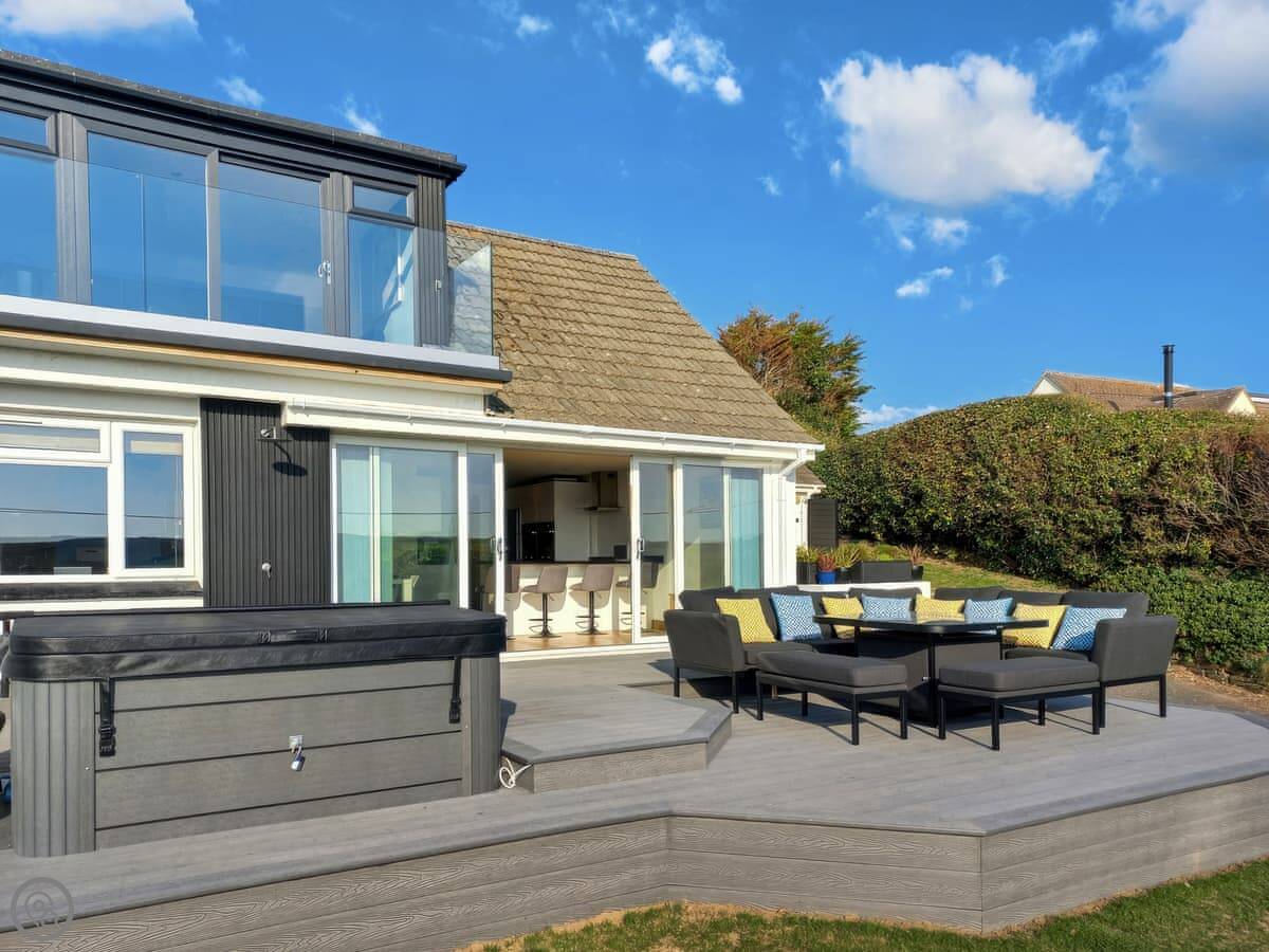 Outside, there’s a big decked area with a dining table, sofas, a barbecue and a hot tub. There’s also a warm outdoor shower which is handy after the beach. The garden is south facing, so you get the sun.