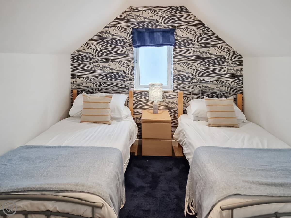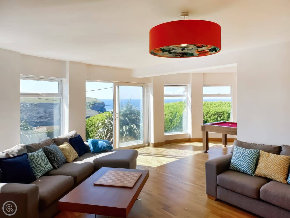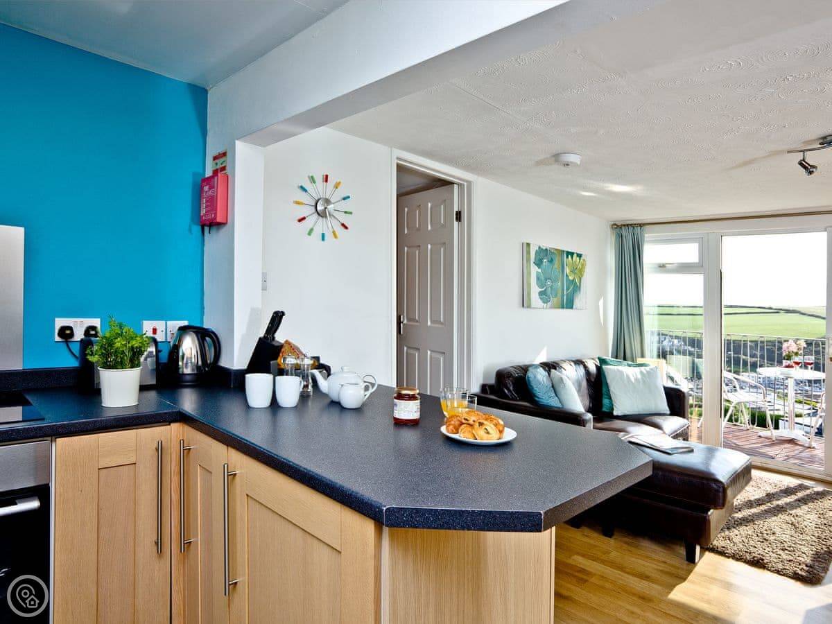 This is Ocean View in Mawgan Porth. It’s a big place for a group, sleeps twelve with six bedrooms. It’s actually two places joined together, a four-bedroom house on the ground floor and a separate two-bed flat upstairs. They’re connected inside but each has its own kitchen and living space, so it works well for a few families together.